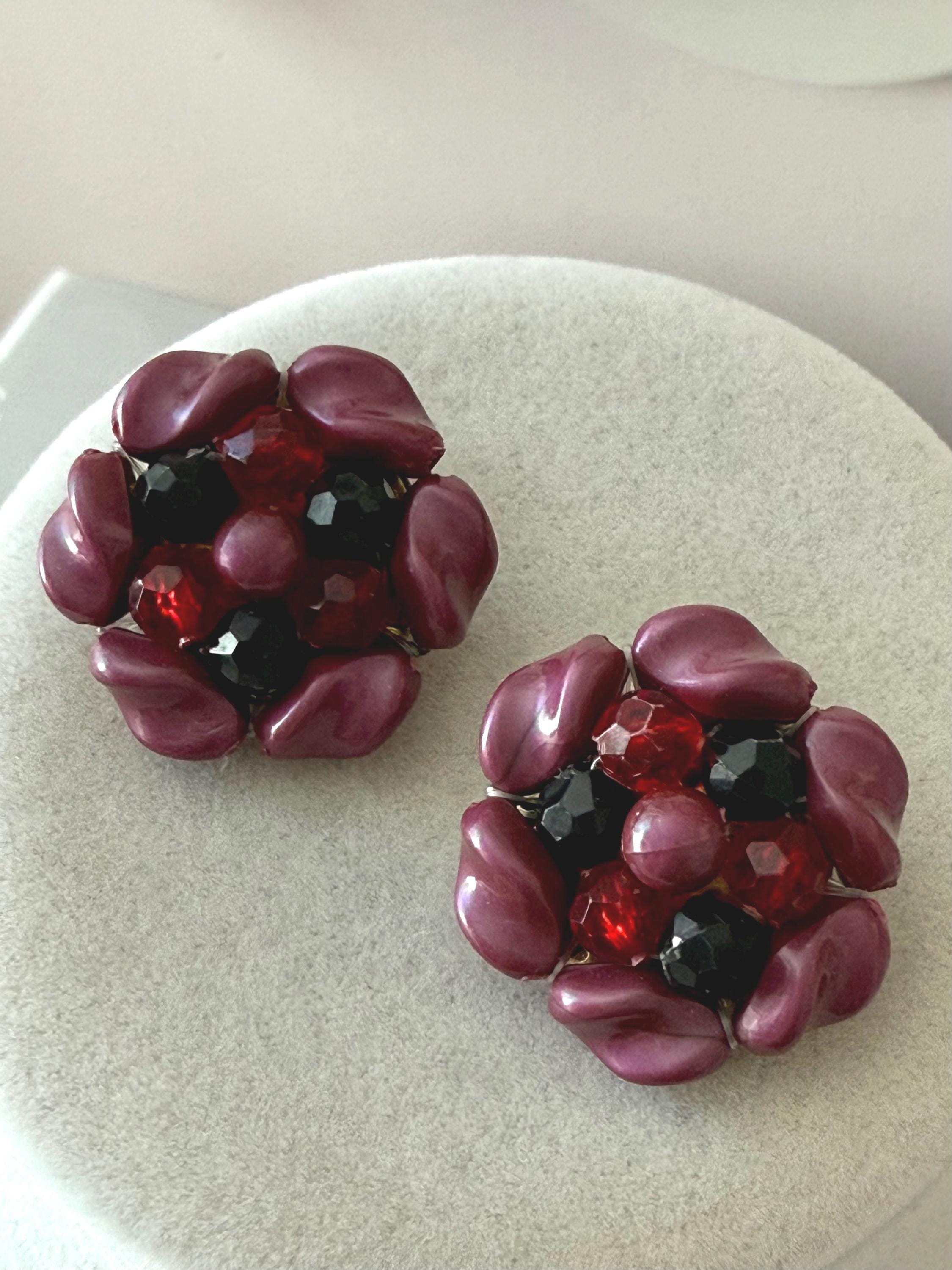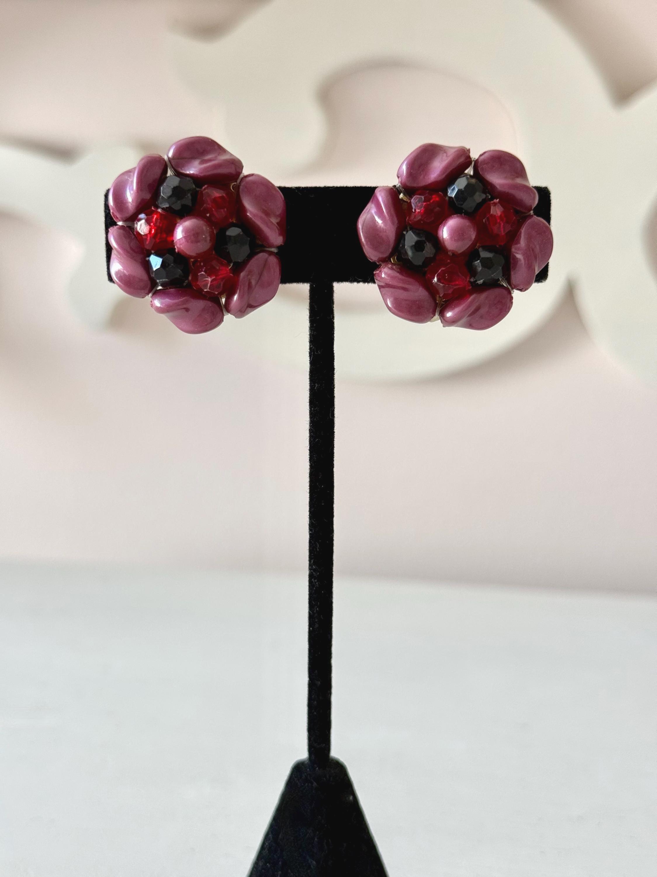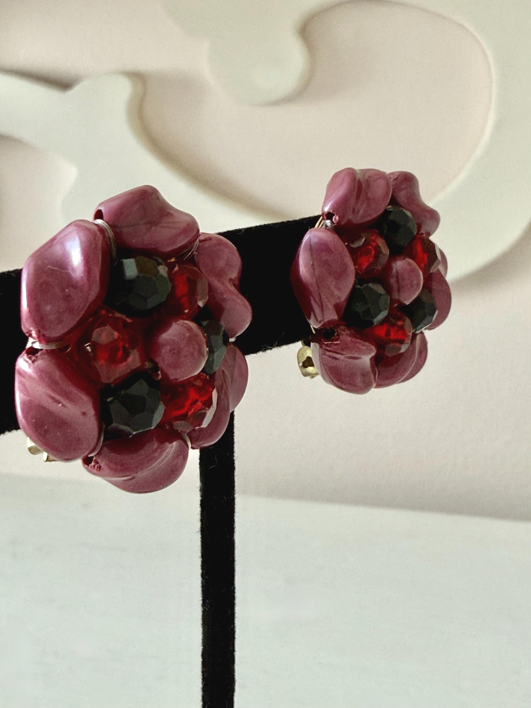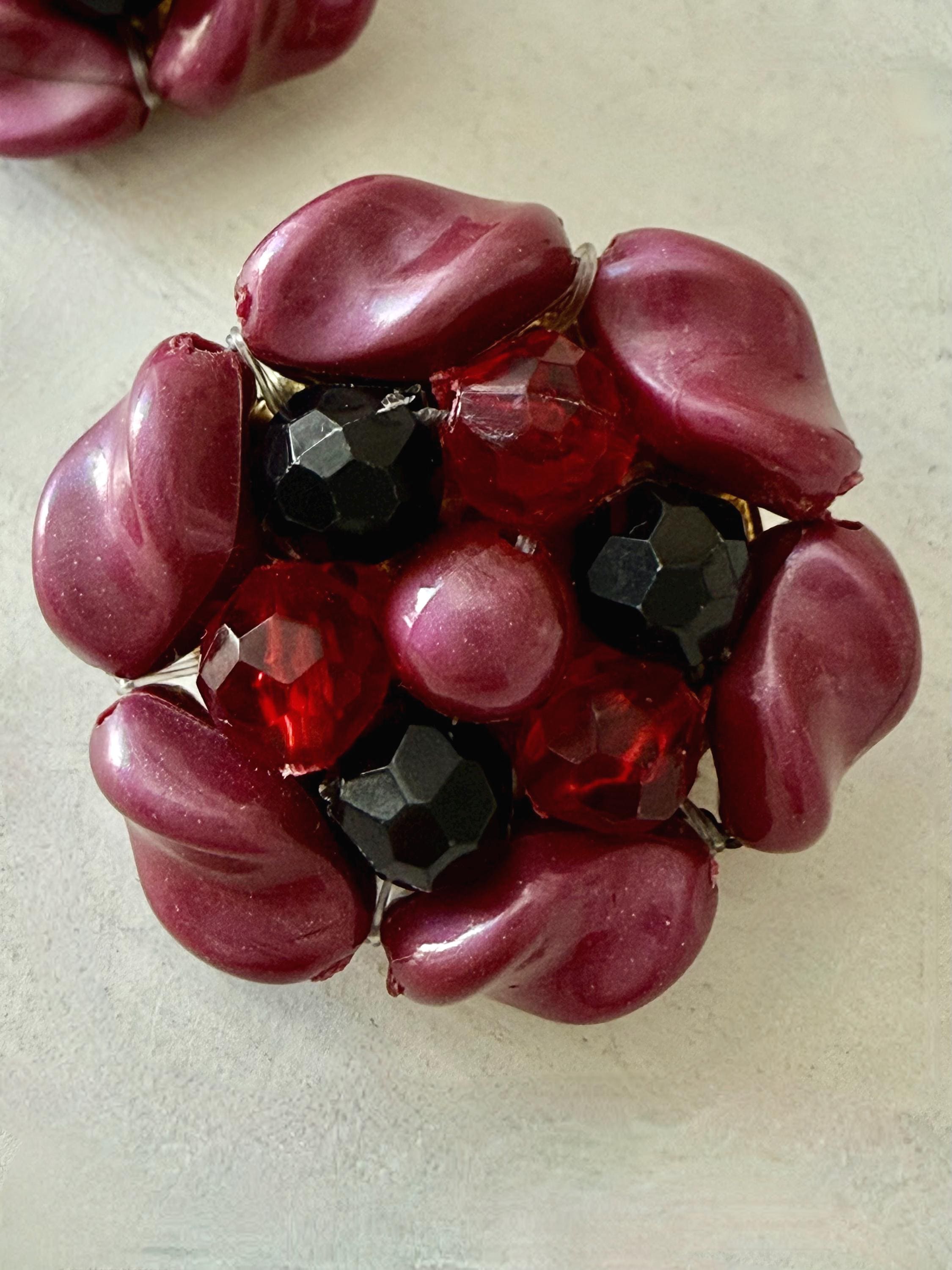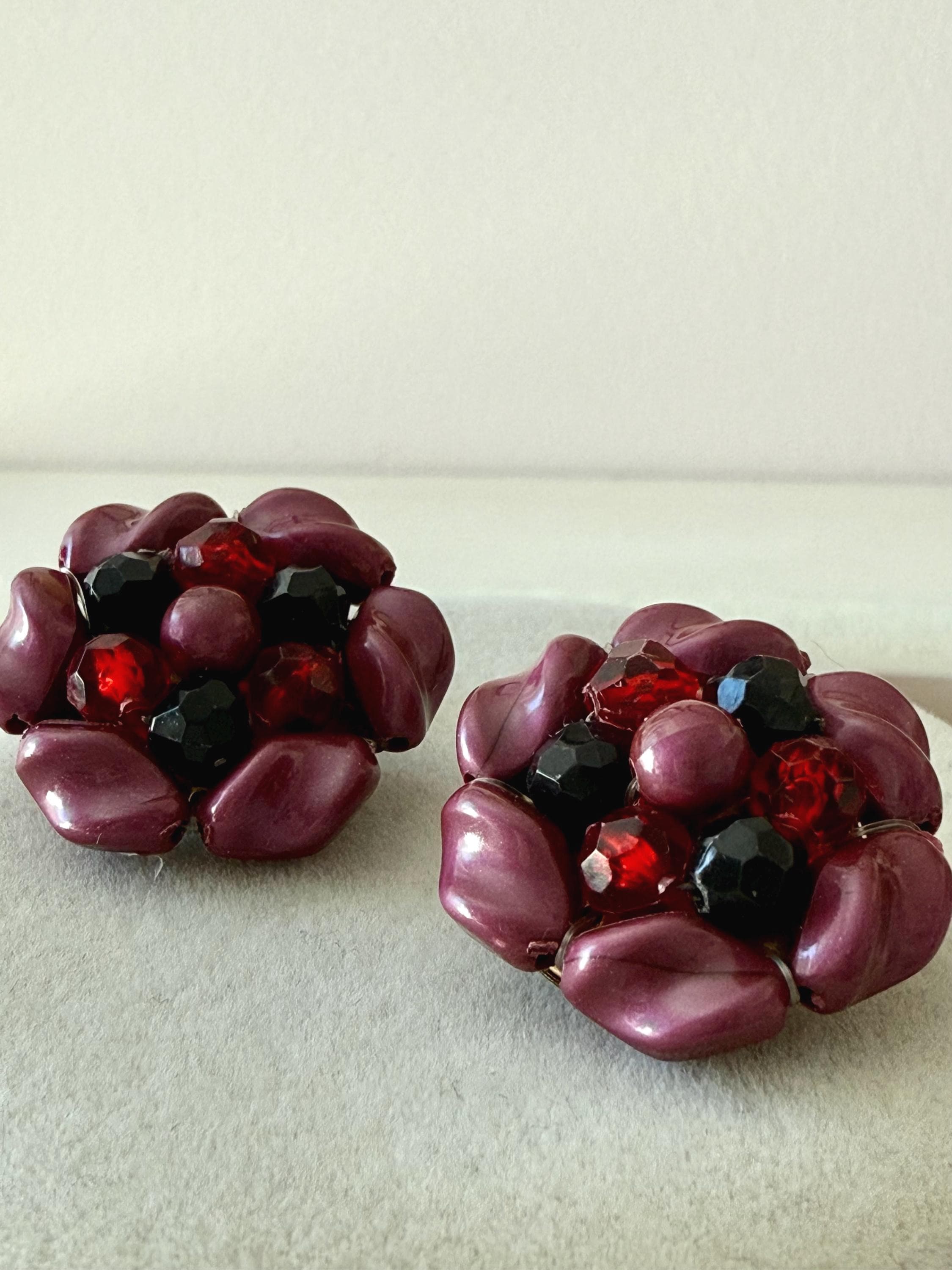 This listing is for a very pretty pair of vintage earrings from West Germany. Measuring 1" in diameter, the clip on earrings are a cluster of acrylic beads in terrific coordinating colors of purple, red, and black. All beads are intact, the clip backs are secure and comfortable, and they are in very good condition. The combination of colors is so unique and really sets these apart!