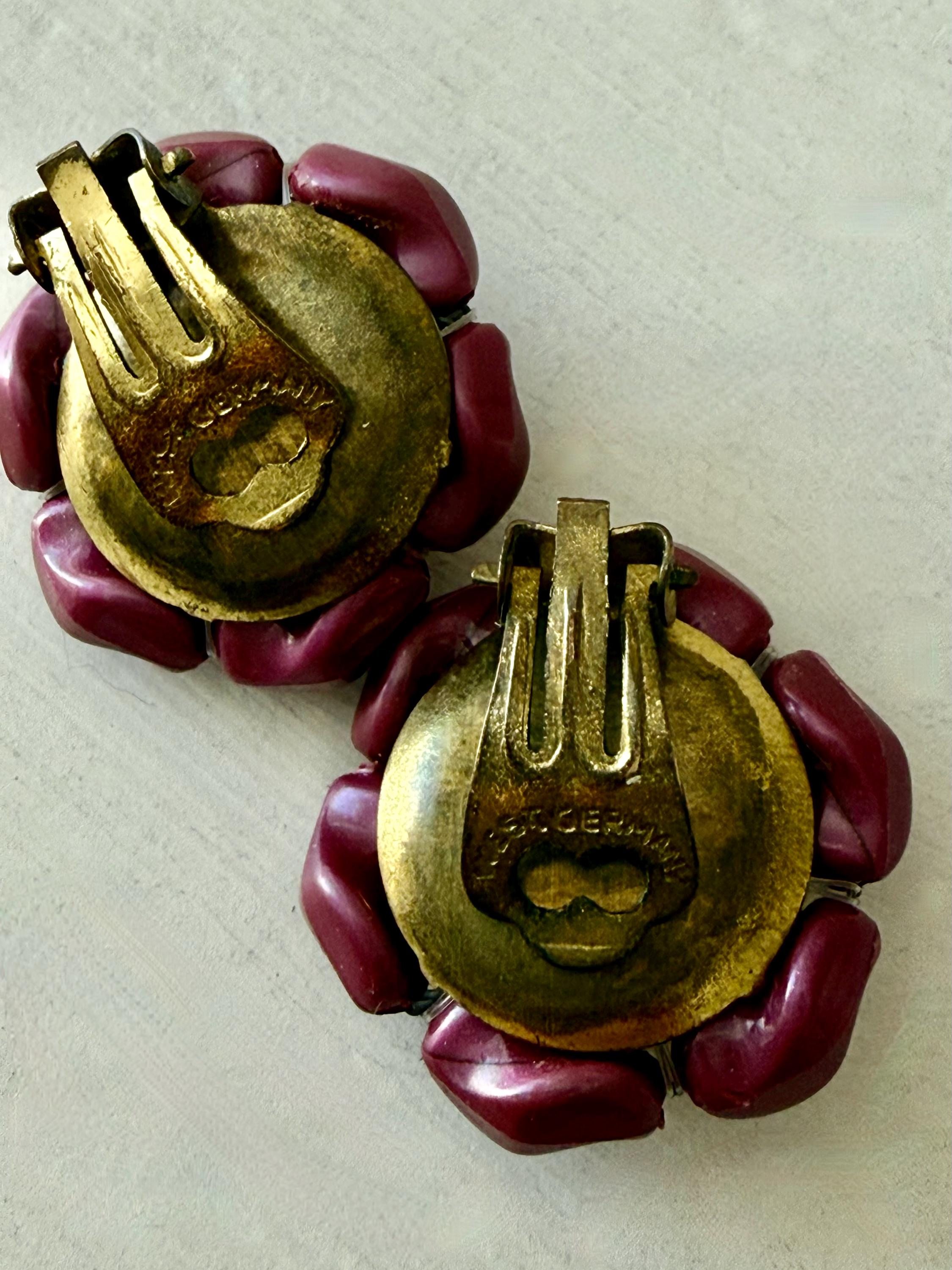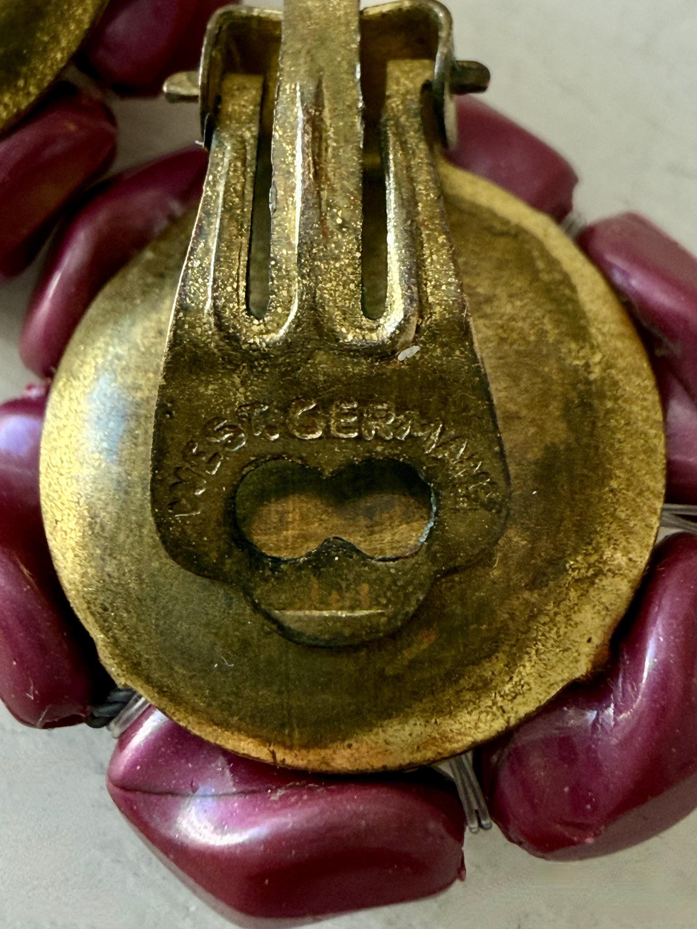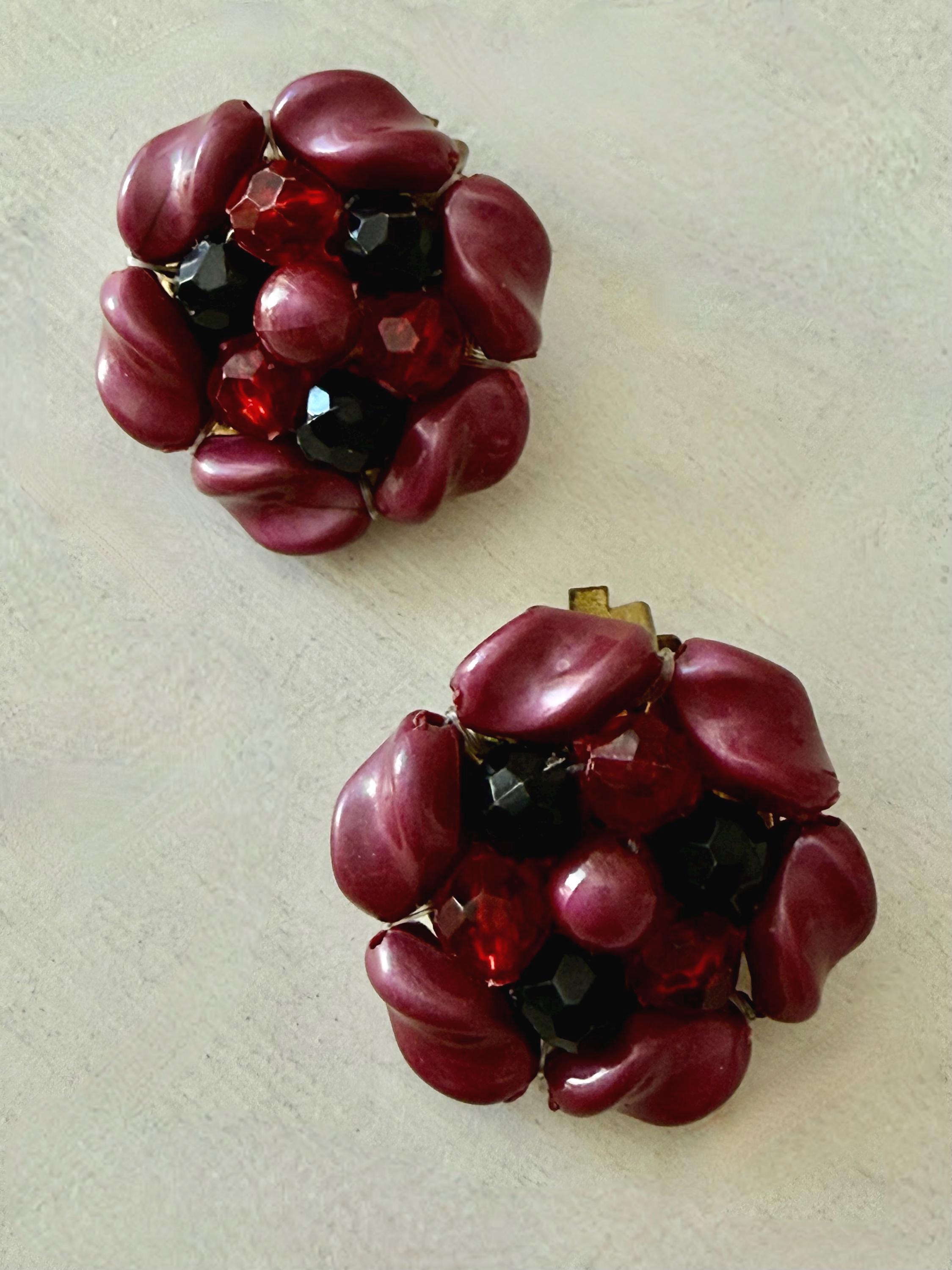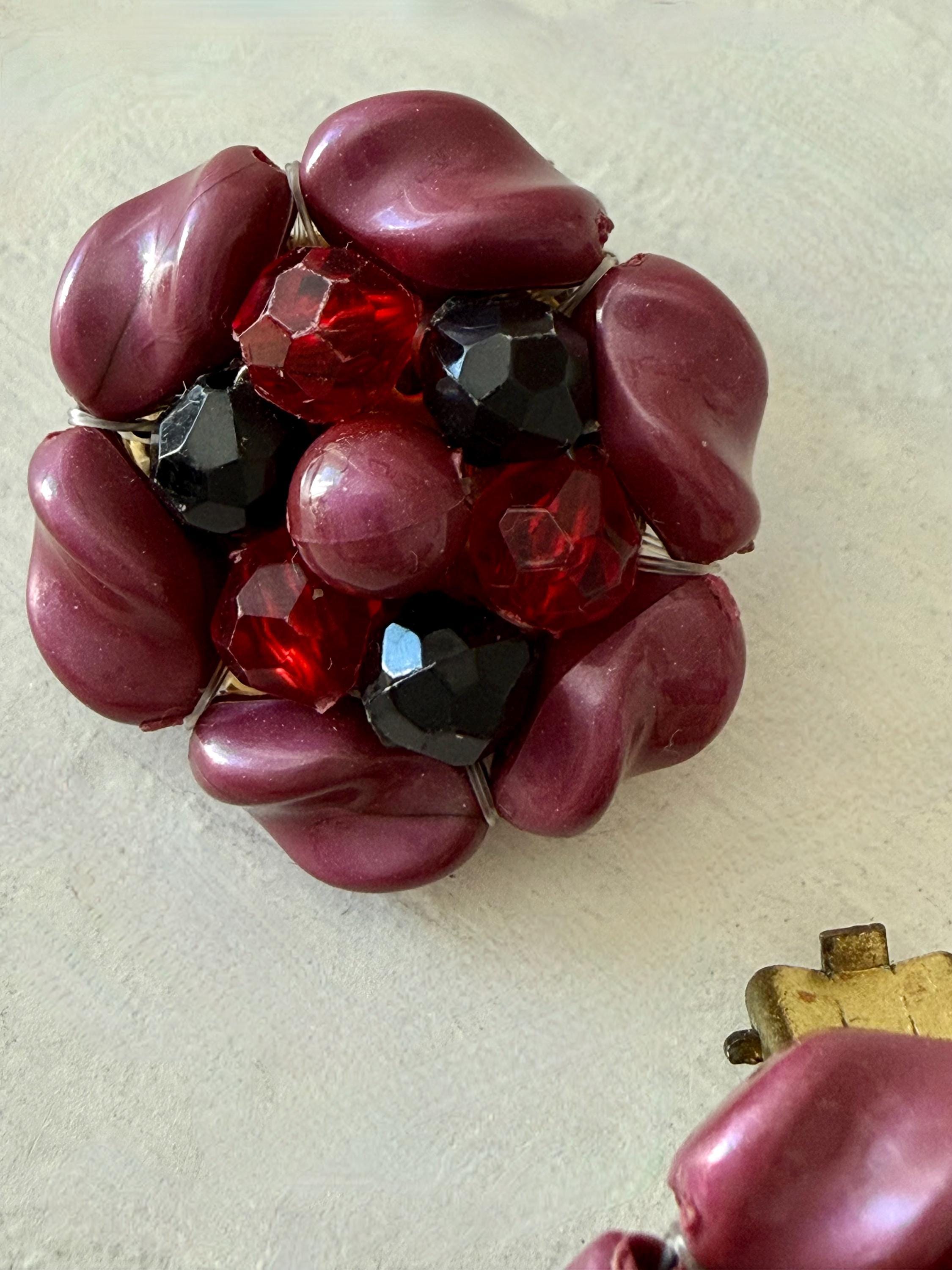 This listing is for a very pretty pair of vintage earrings from West Germany. Measuring 1" in diameter, the clip on earrings are a cluster of acrylic beads in terrific coordinating colors of purple, red, and black. All beads are intact, the clip backs are secure and comfortable, and they are in very good condition. The combination of colors is so unique and really sets these apart!