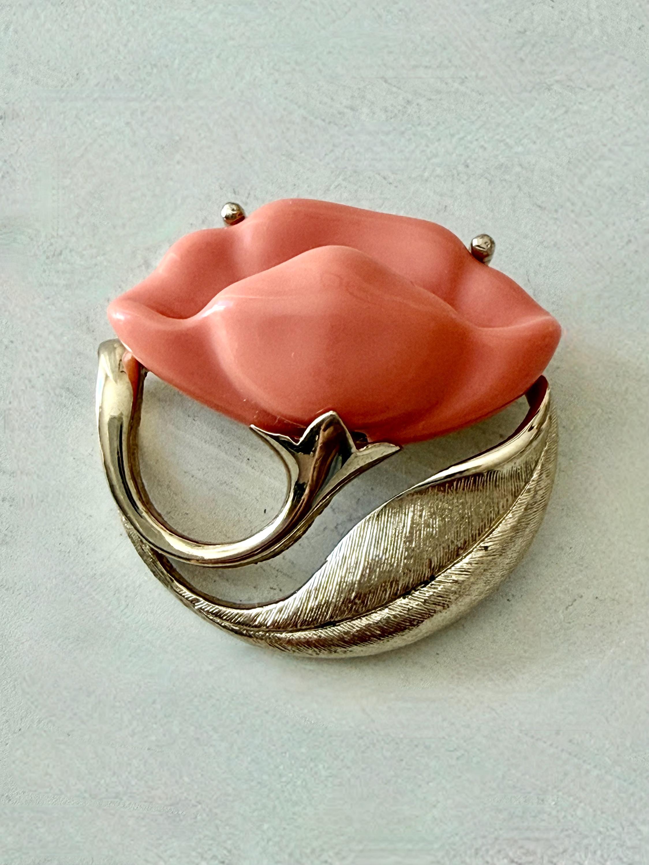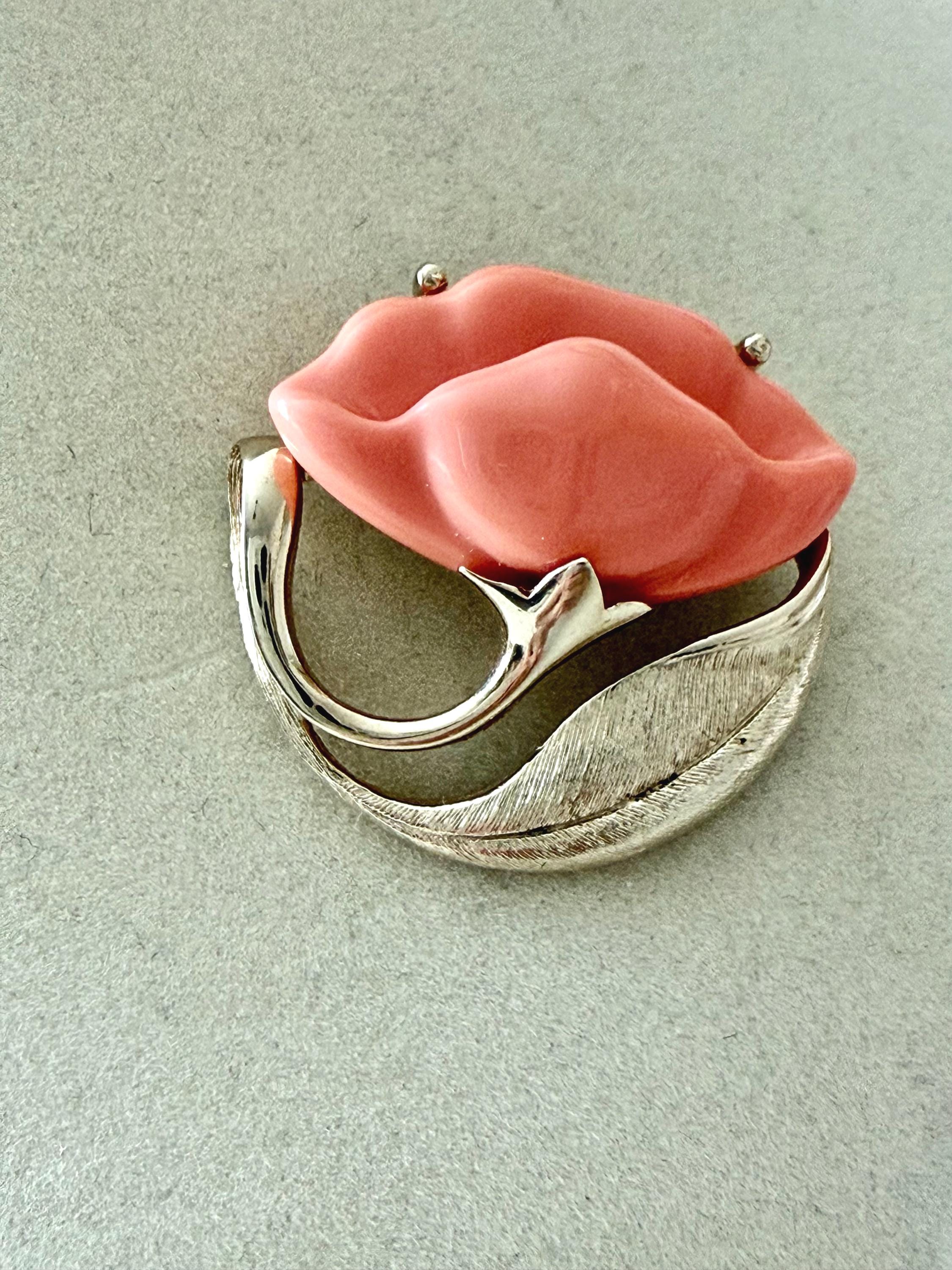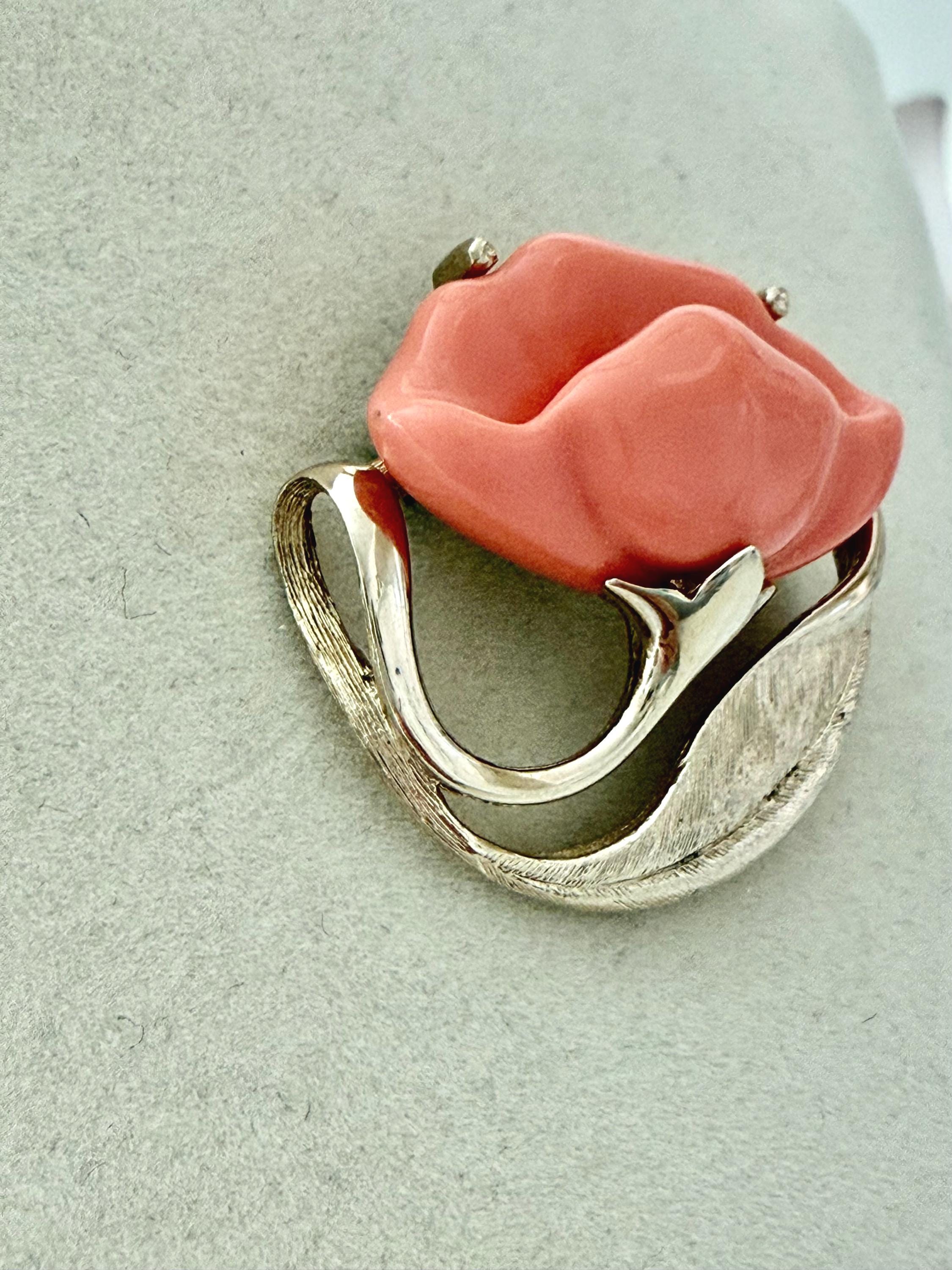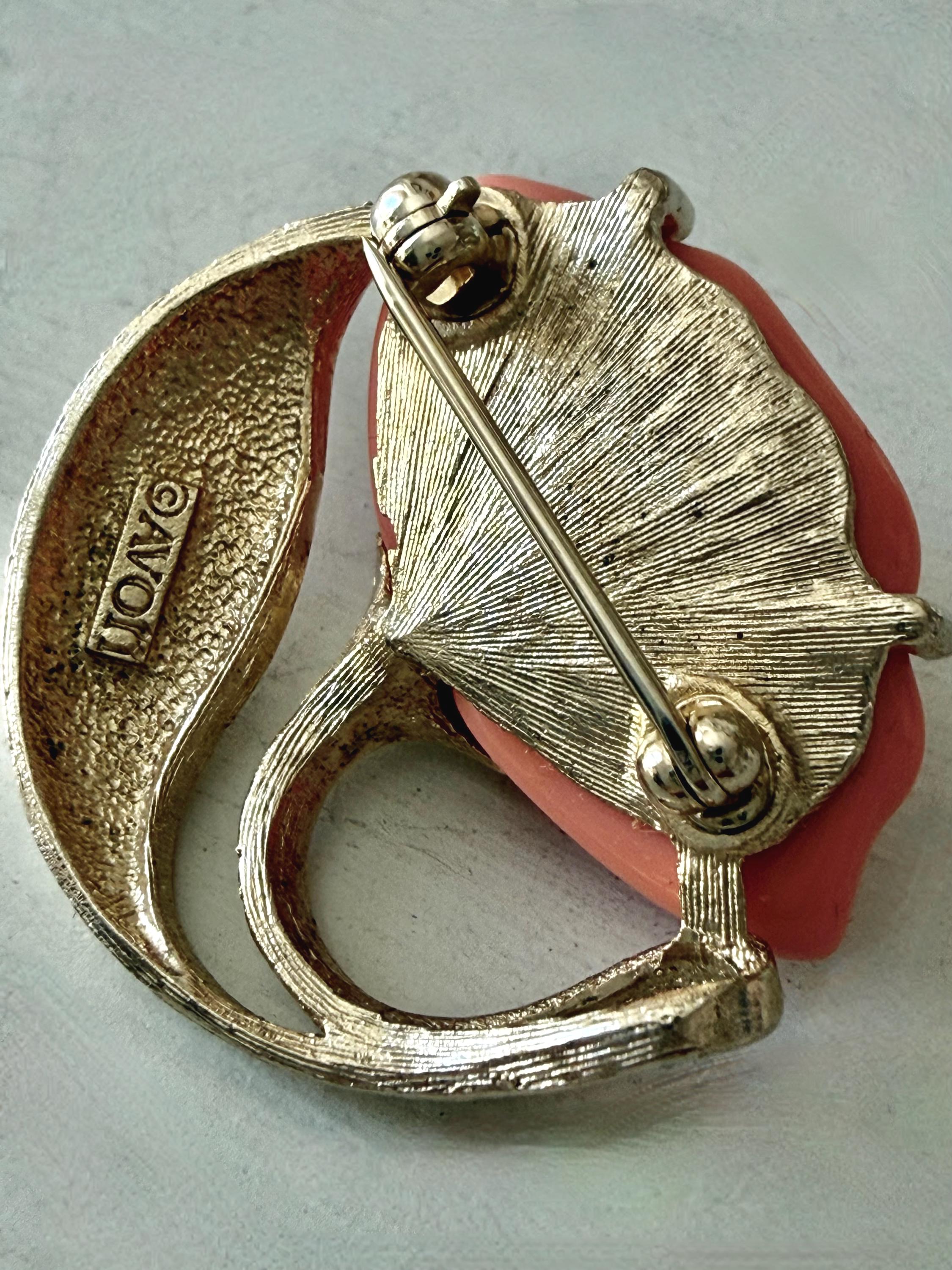 This listing is for a lovely vintage brooch by Avon. Measuring just 1 1/8" in diameter, it is petite in size but the simple, elegant design and the creamy, coral acrylic flower make this a standout. The clasp is secure and it is in excellent condition.