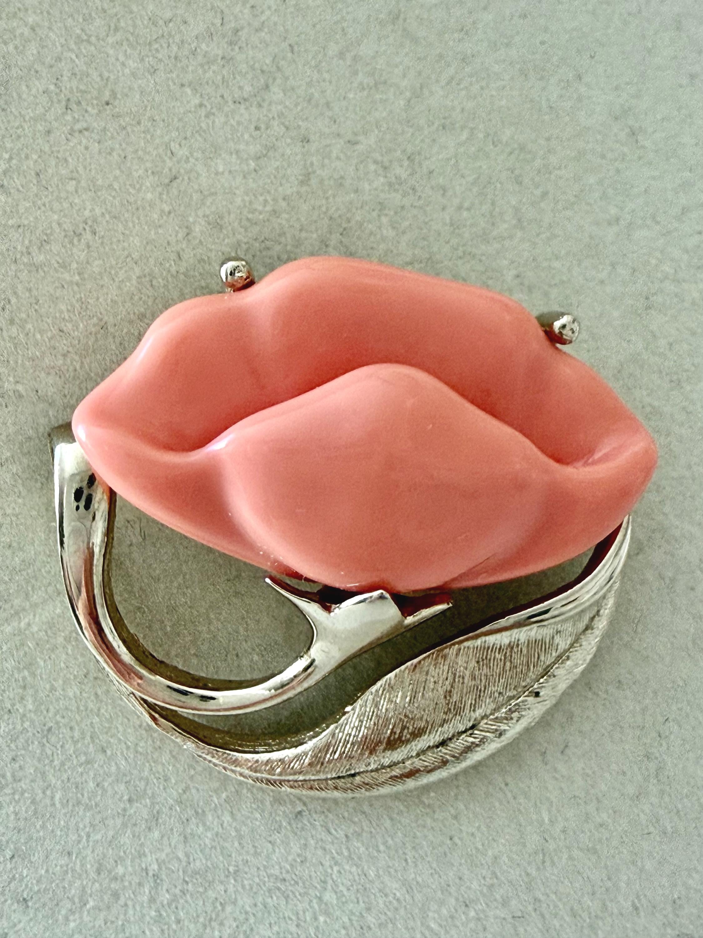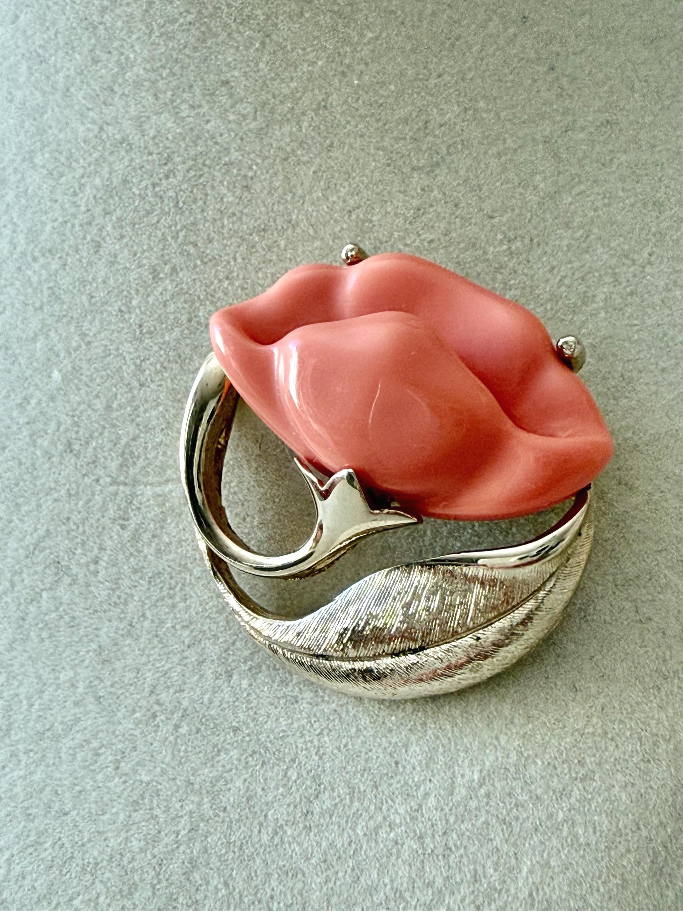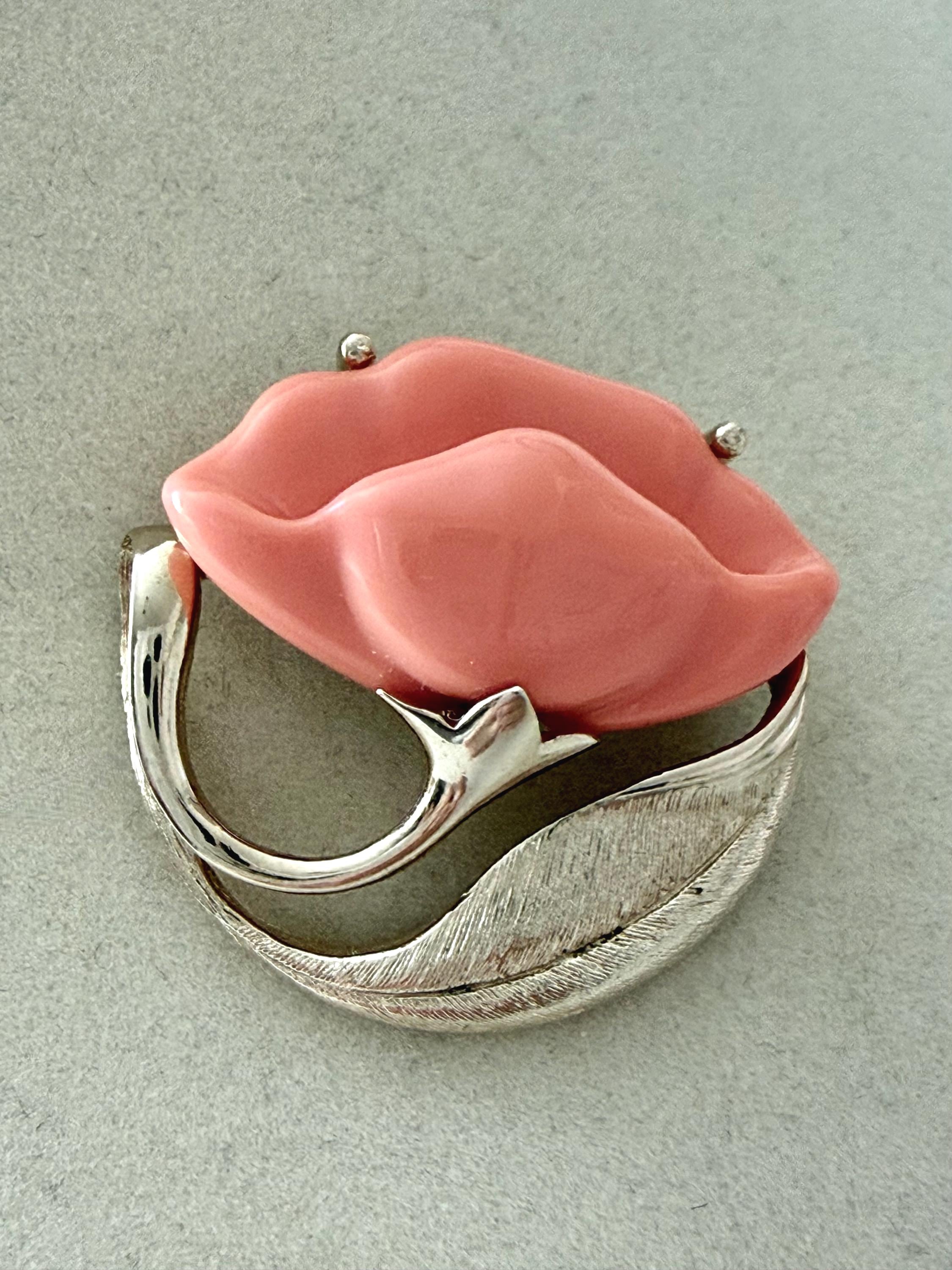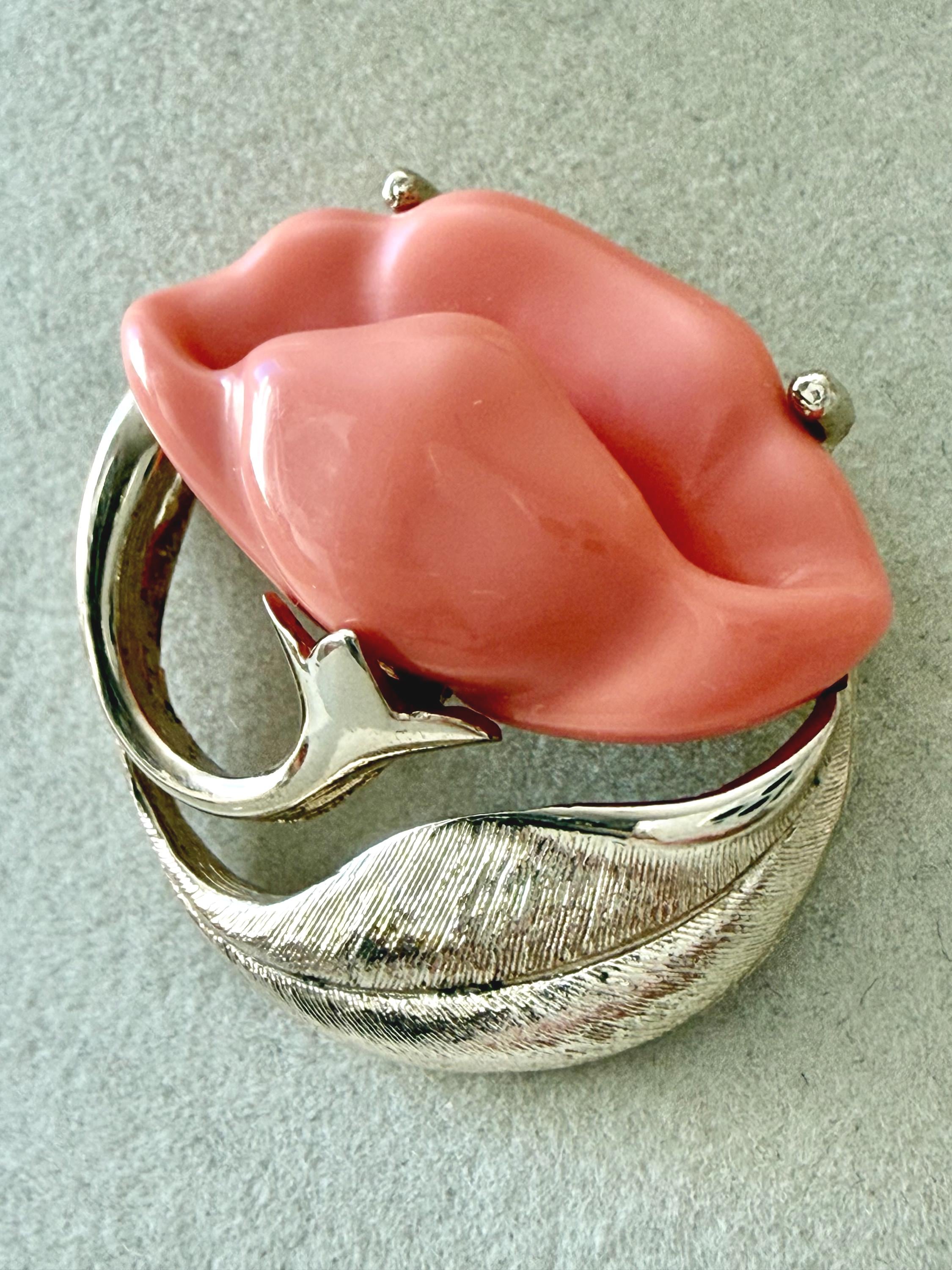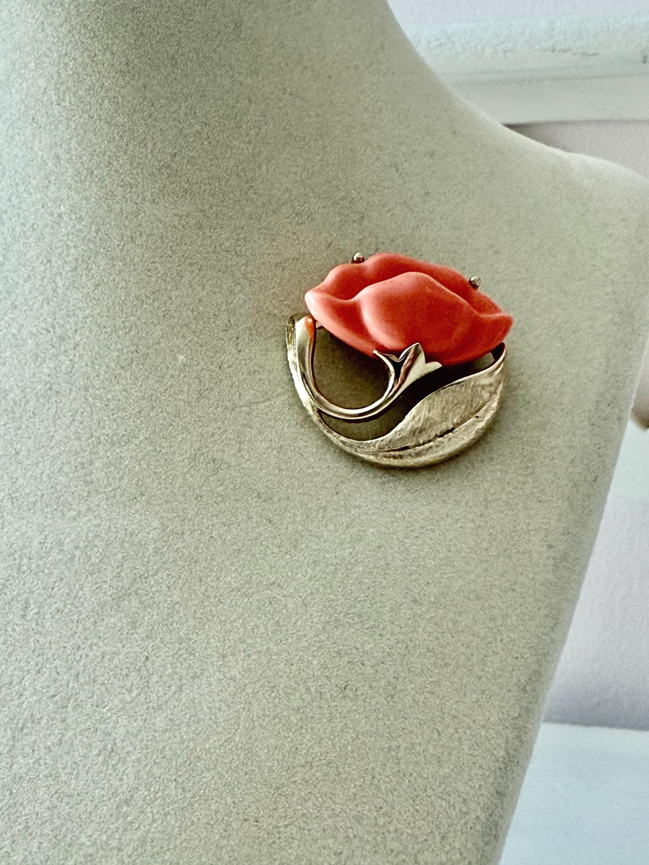 This listing is for a lovely vintage brooch by Avon. Measuring just 1 1/8" in diameter, it is petite in size but the simple, elegant design and the creamy, coral acrylic flower make this a standout. The clasp is secure and it is in excellent condition.