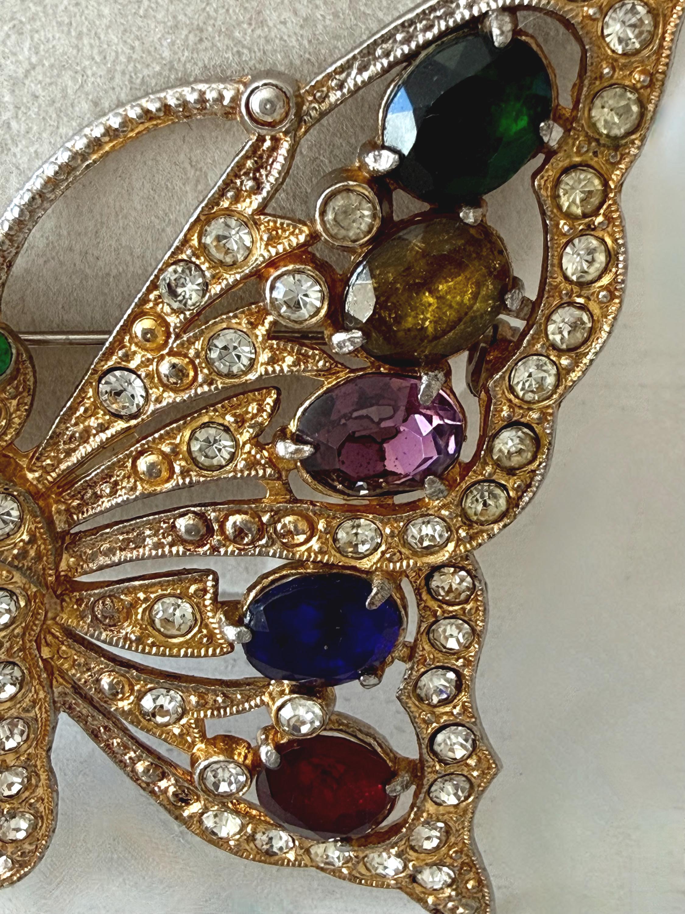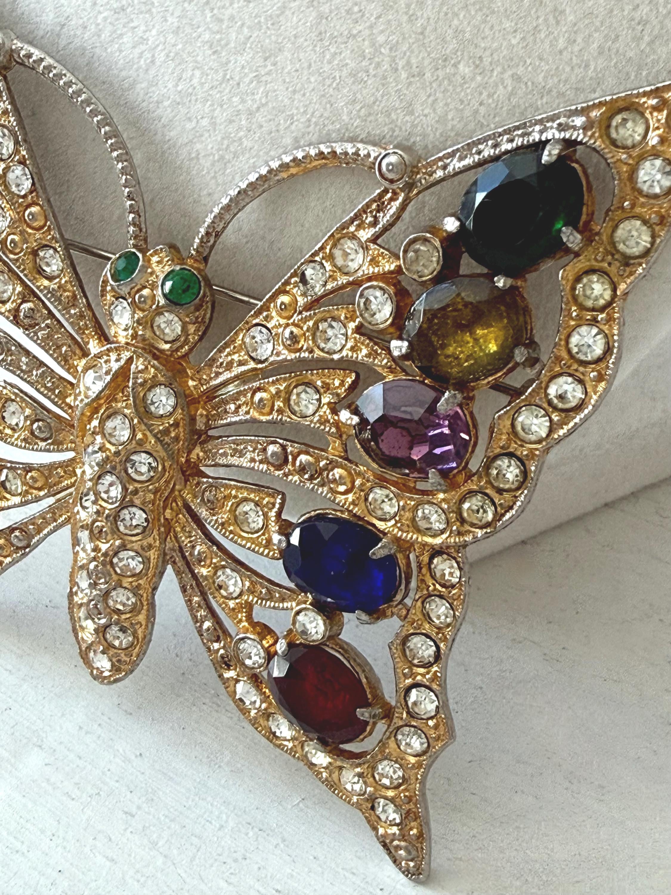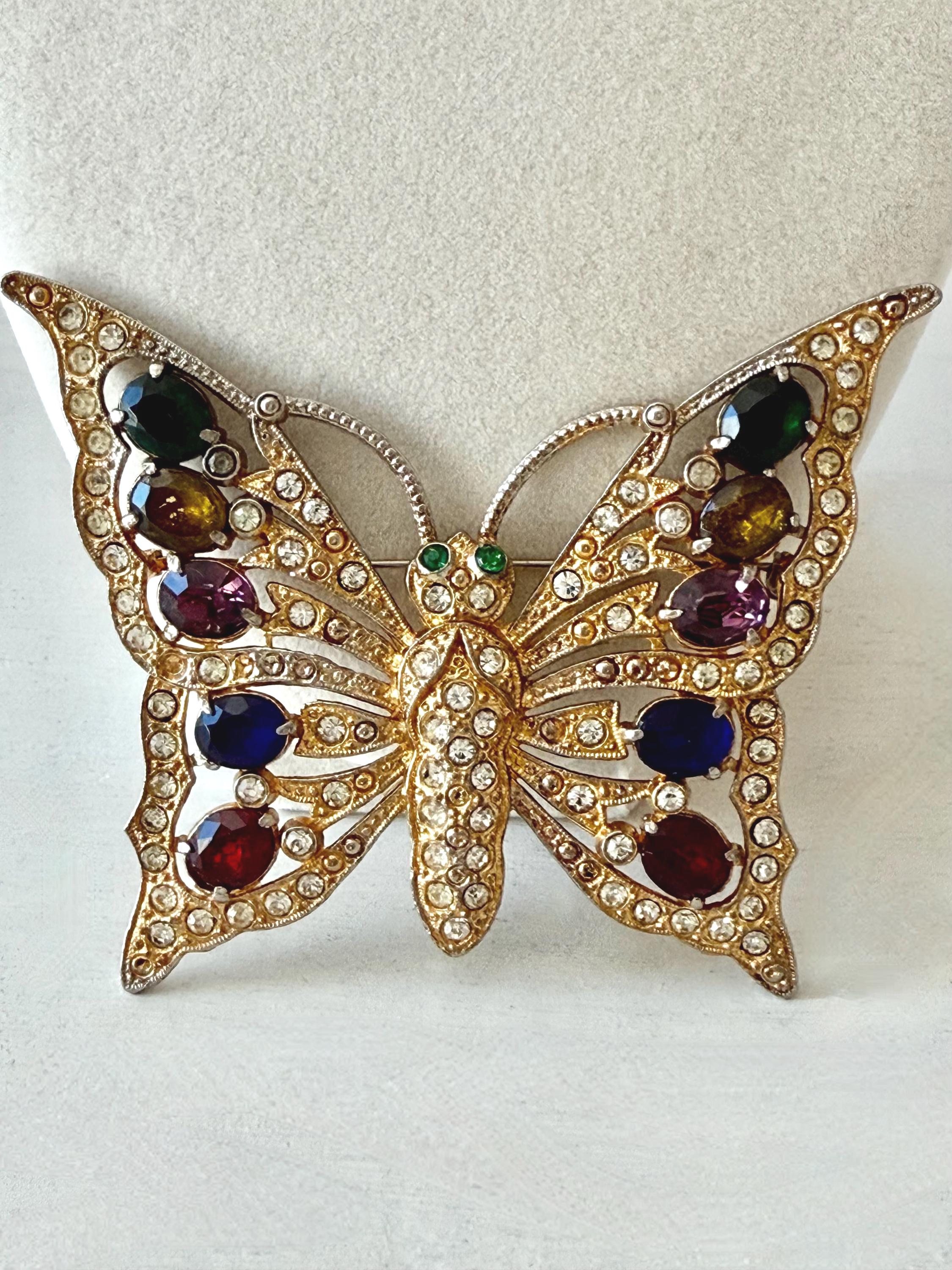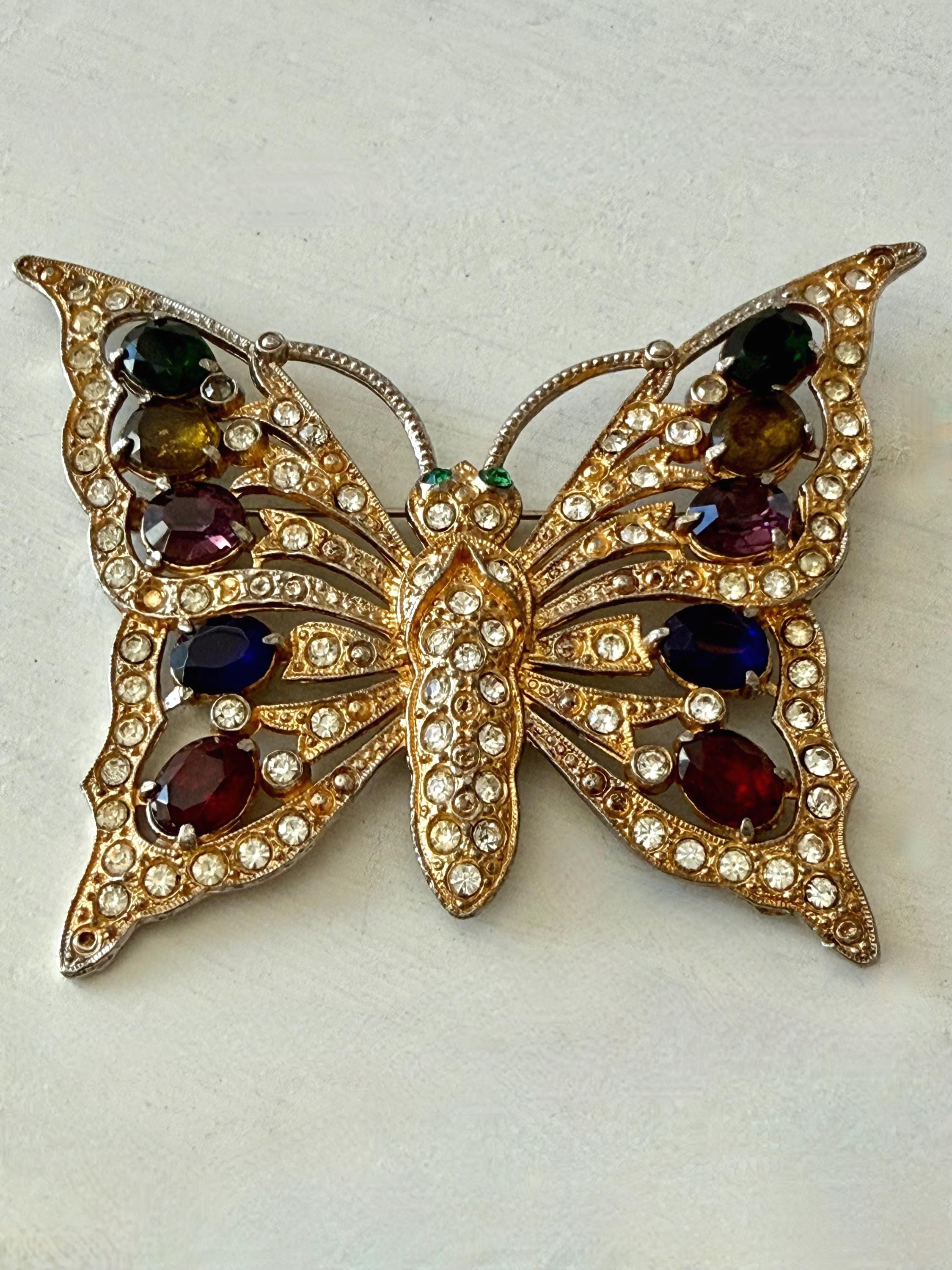 This listing is for a beautiful vintage butterfly brooch from the 1940s. The design has been attributed to the House of Schrager, a costume jewelry company founded in 1925, but the brooch was sold by Staret. It is quite a statement piece measuring 3 3/4" wide and 3" high and weighing 48 grams. The large, colorful, foil-backed stones are gorgeous and the clear stones are sparkling. There is one missing clear stone which you can see in the last photo; the clasp is secure. A beautiful, iconic piece!