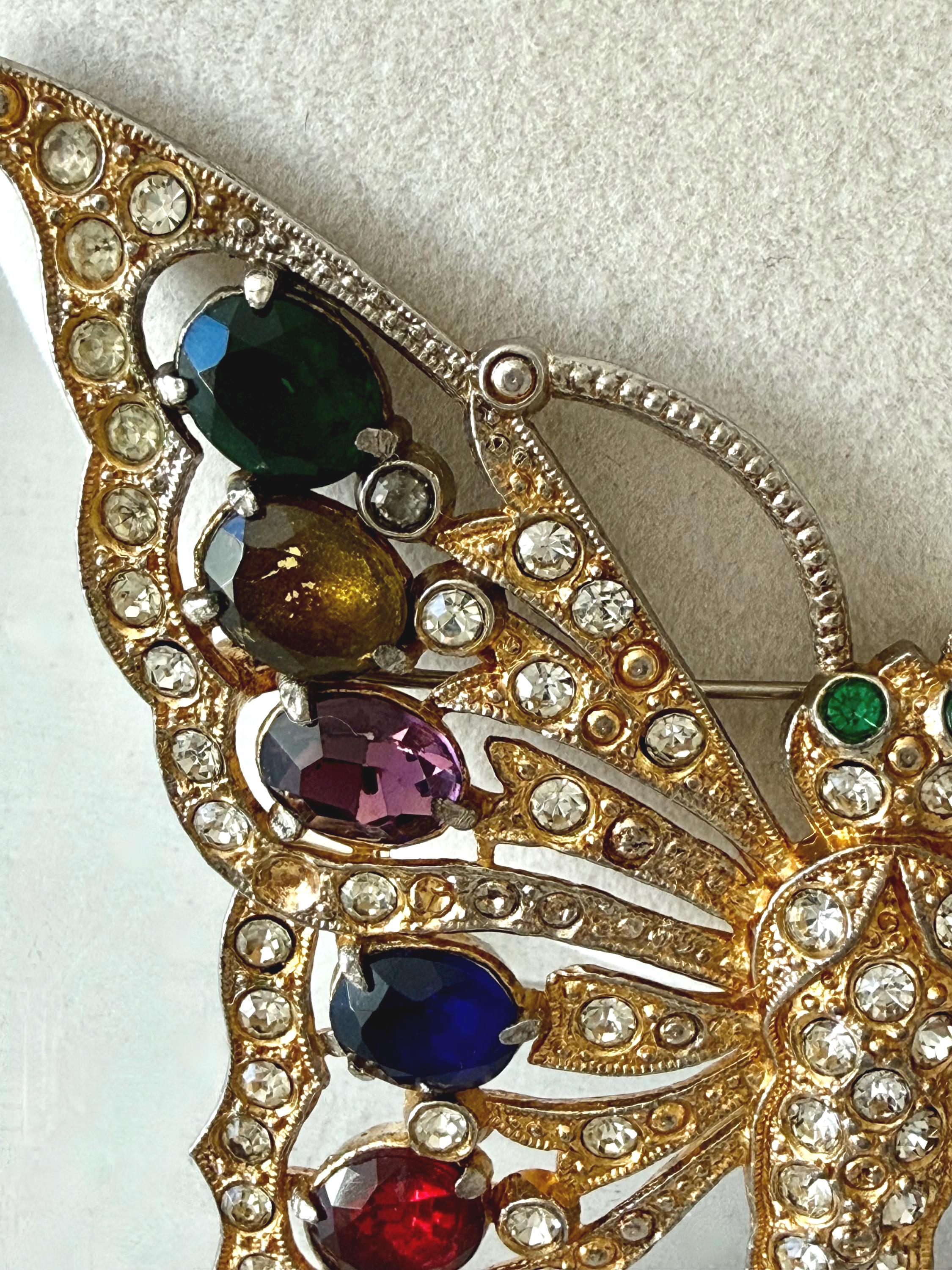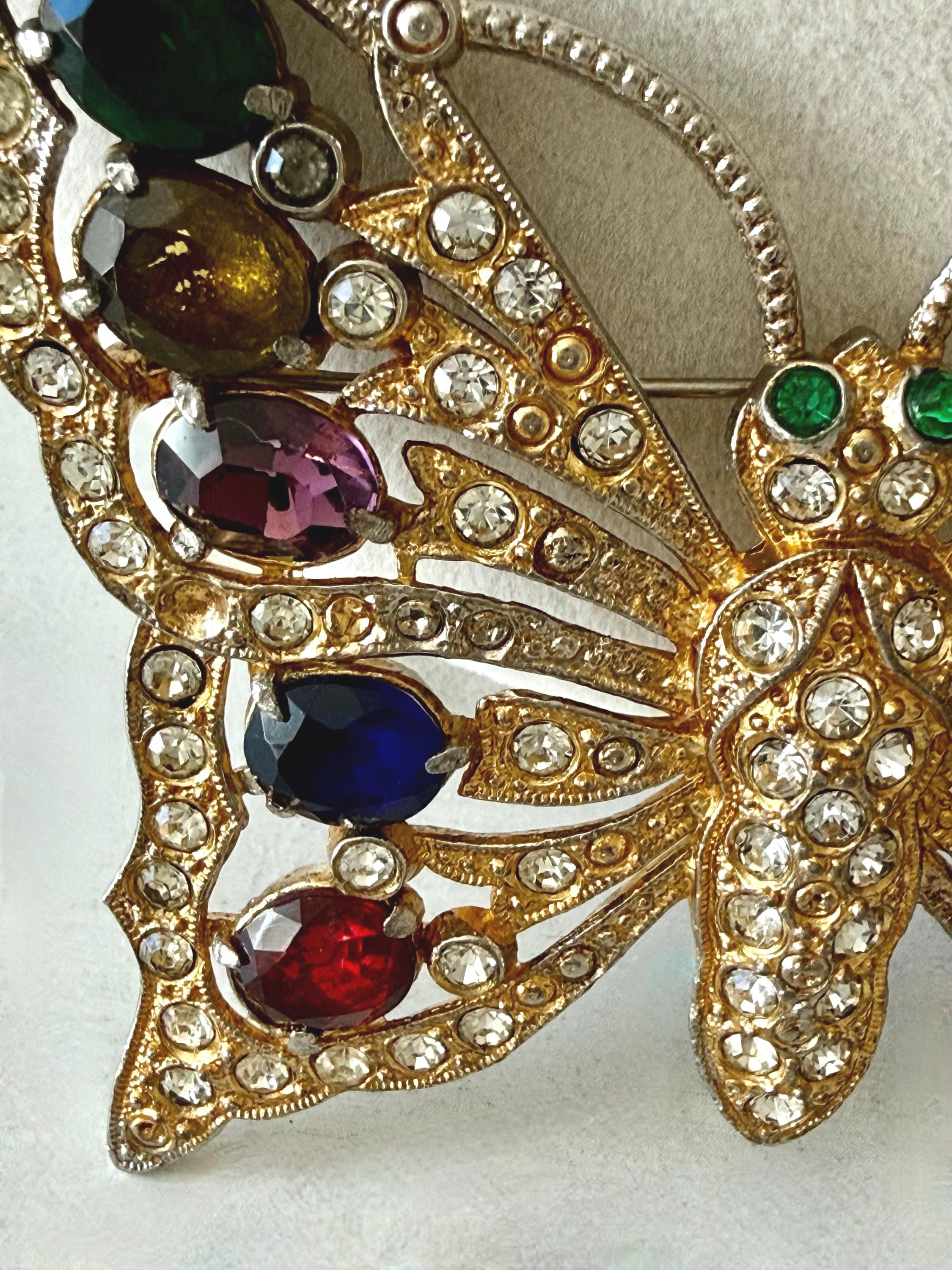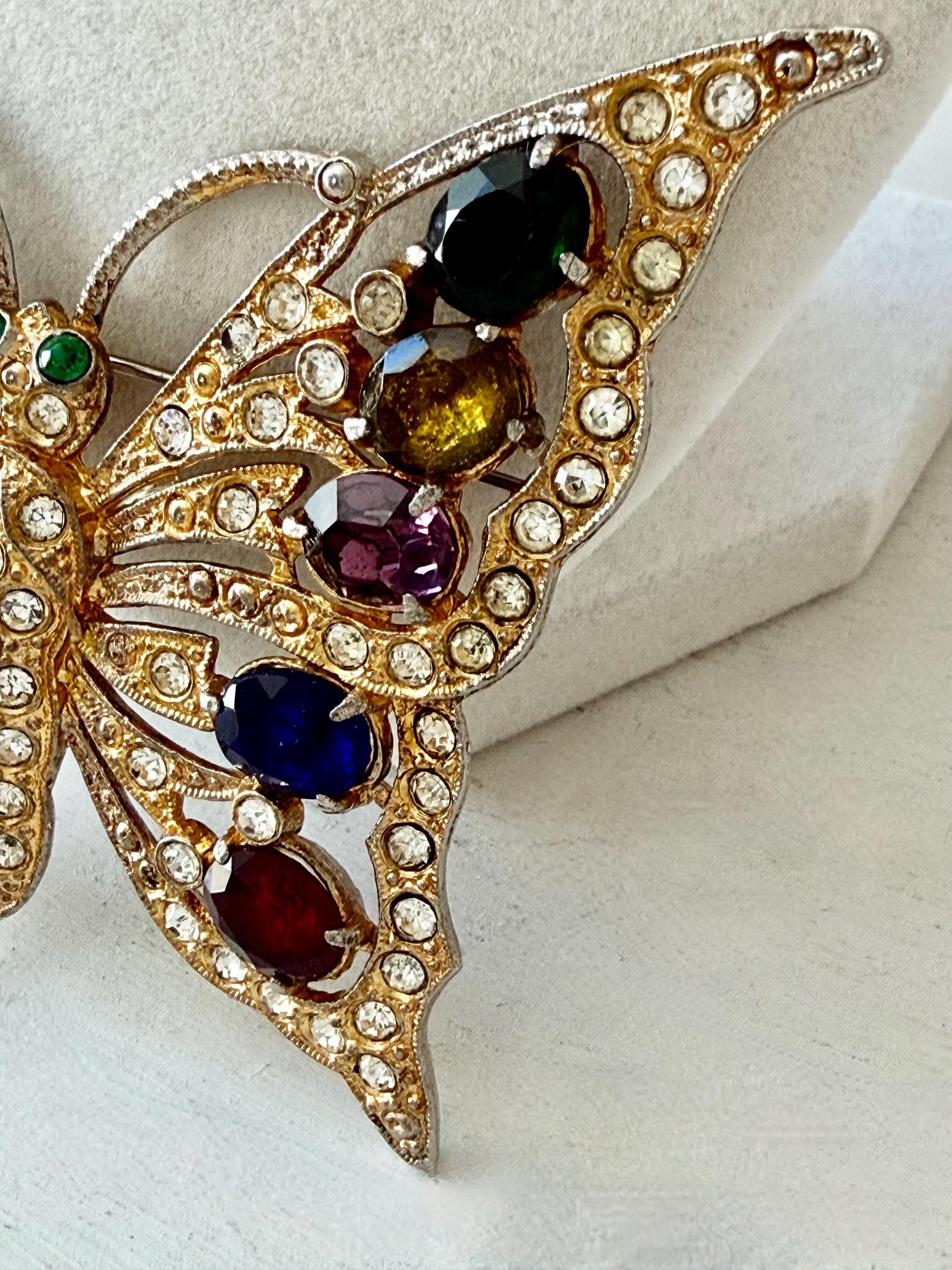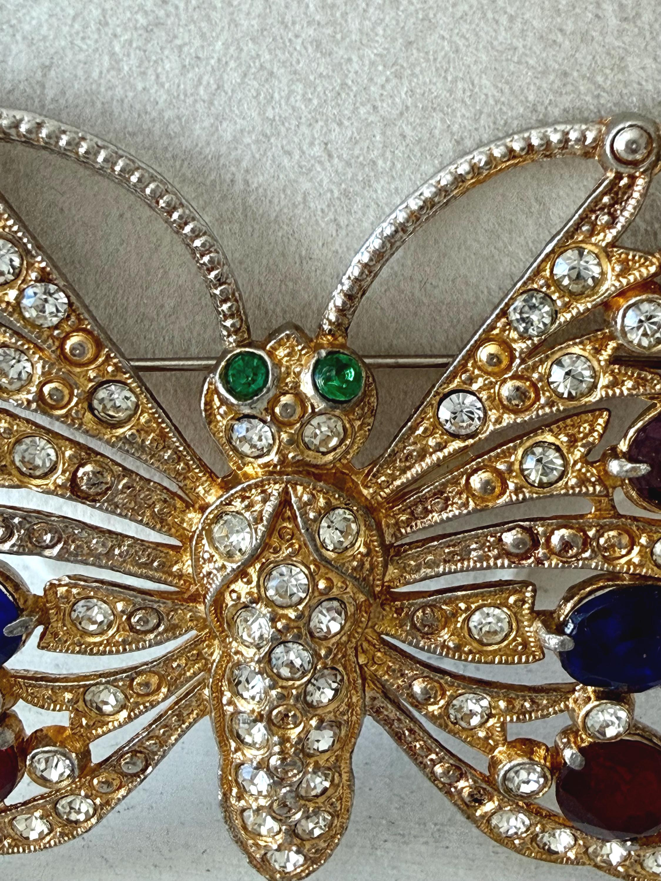 This listing is for a beautiful vintage butterfly brooch from the 1940s. The design has been attributed to the House of Schrager, a costume jewelry company founded in 1925, but the brooch was sold by Staret. It is quite a statement piece measuring 3 3/4" wide and 3" high and weighing 48 grams. The large, colorful, foil-backed stones are gorgeous and the clear stones are sparkling. There is one missing clear stone which you can see in the last photo; the clasp is secure. A beautiful, iconic piece!