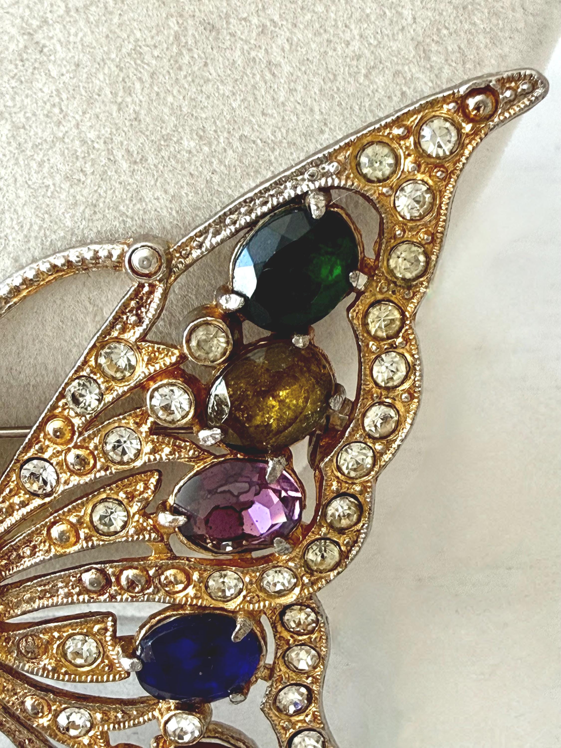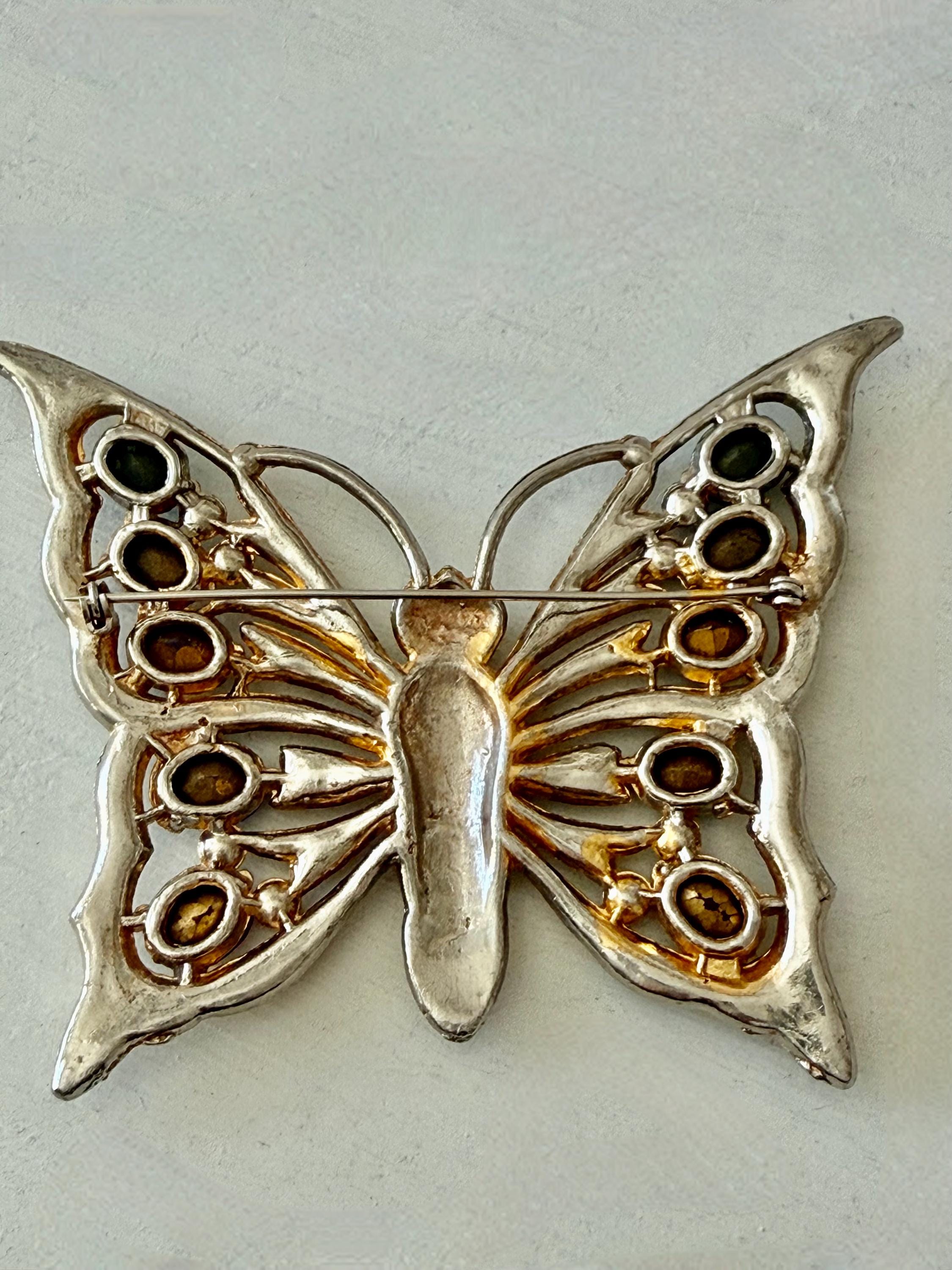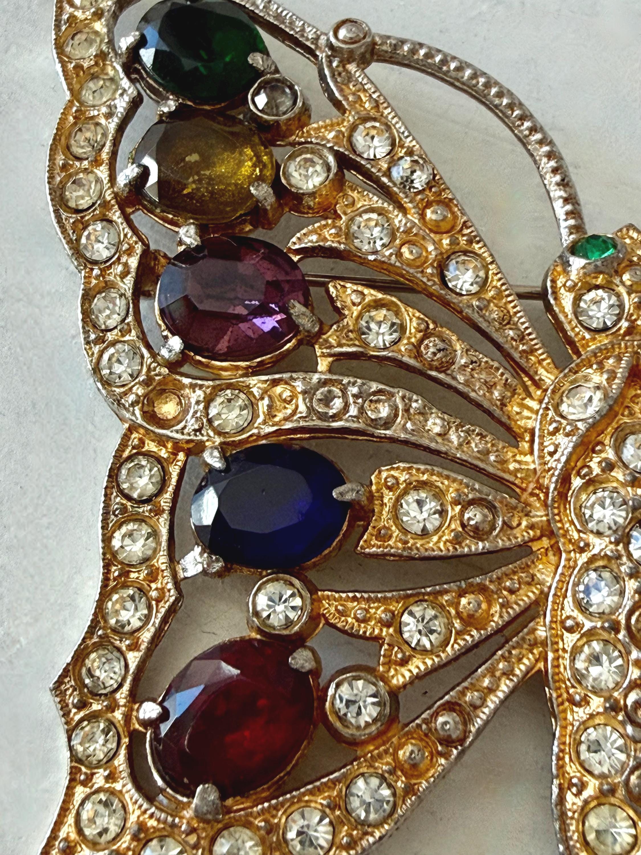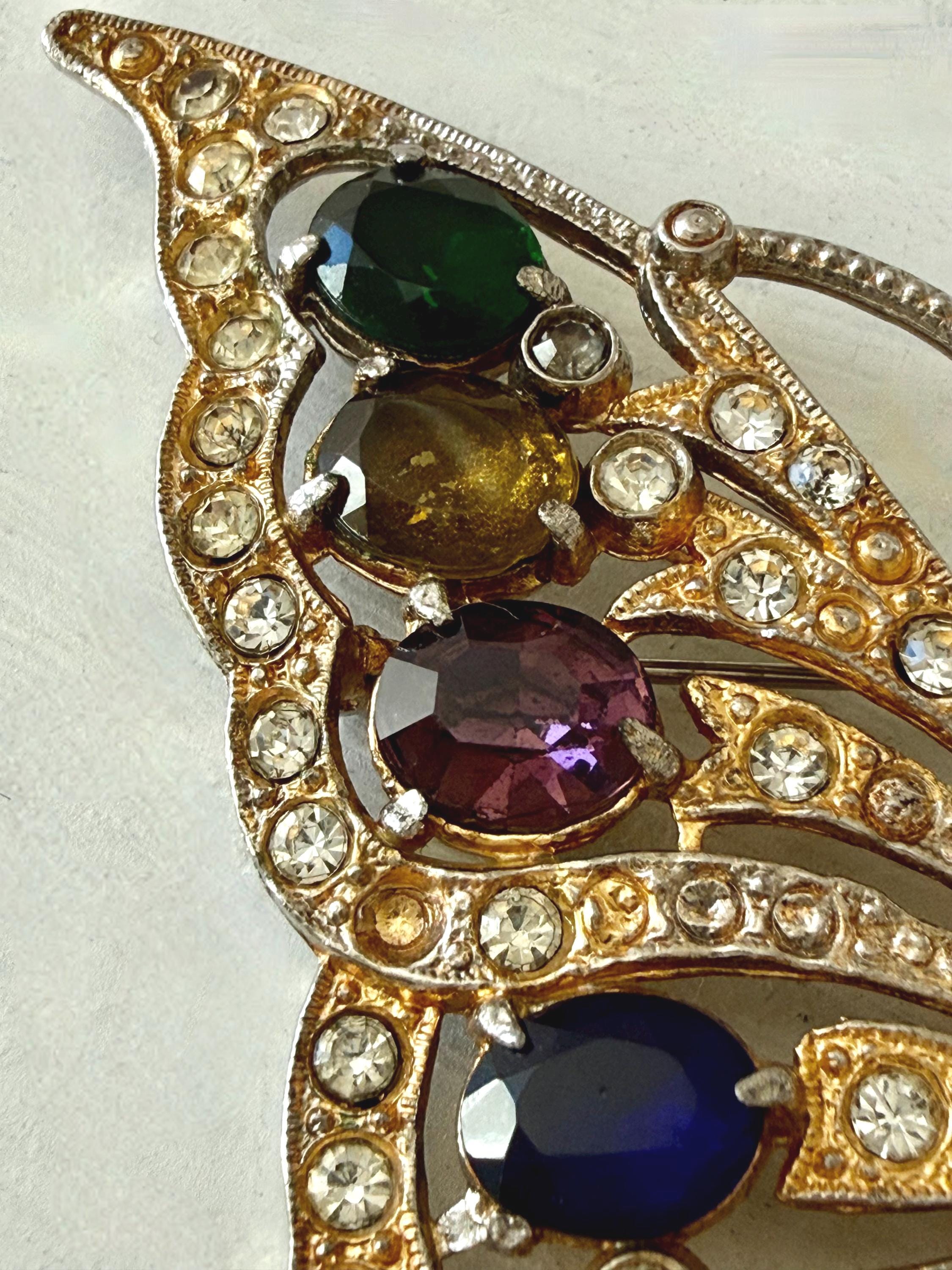 This listing is for a beautiful vintage butterfly brooch from the 1940s. The design has been attributed to the House of Schrager, a costume jewelry company founded in 1925, but the brooch was sold by Staret. It is quite a statement piece measuring 3 3/4" wide and 3" high and weighing 48 grams. The large, colorful, foil-backed stones are gorgeous and the clear stones are sparkling. There is one missing clear stone which you can see in the last photo; the clasp is secure. A beautiful, iconic piece!