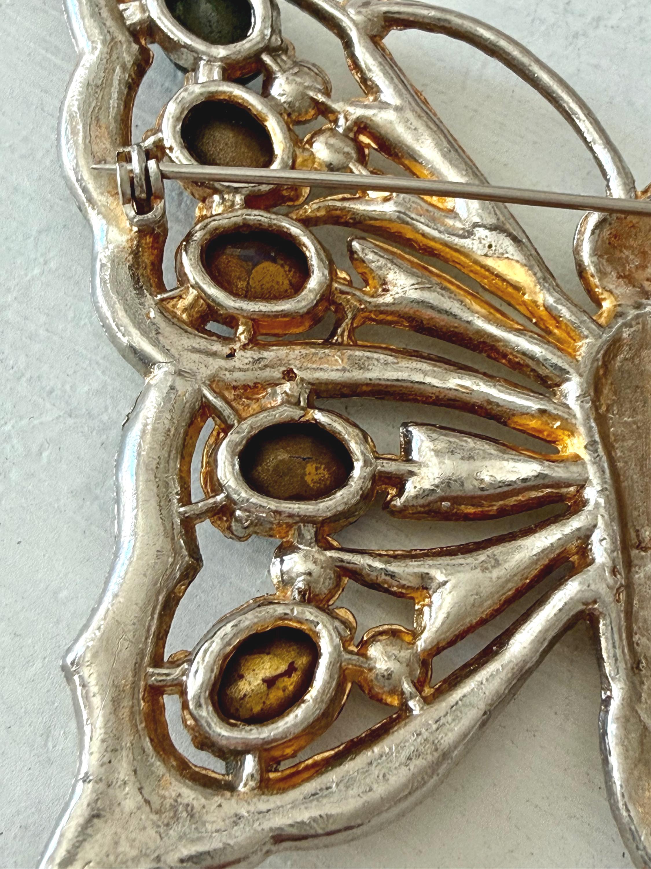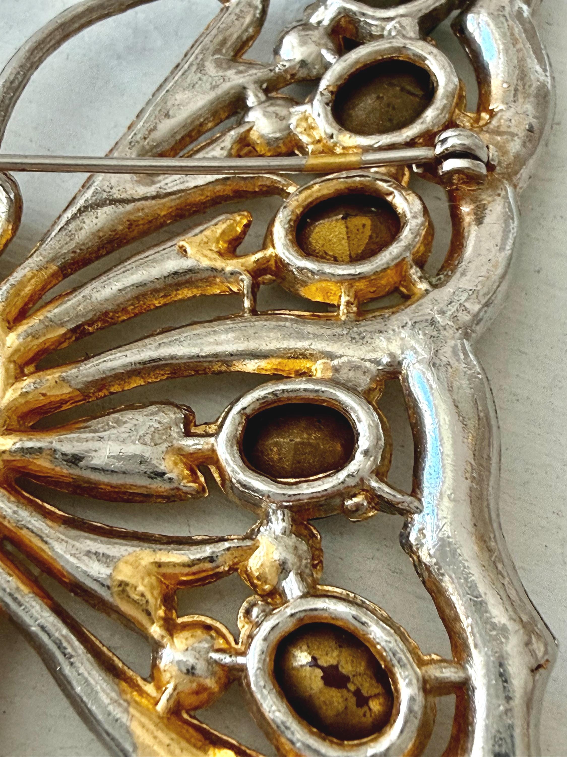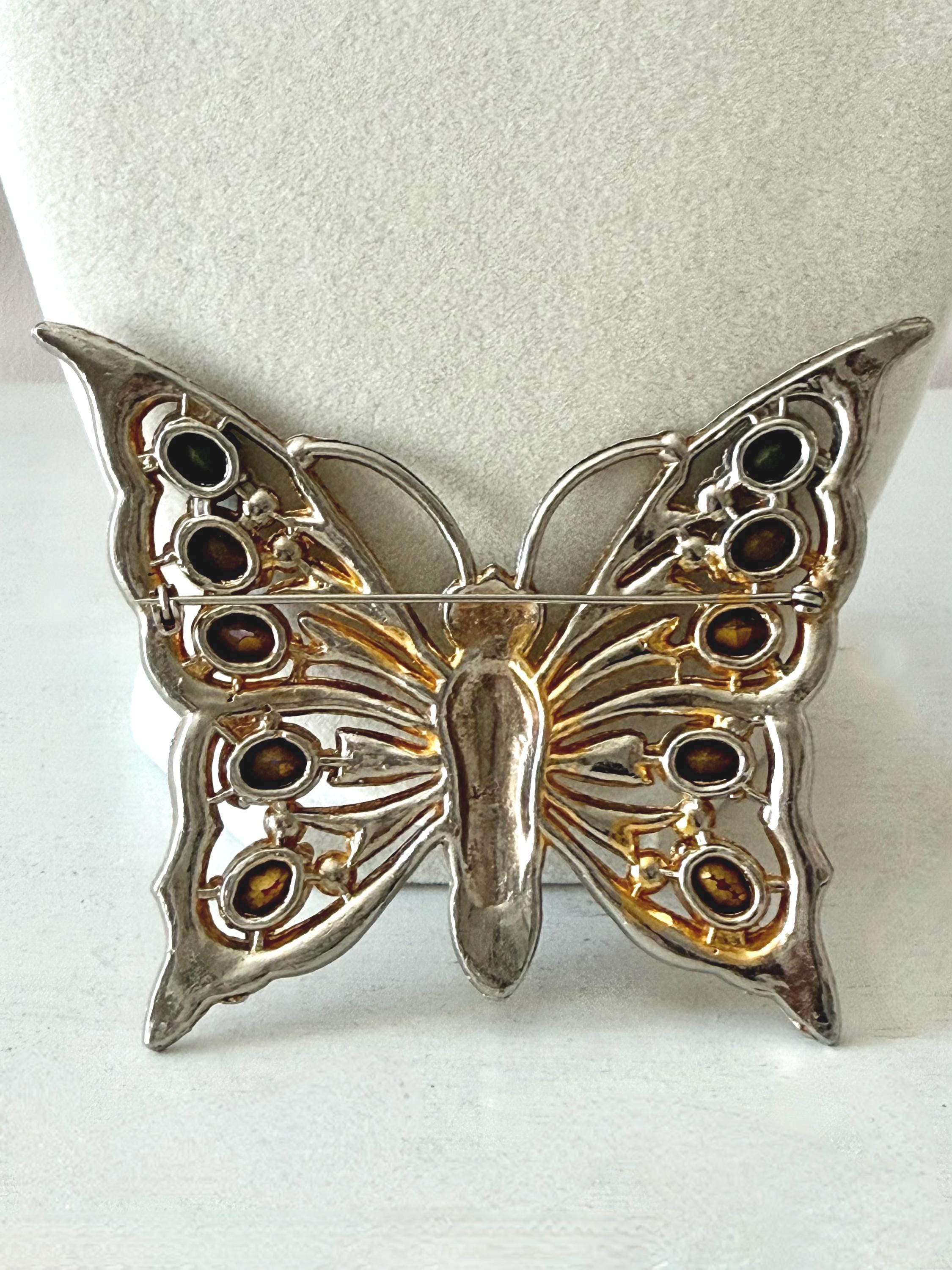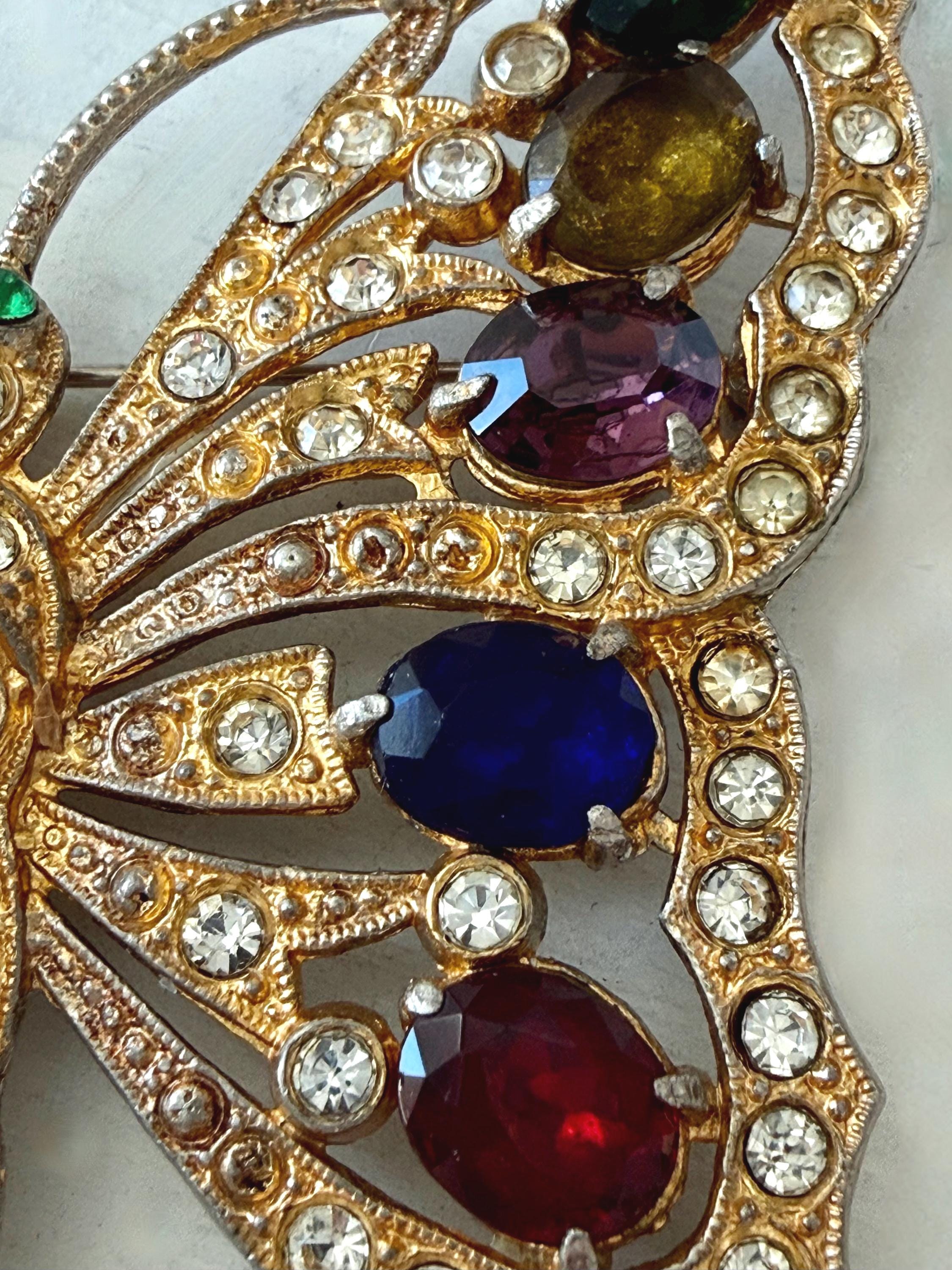 This listing is for a beautiful vintage butterfly brooch from the 1940s. The design has been attributed to the House of Schrager, a costume jewelry company founded in 1925, but the brooch was sold by Staret. It is quite a statement piece measuring 3 3/4" wide and 3" high and weighing 48 grams. The large, colorful, foil-backed stones are gorgeous and the clear stones are sparkling. There is one missing clear stone which you can see in the last photo; the clasp is secure. A beautiful, iconic piece!