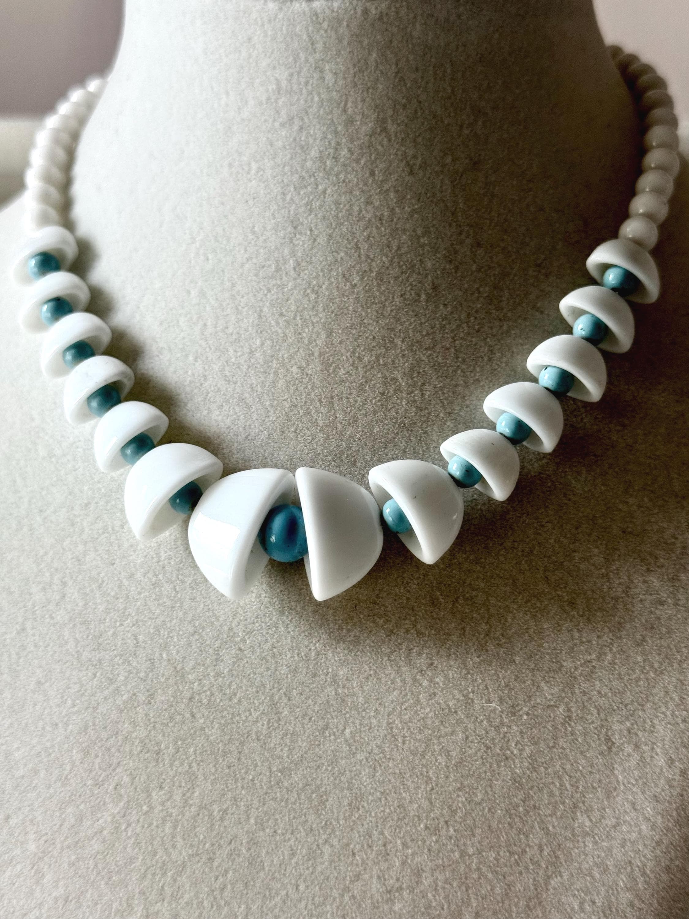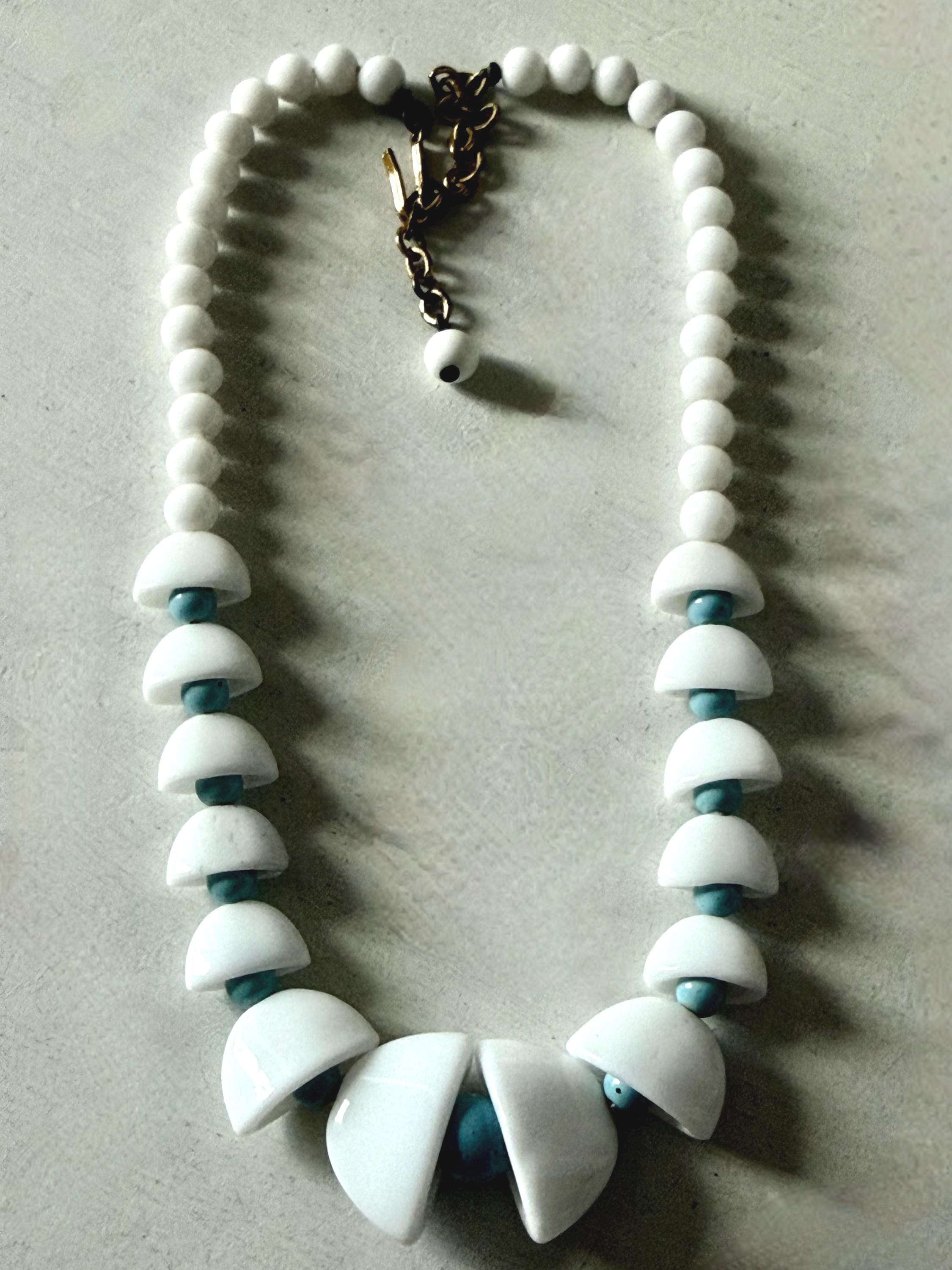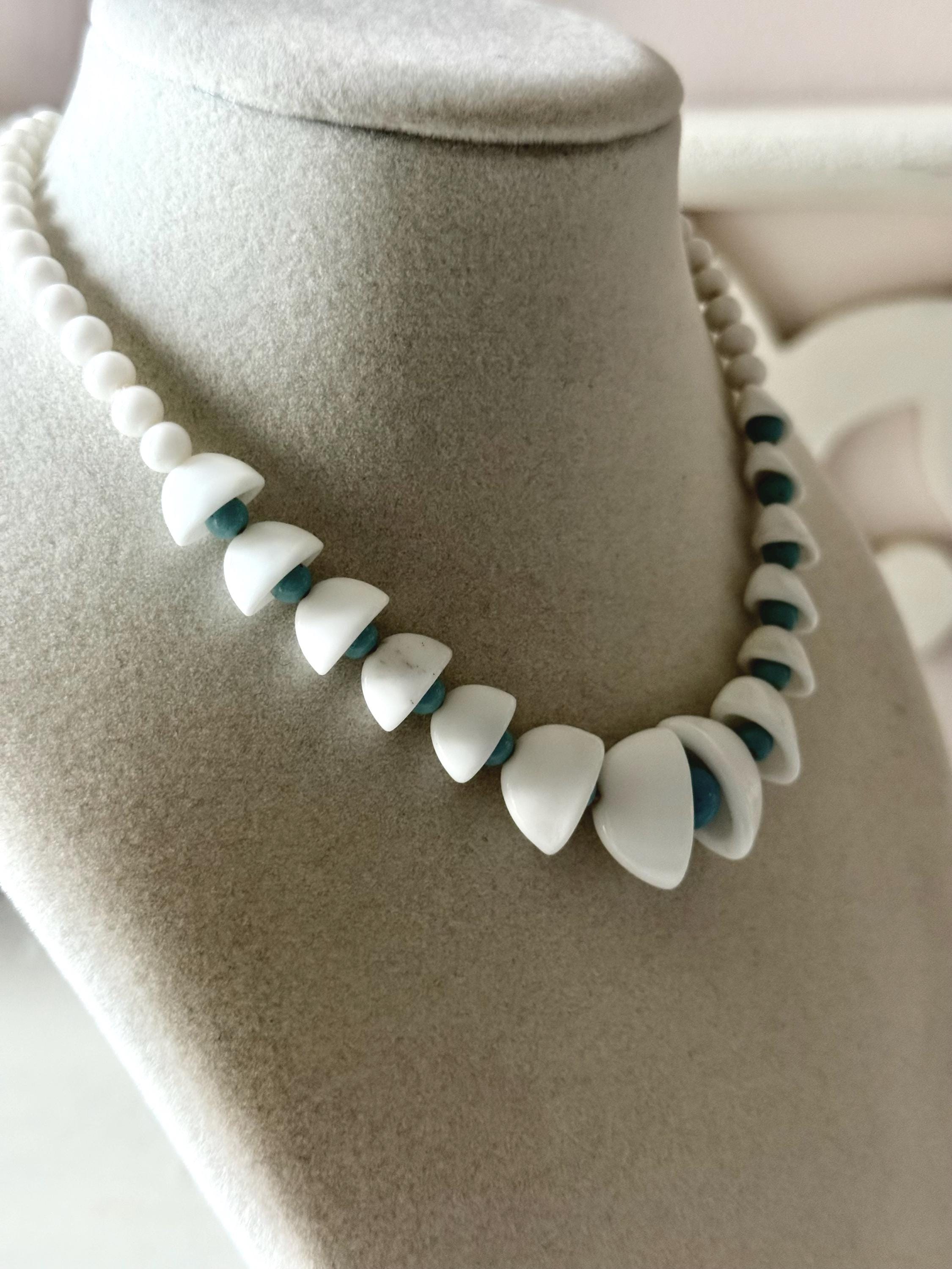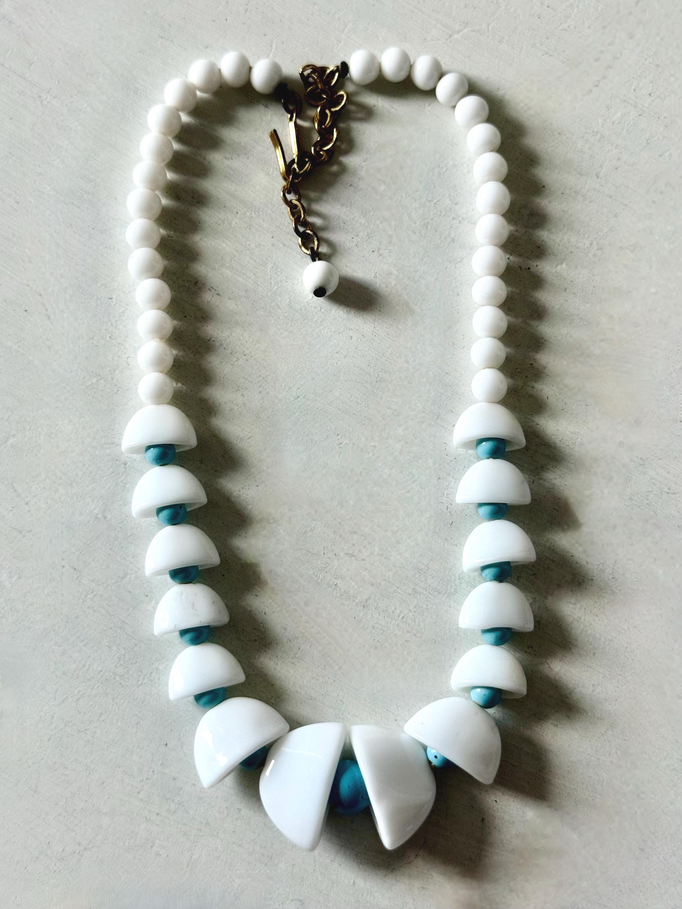 This listing is for an adorable vintage necklace, unsigned. Extending to 15.5" in length, the choker necklace features graduated glass beads in white and robin's egg blue. The white beads in the center six inches resemble bells with blue clappers. Note that there are a few tiny blemishes to the beads. This one is so cute and so perfect for spring and summer!