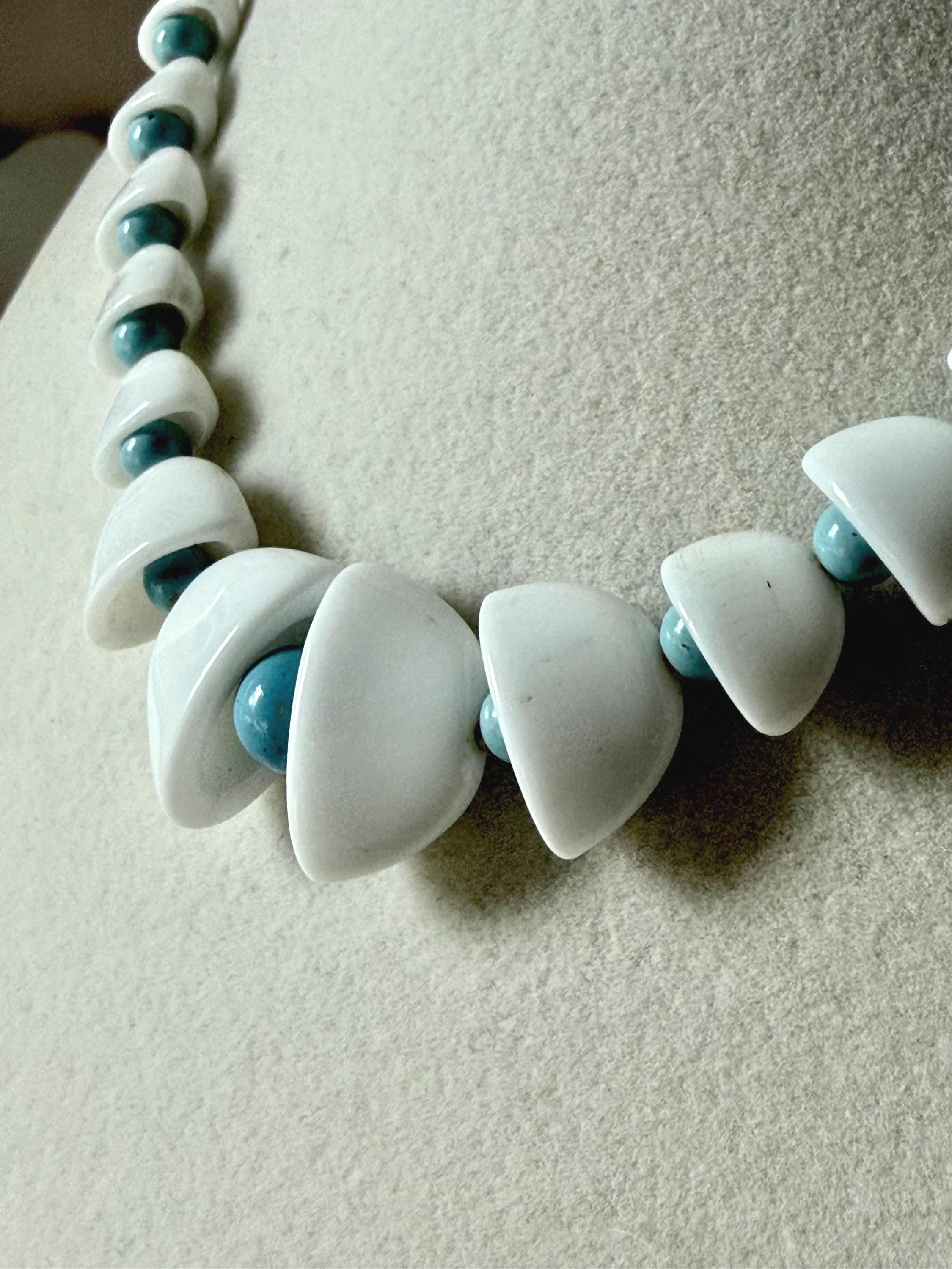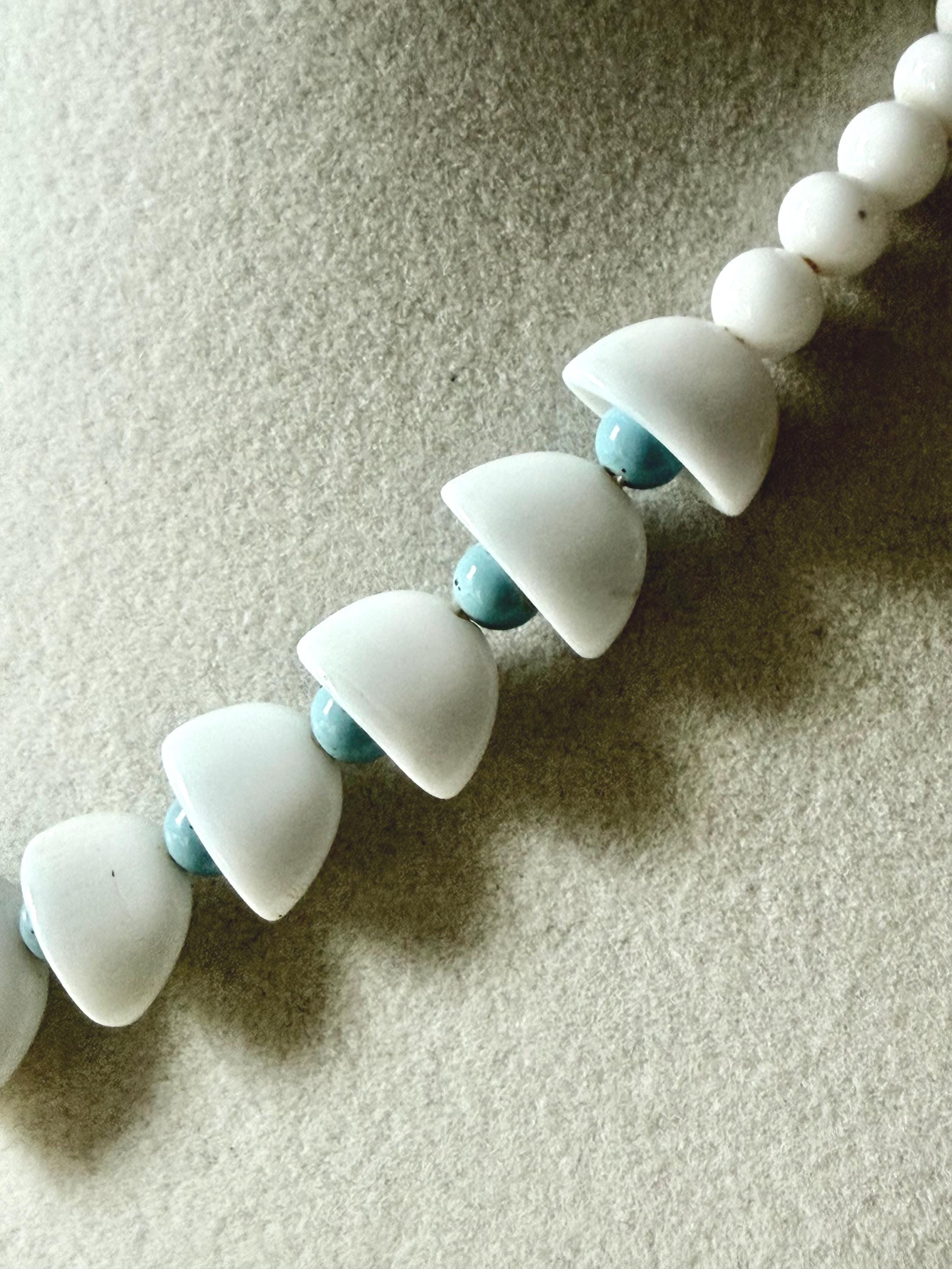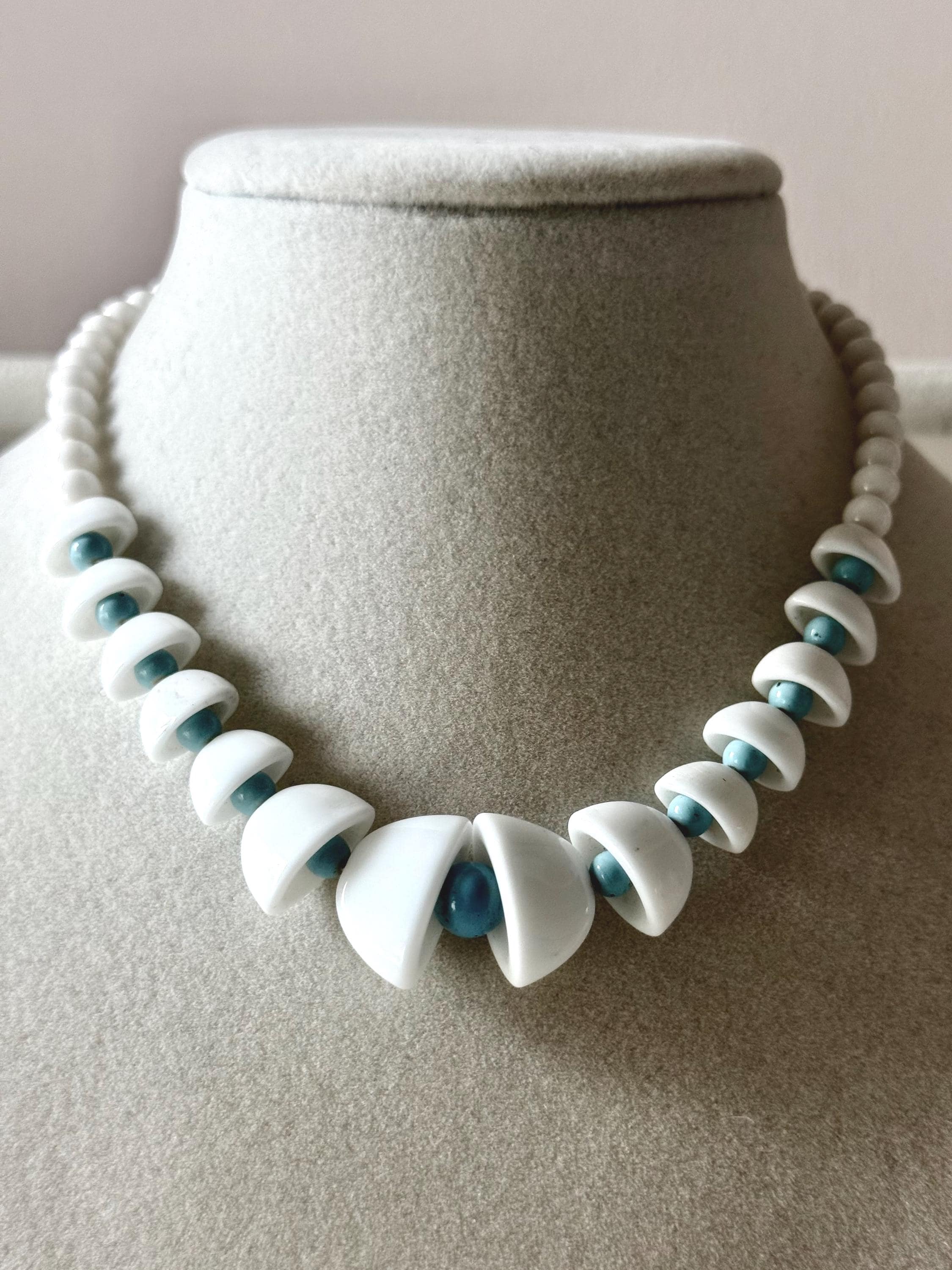 This listing is for an adorable vintage necklace, unsigned. Extending to 15.5" in length, the choker necklace features graduated glass beads in white and robin's egg blue. The white beads in the center six inches resemble bells with blue clappers. Note that there are a few tiny blemishes to the beads. This one is so cute and so perfect for spring and summer!