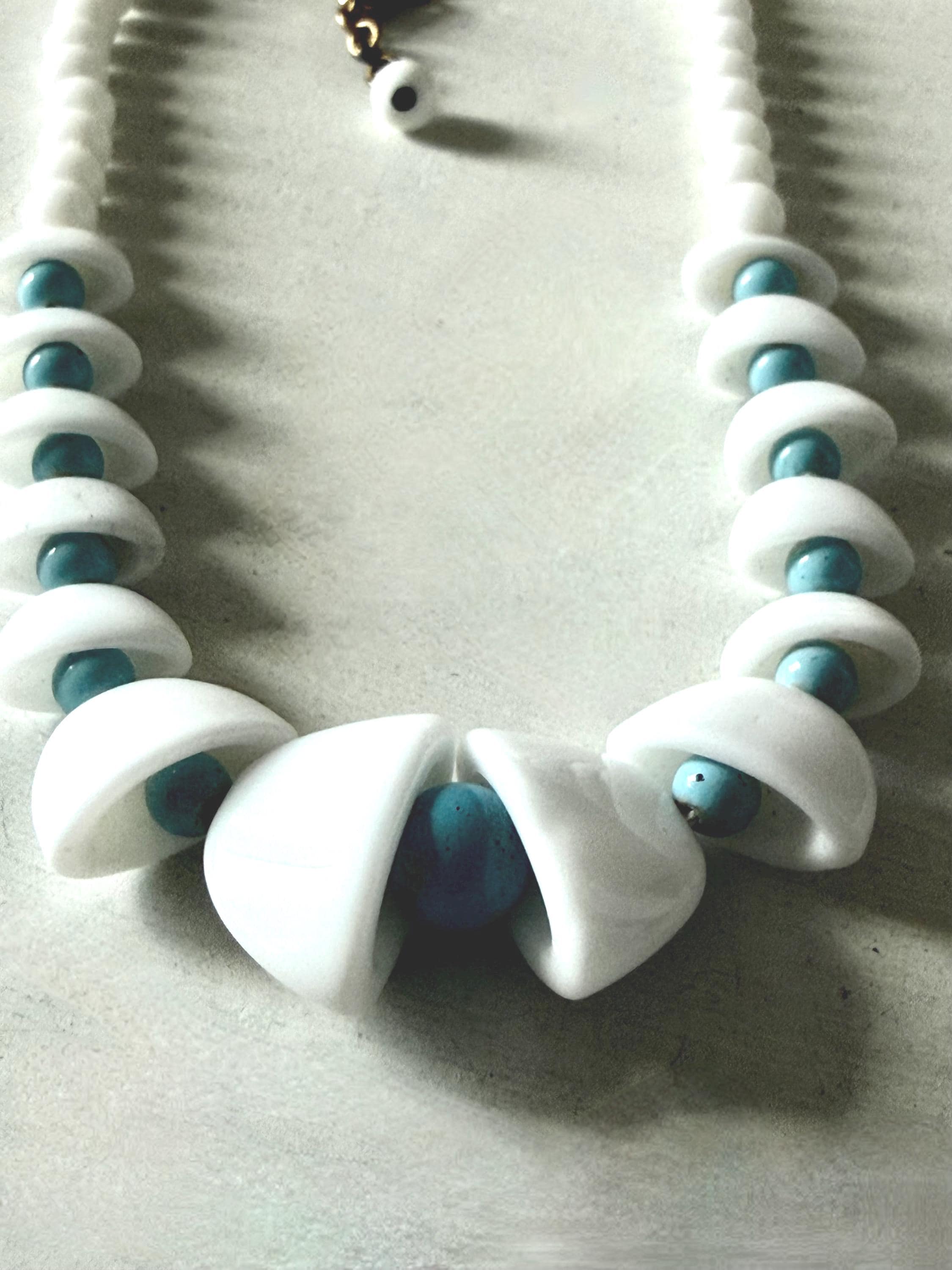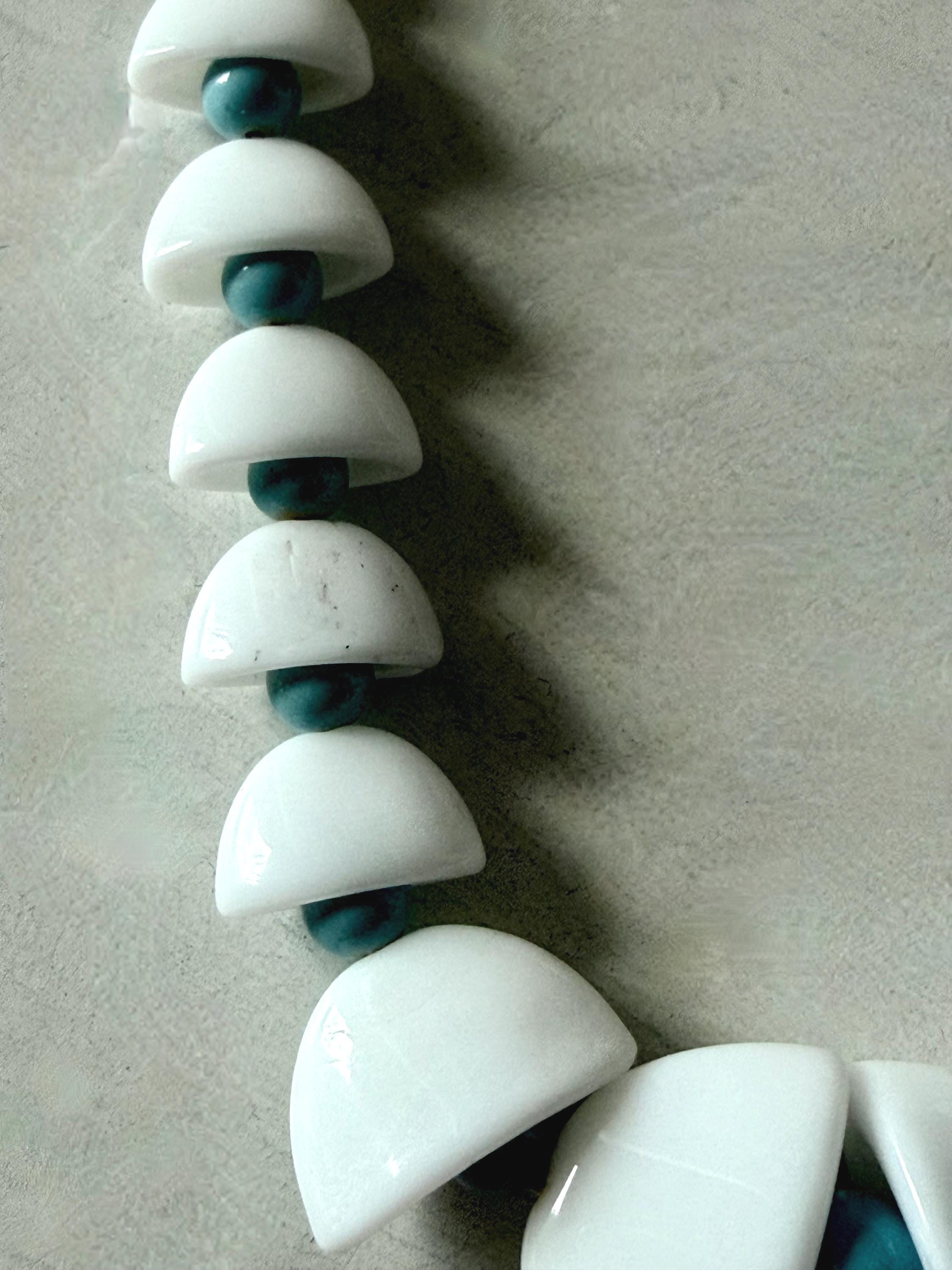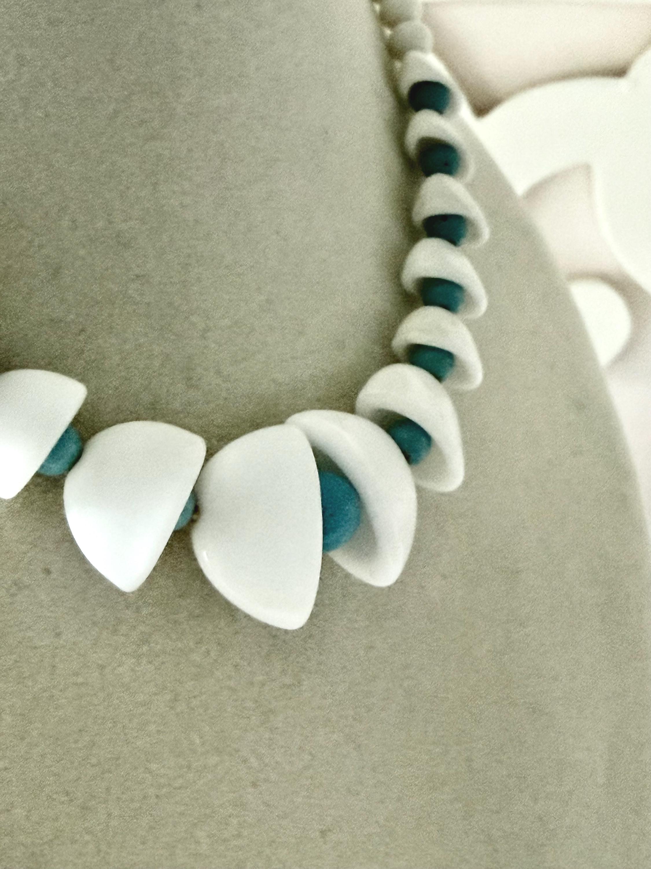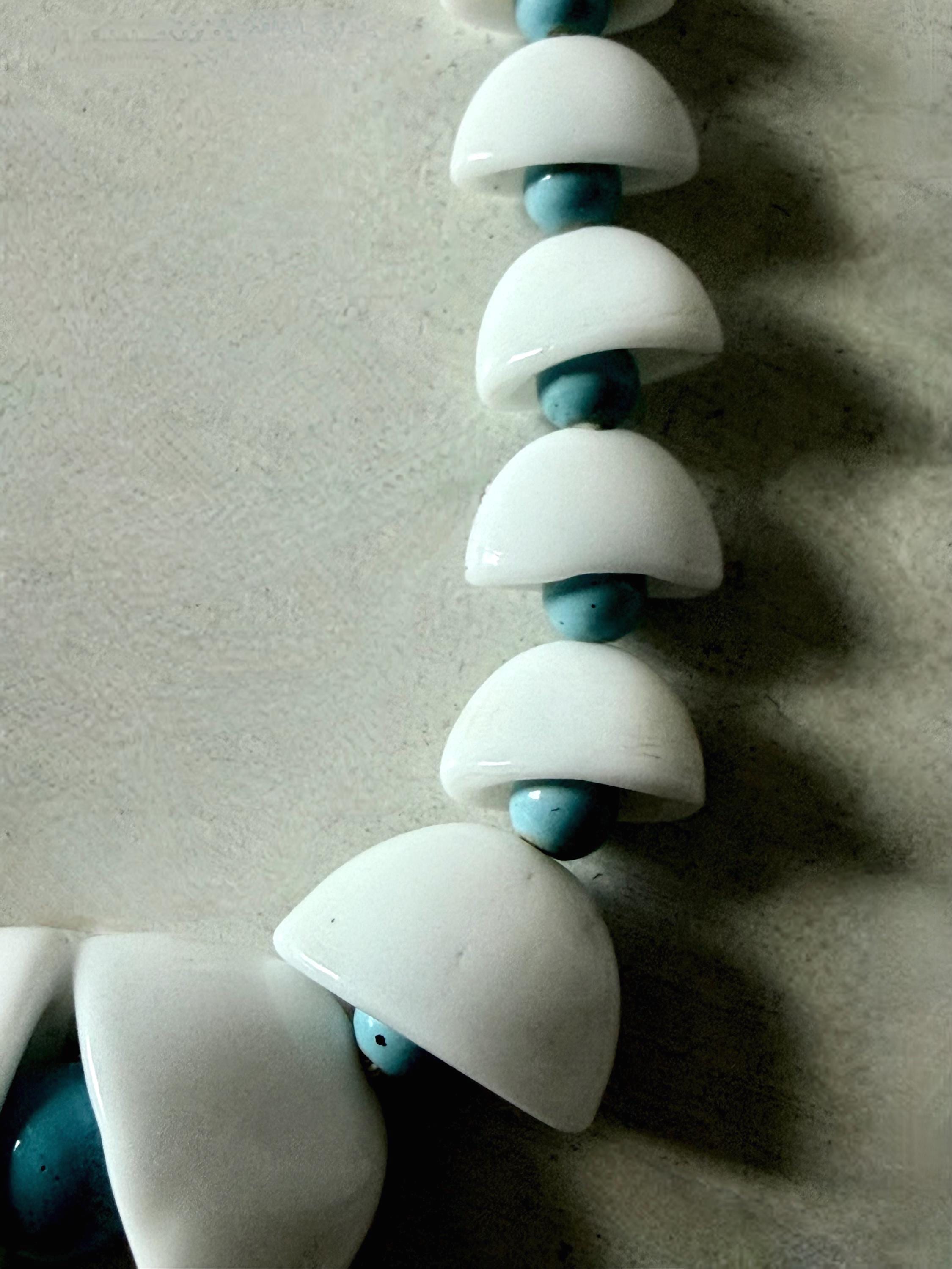 This listing is for an adorable vintage necklace, unsigned. Extending to 15.5" in length, the choker necklace features graduated glass beads in white and robin's egg blue. The white beads in the center six inches resemble bells with blue clappers. Note that there are a few tiny blemishes to the beads. This one is so cute and so perfect for spring and summer!