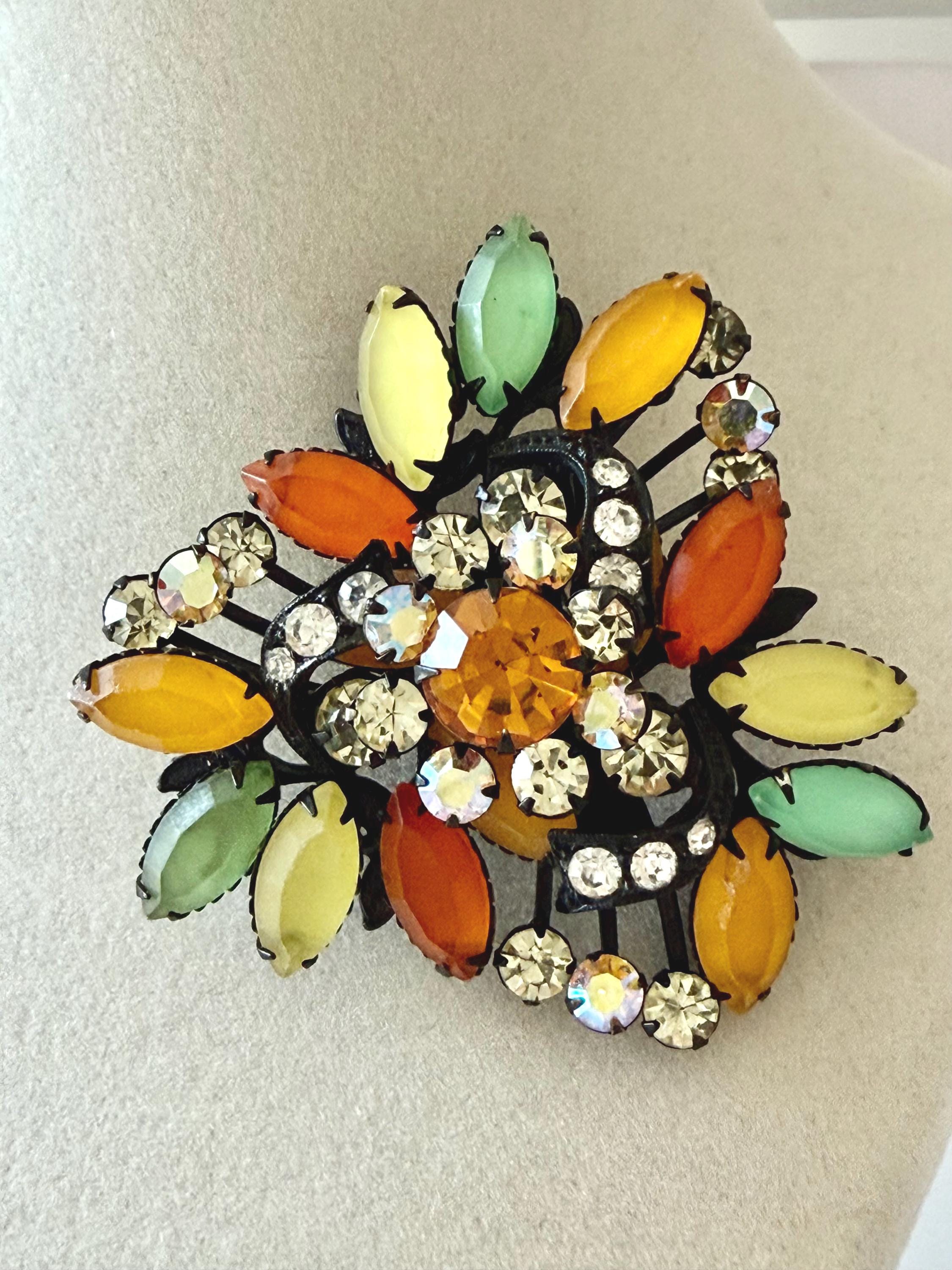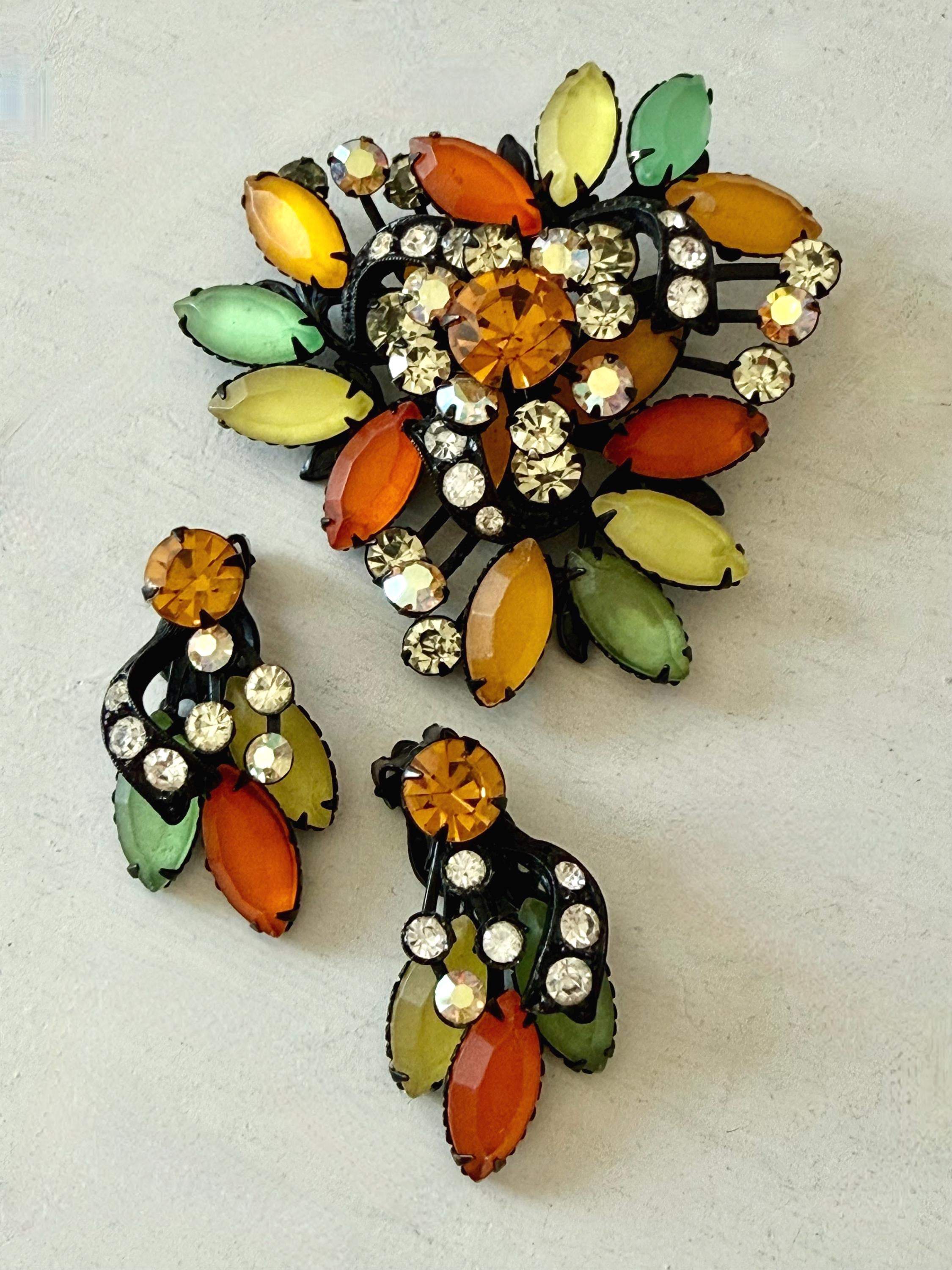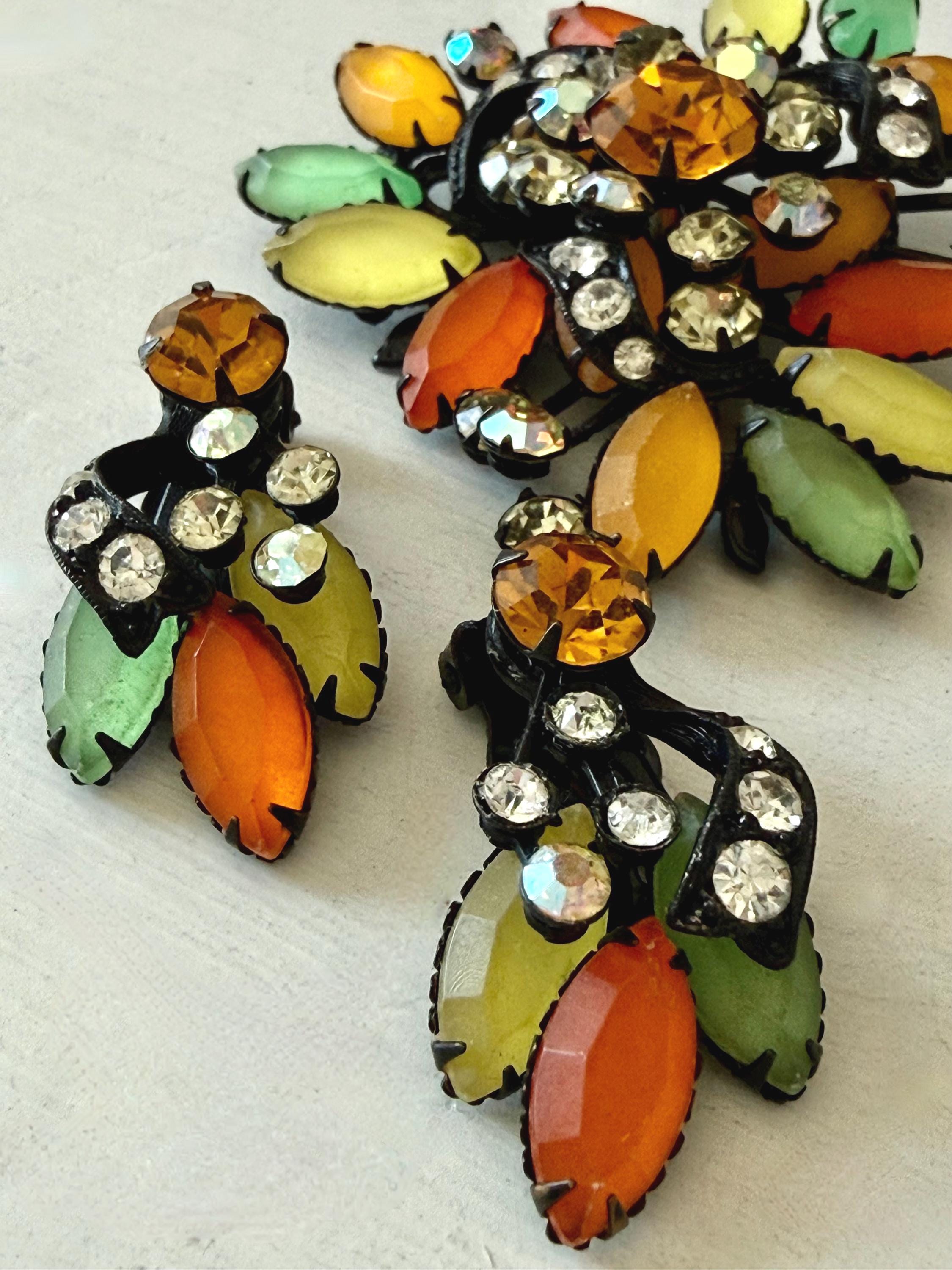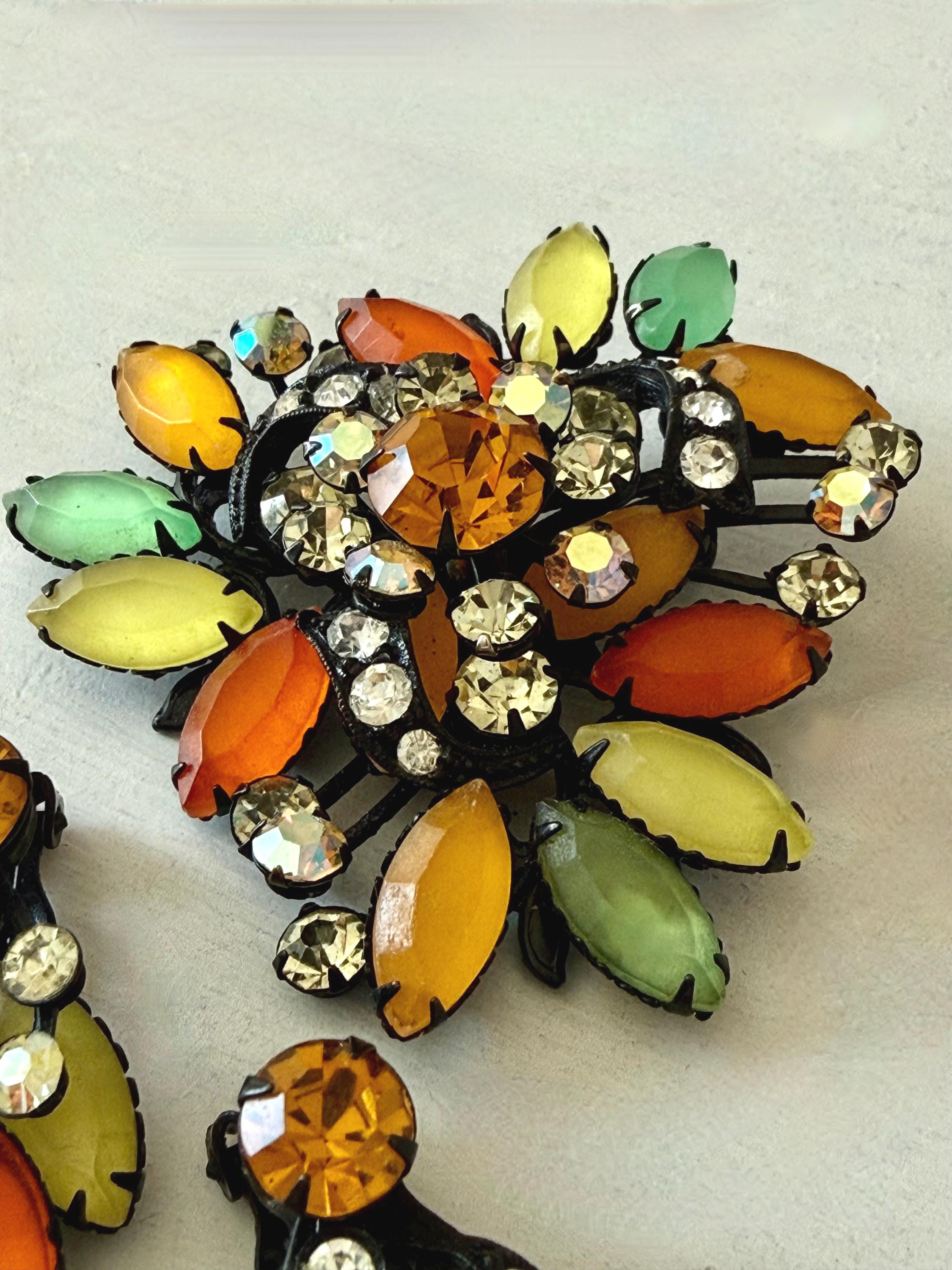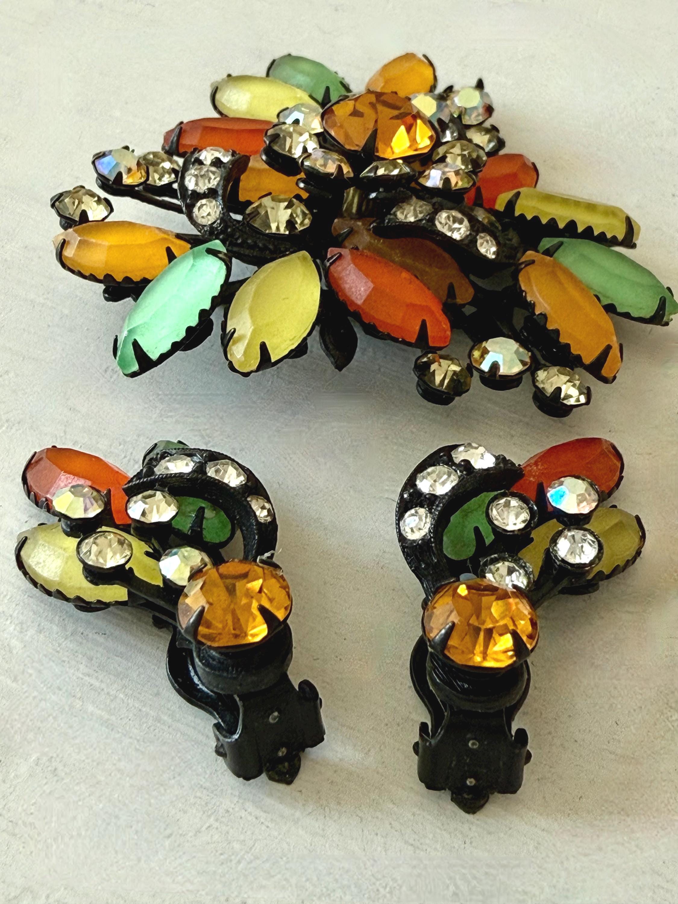 This listing is for a fantastic vintage set of brooch and earrings, unsigned. Measuring 2 1/4" wide and 2 1/4" long, the japanned metal brooch features frosted glass marquises in summery lemon, apricot, orange, and lime with additional sparkle from AB stones. All stones are intact and the clasp is secure. The earrings are 1 3/8" long with secure clip backs. All stones are intact but it appears that some have been replaced with stones that are not the original size. This set is so unique and so very sunny!