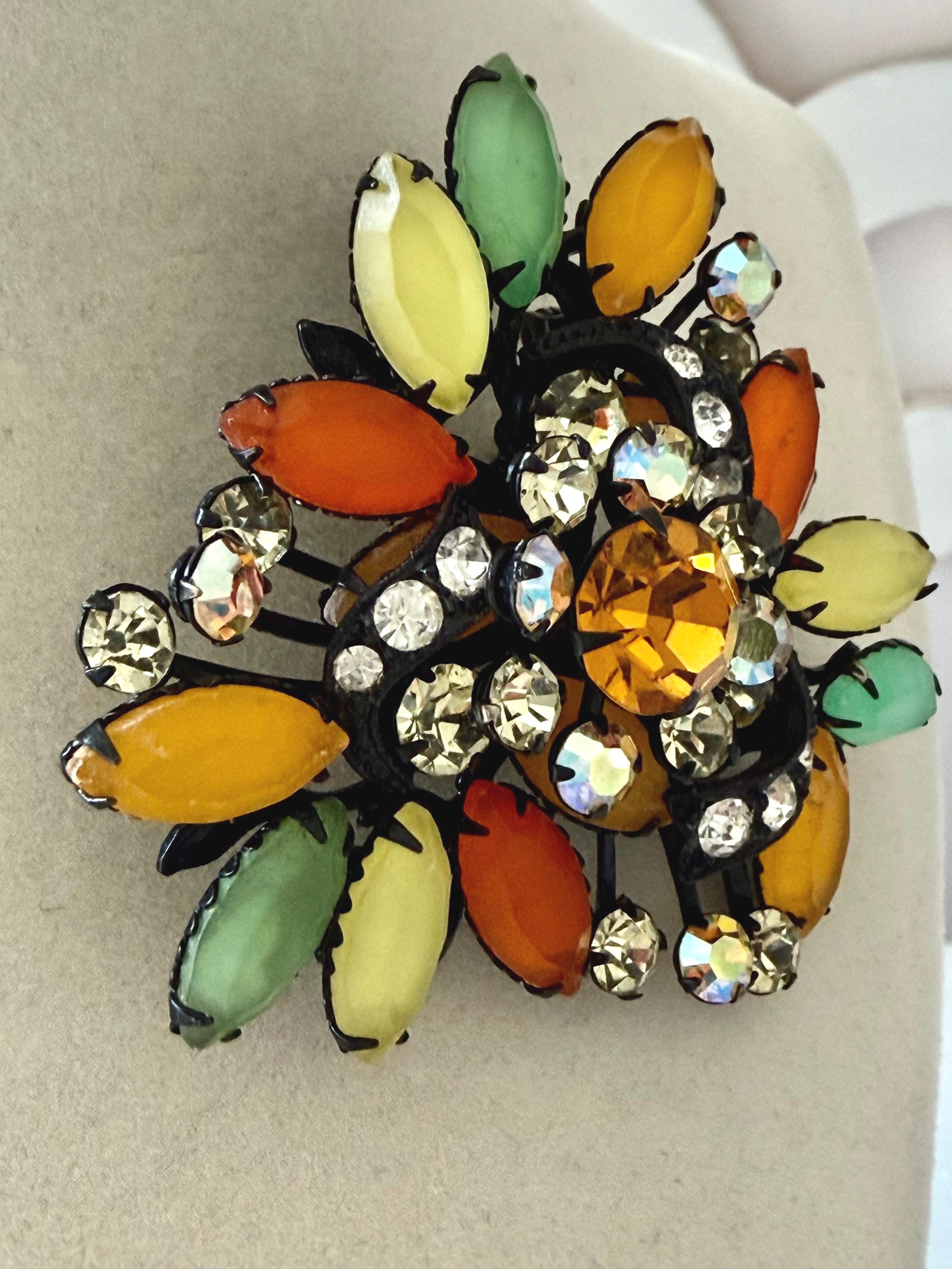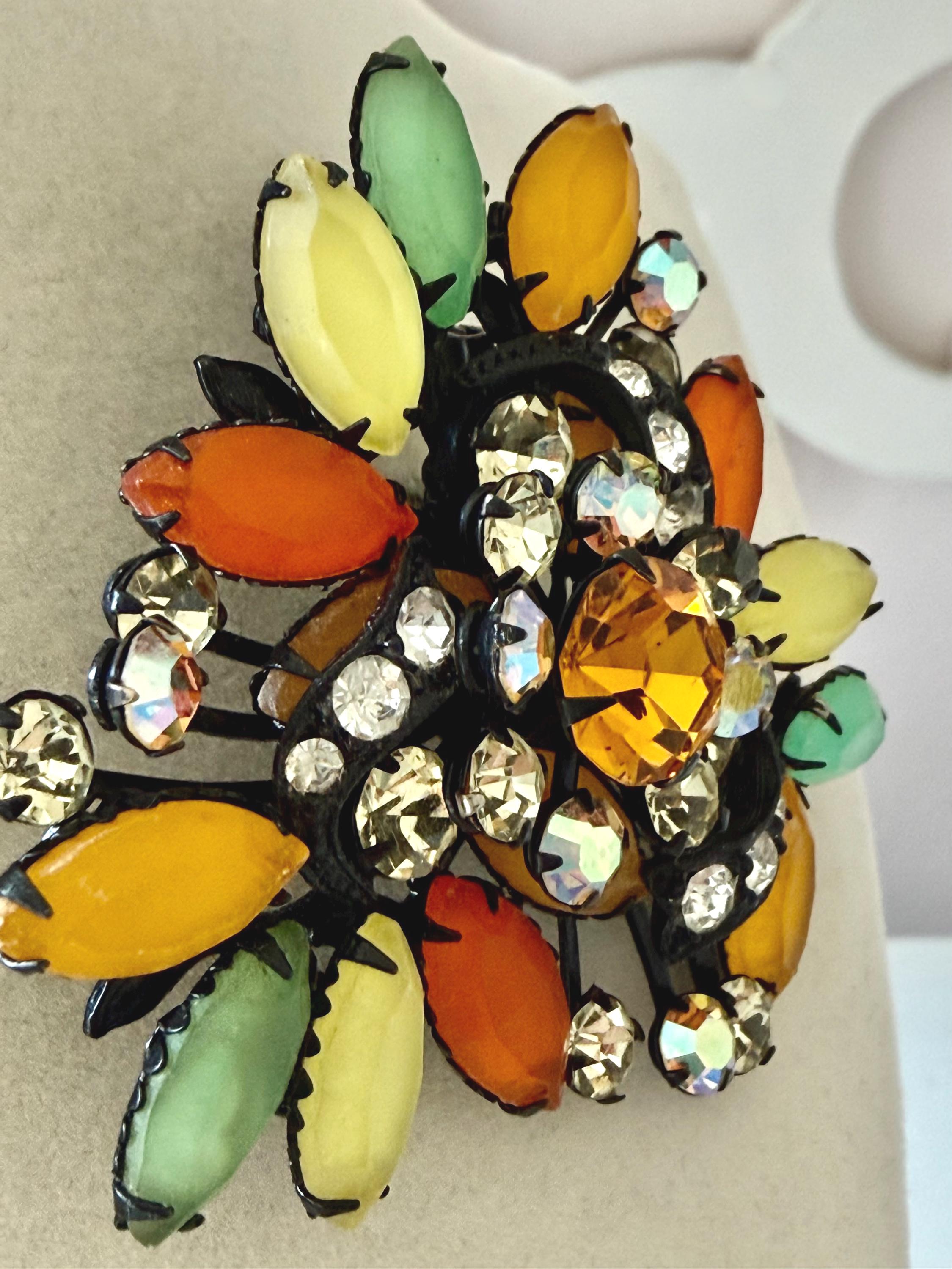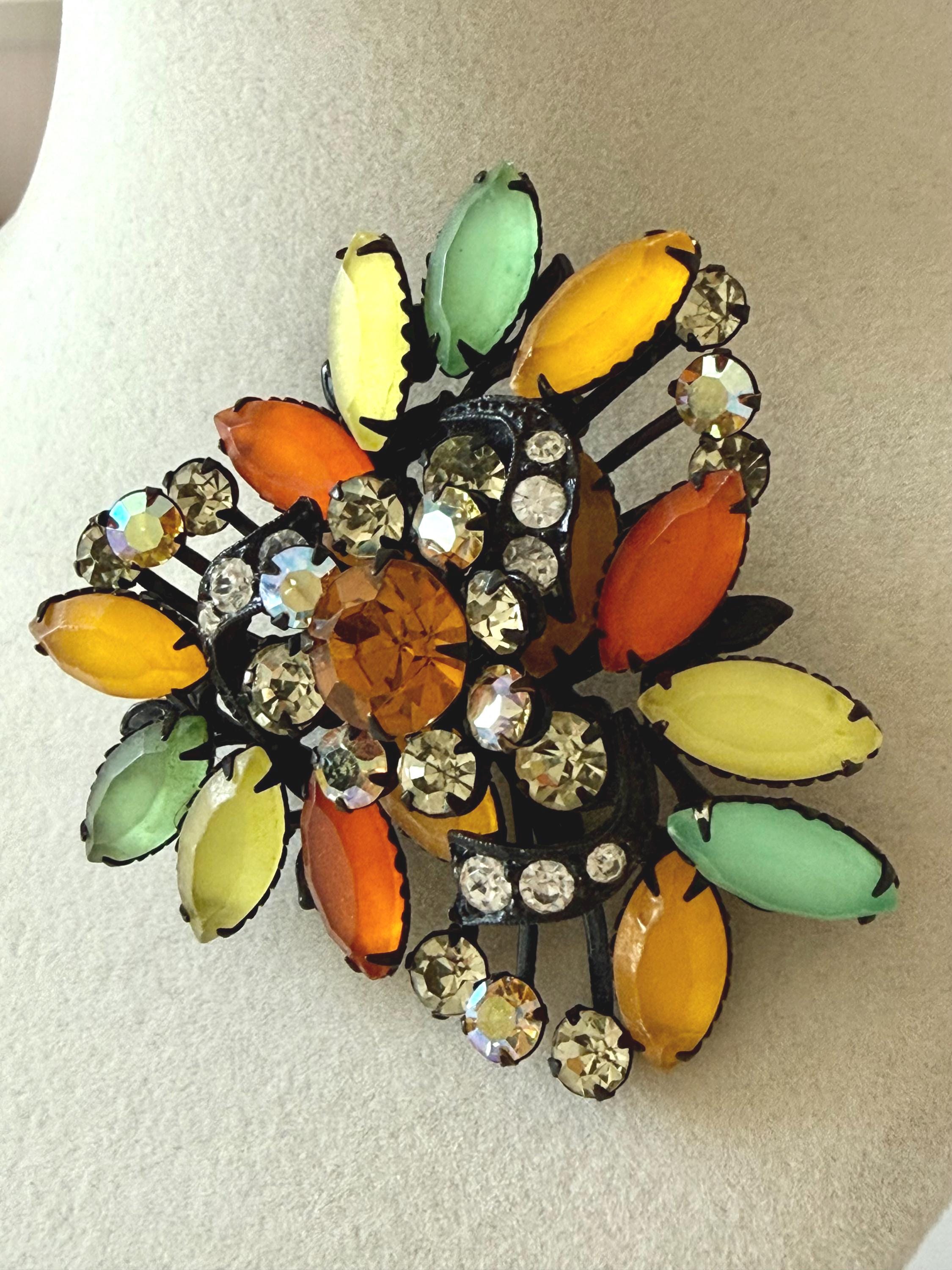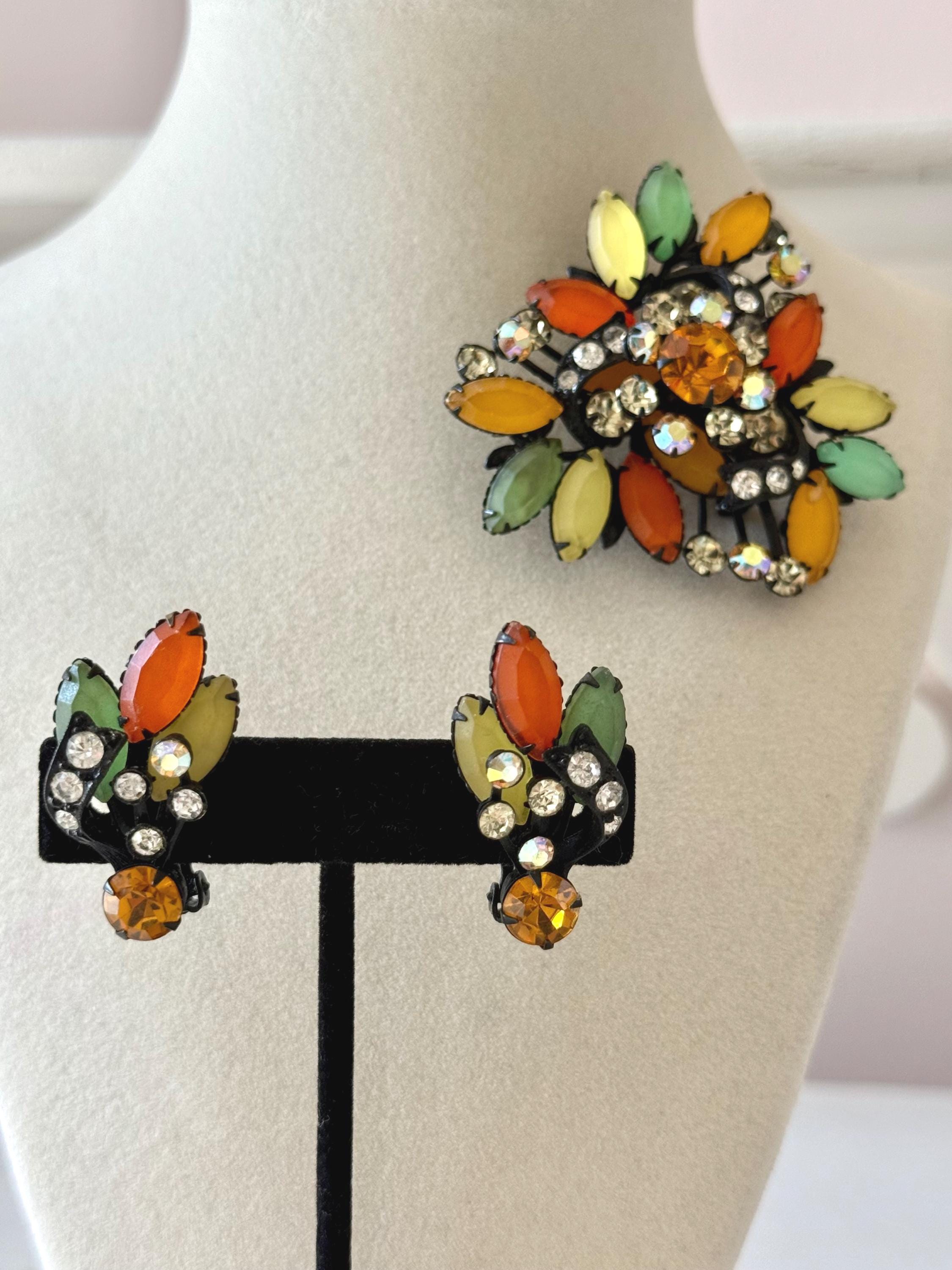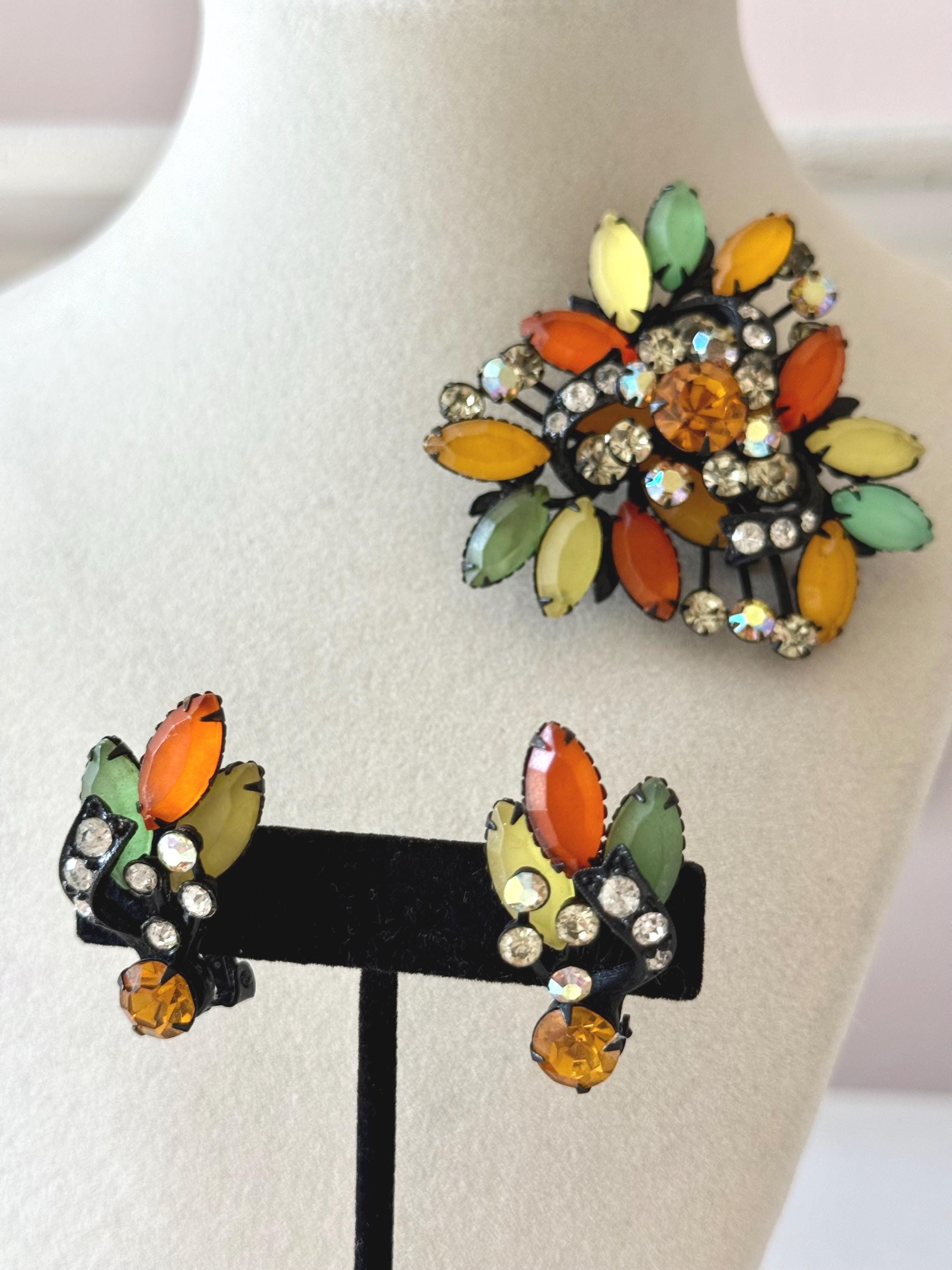 This listing is for a fantastic vintage set of brooch and earrings, unsigned. Measuring 2 1/4" wide and 2 1/4" long, the japanned metal brooch features frosted glass marquises in summery lemon, apricot, orange, and lime with additional sparkle from AB stones. All stones are intact and the clasp is secure. The earrings are 1 3/8" long with secure clip backs. All stones are intact but it appears that some have been replaced with stones that are not the original size. This set is so unique and so very sunny!