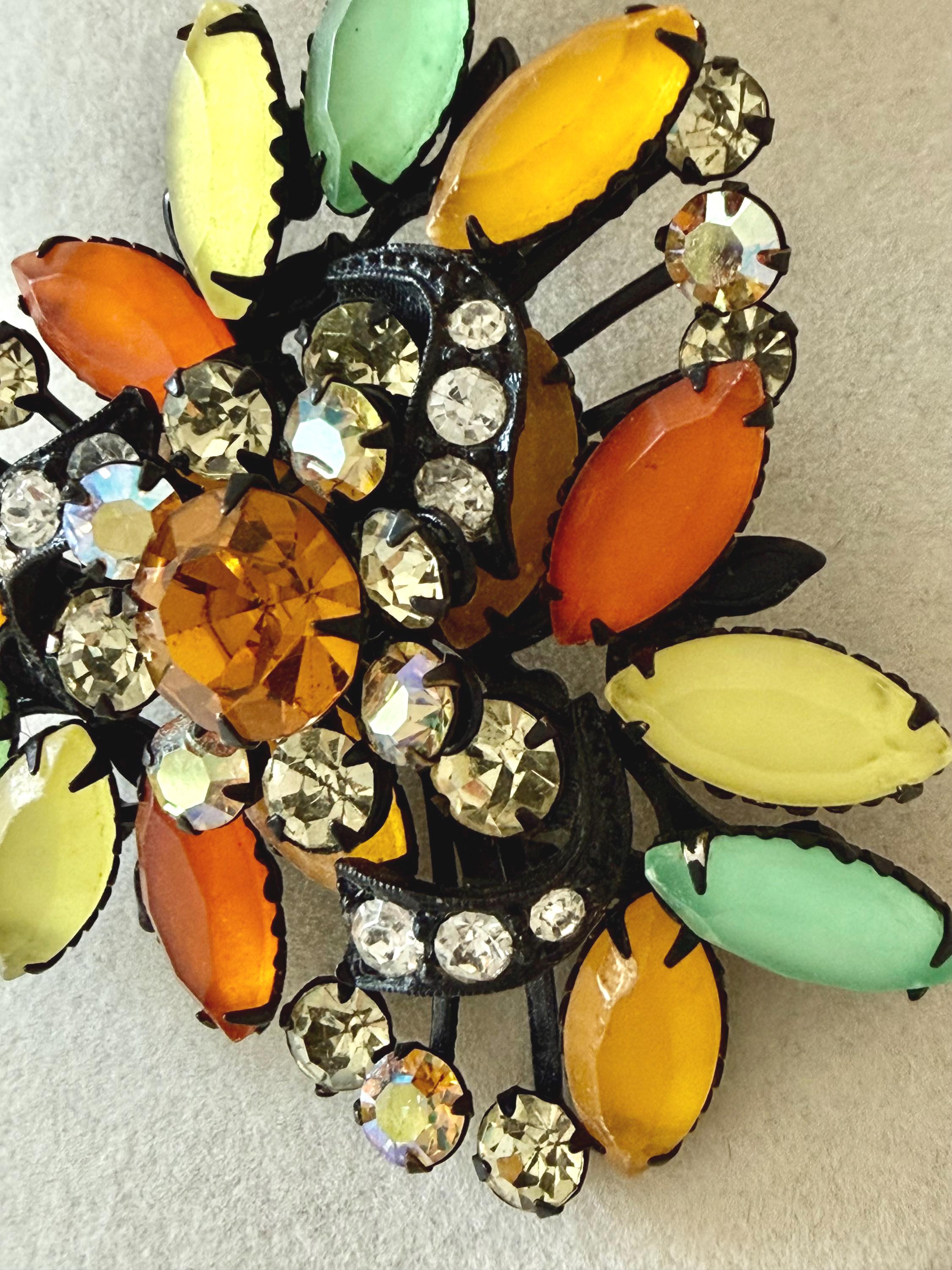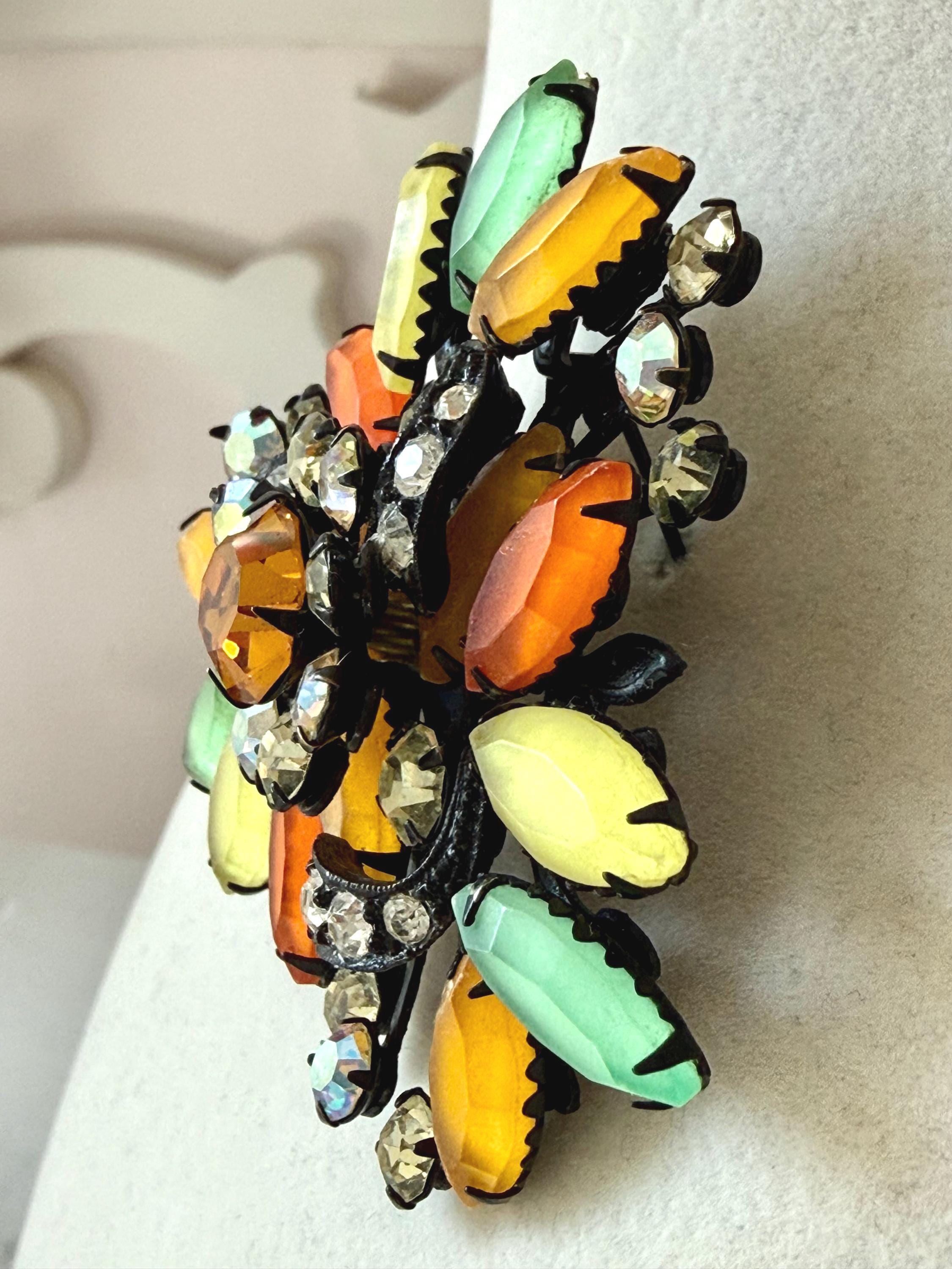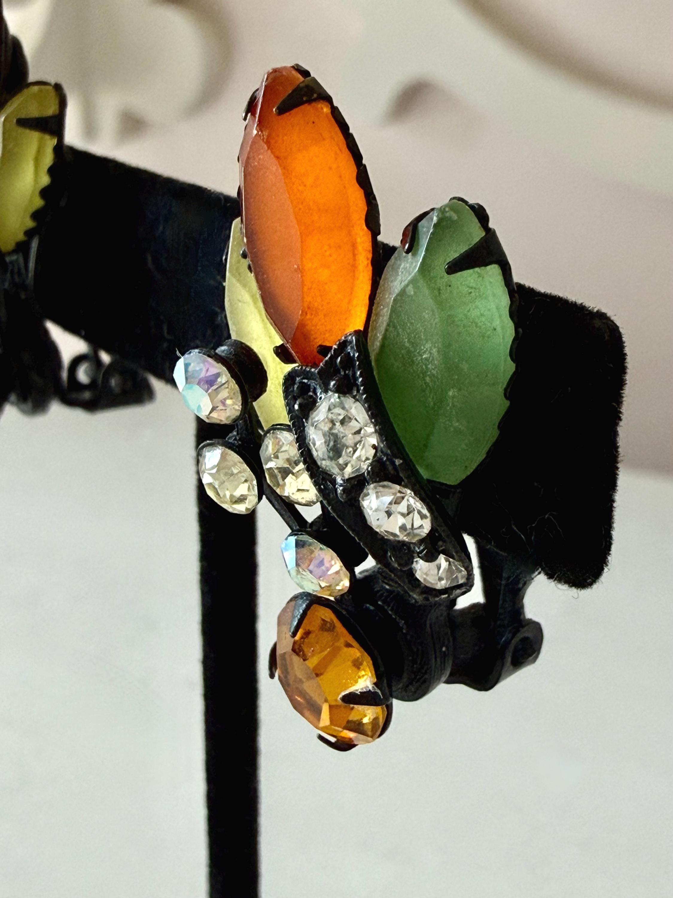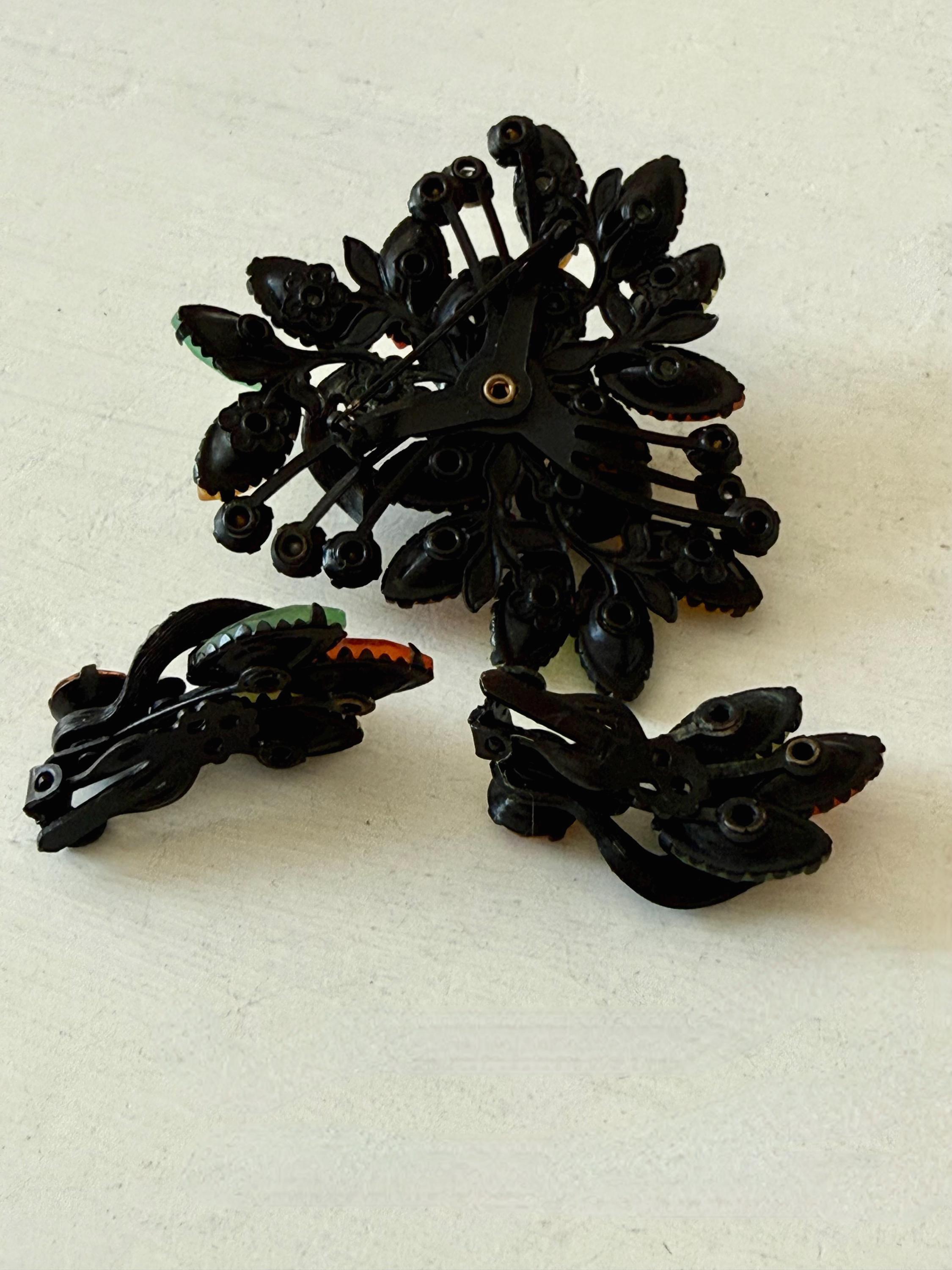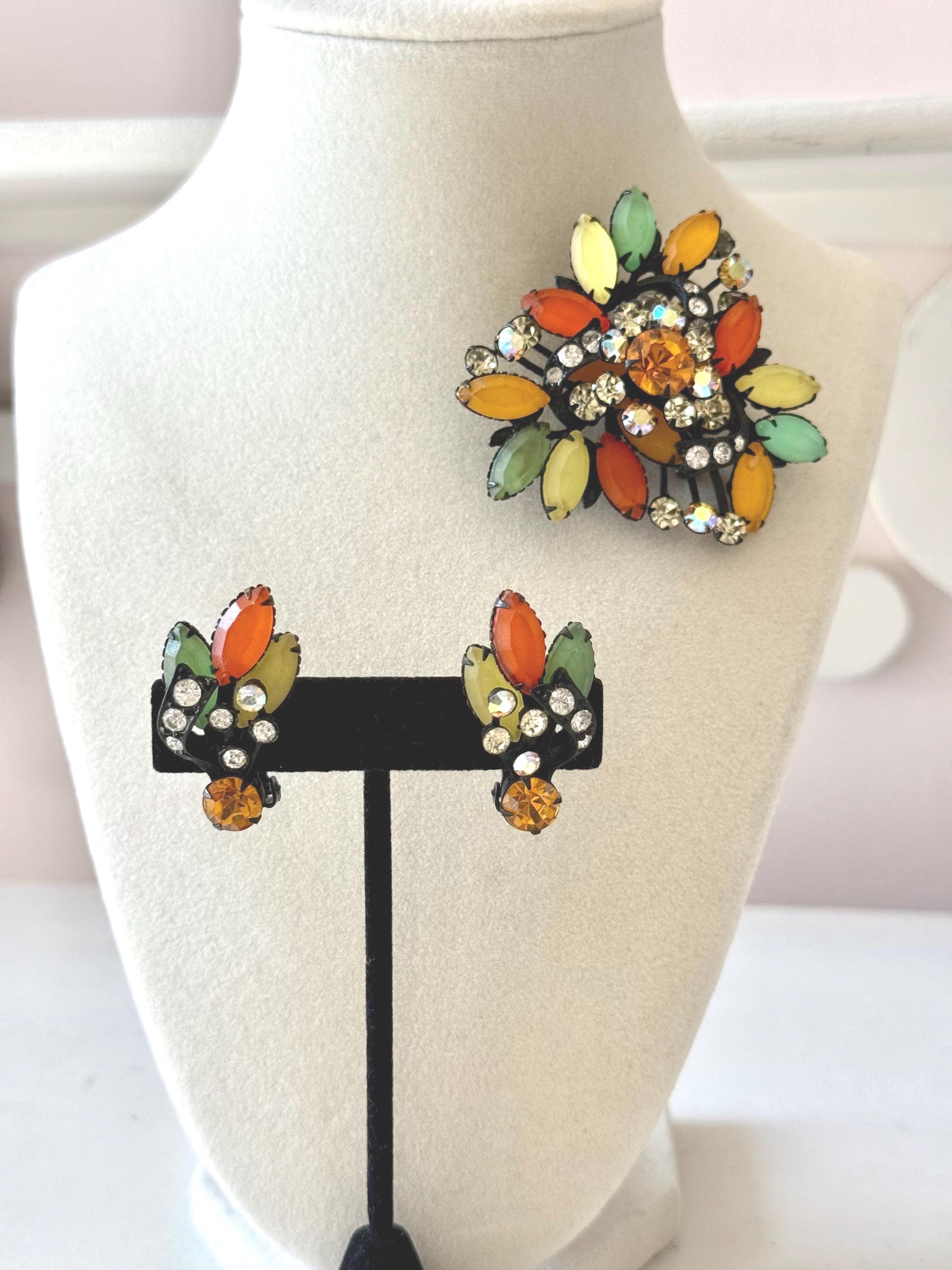 This listing is for a fantastic vintage set of brooch and earrings, unsigned. Measuring 2 1/4" wide and 2 1/4" long, the japanned metal brooch features frosted glass marquises in summery lemon, apricot, orange, and lime with additional sparkle from AB stones. All stones are intact and the clasp is secure. The earrings are 1 3/8" long with secure clip backs. All stones are intact but it appears that some have been replaced with stones that are not the original size. This set is so unique and so very sunny!