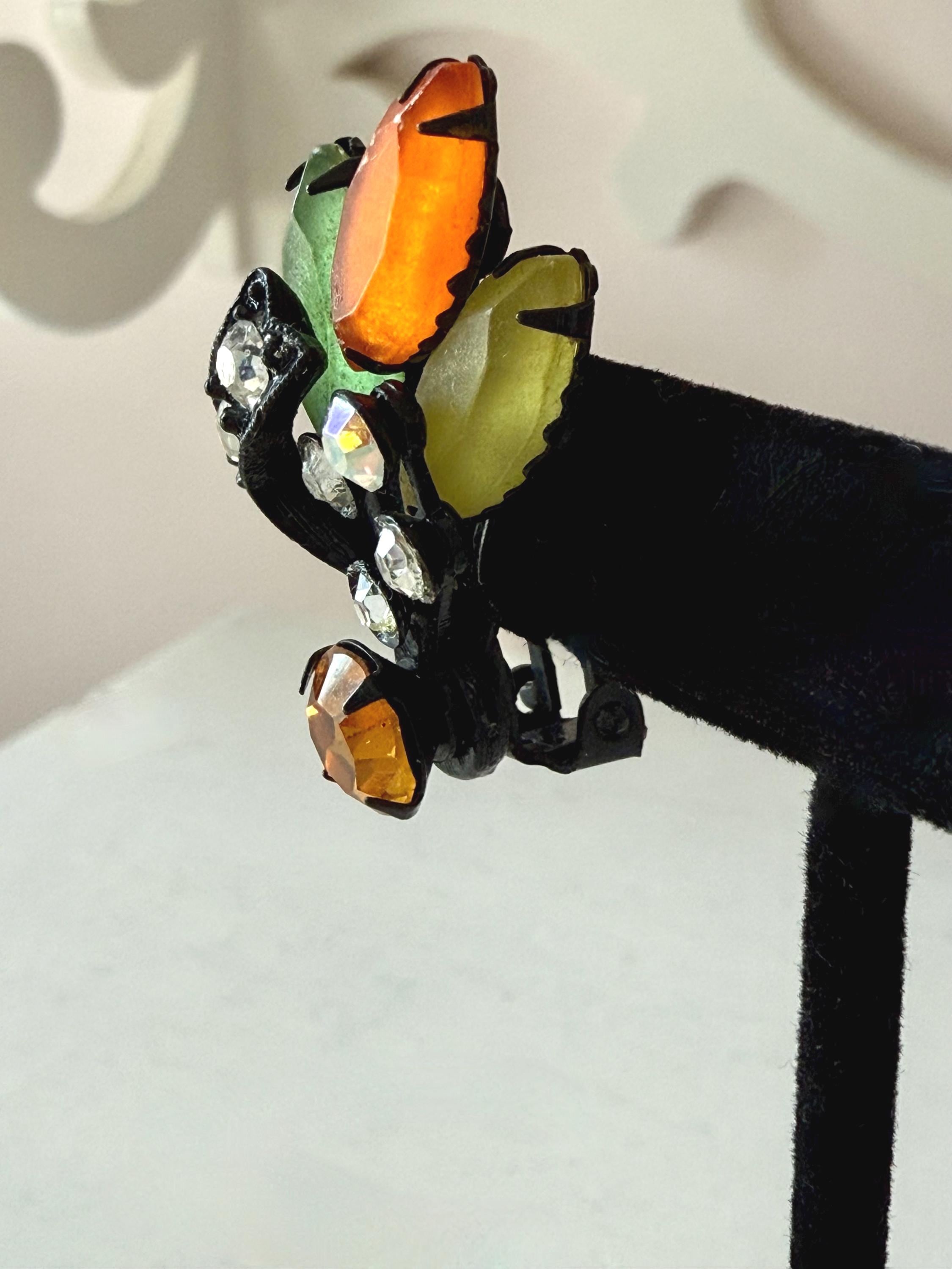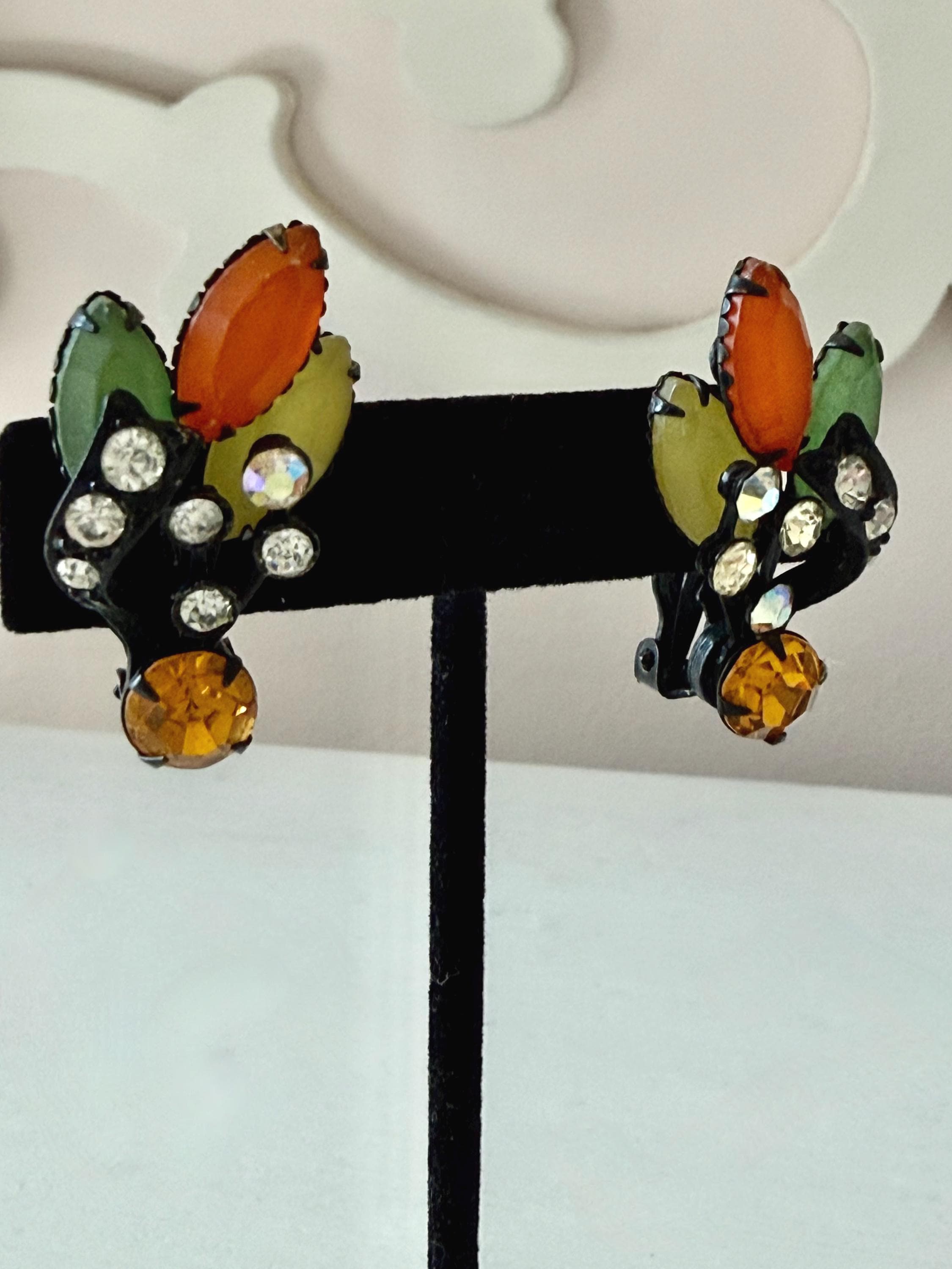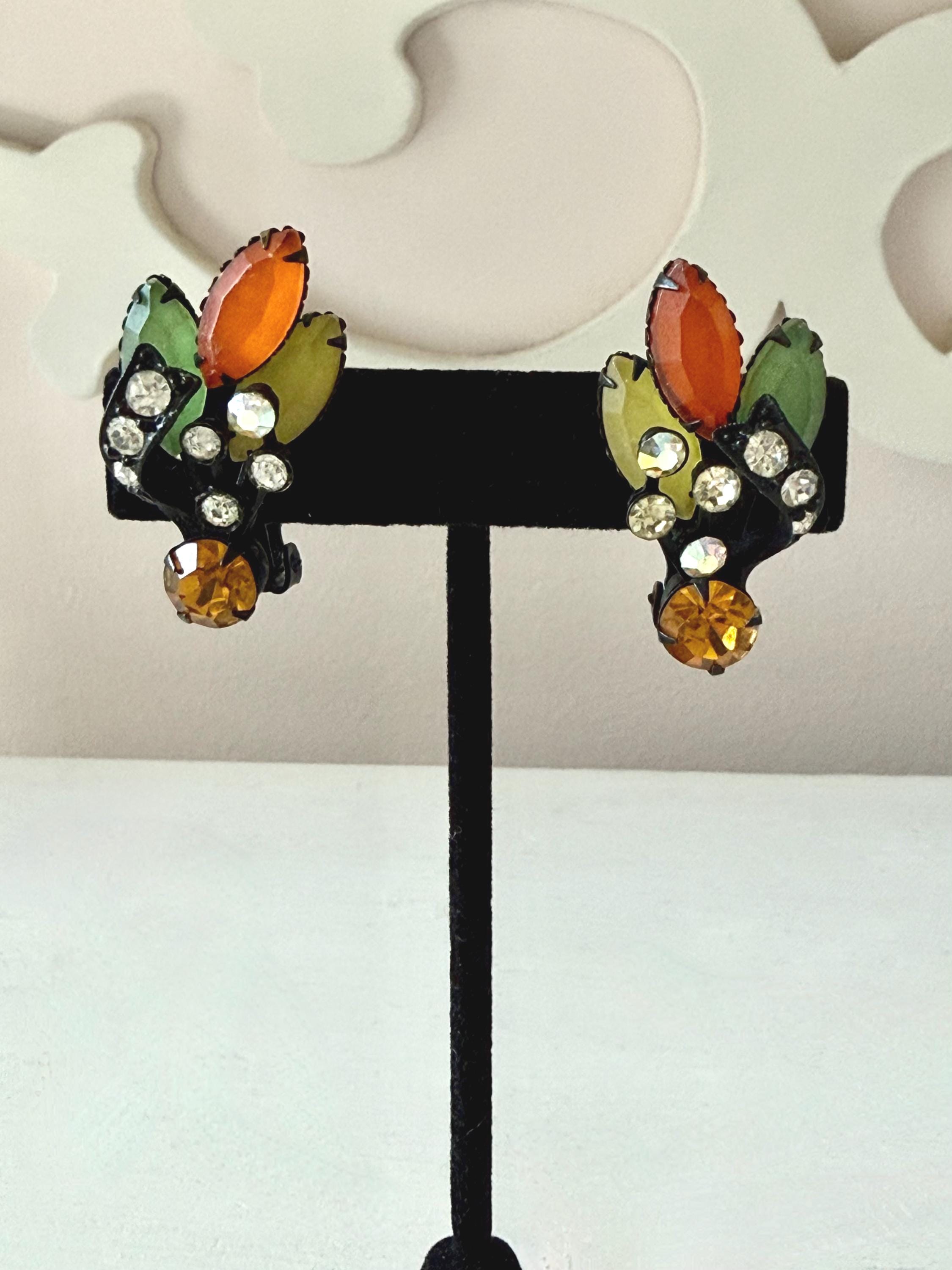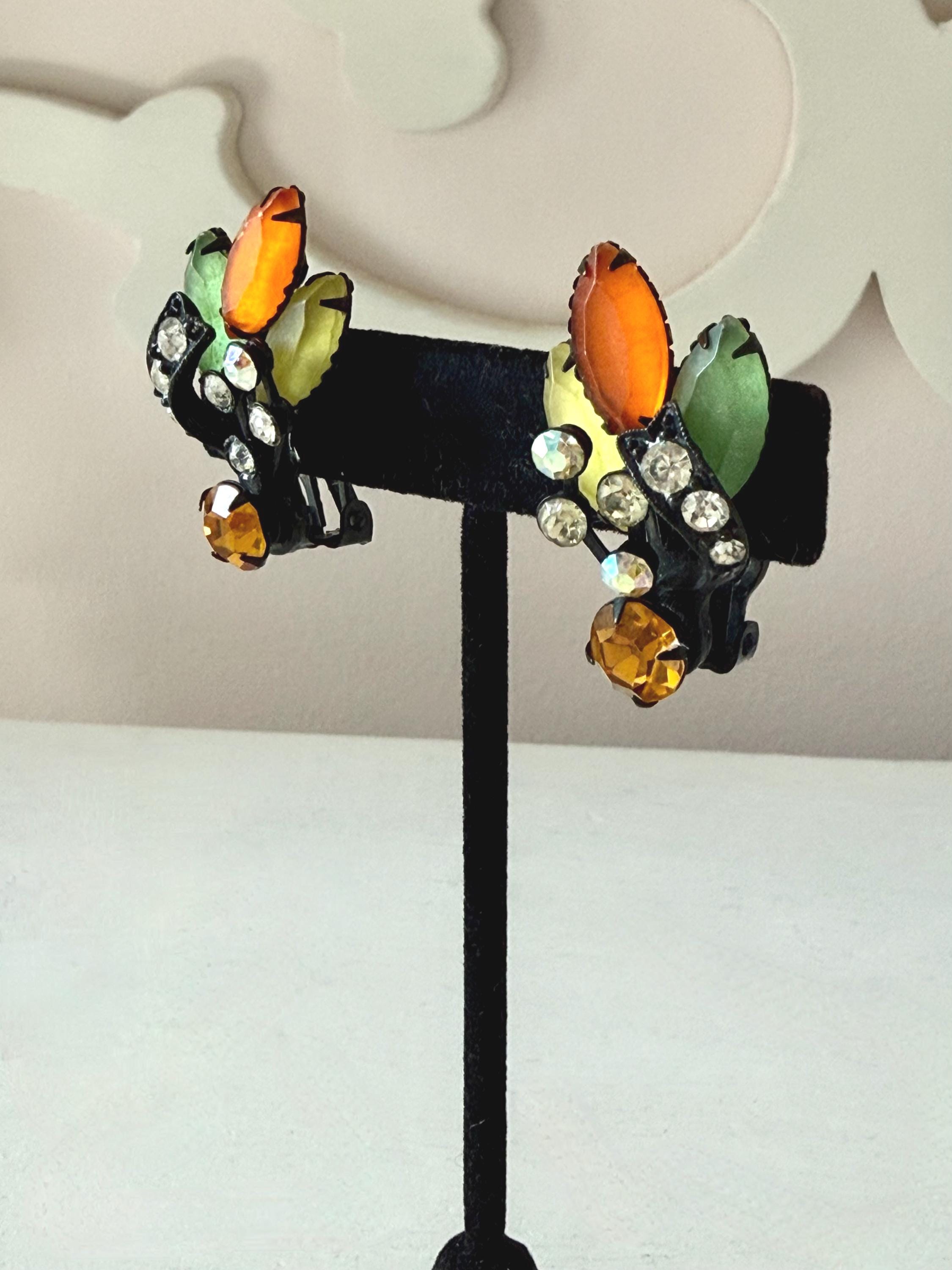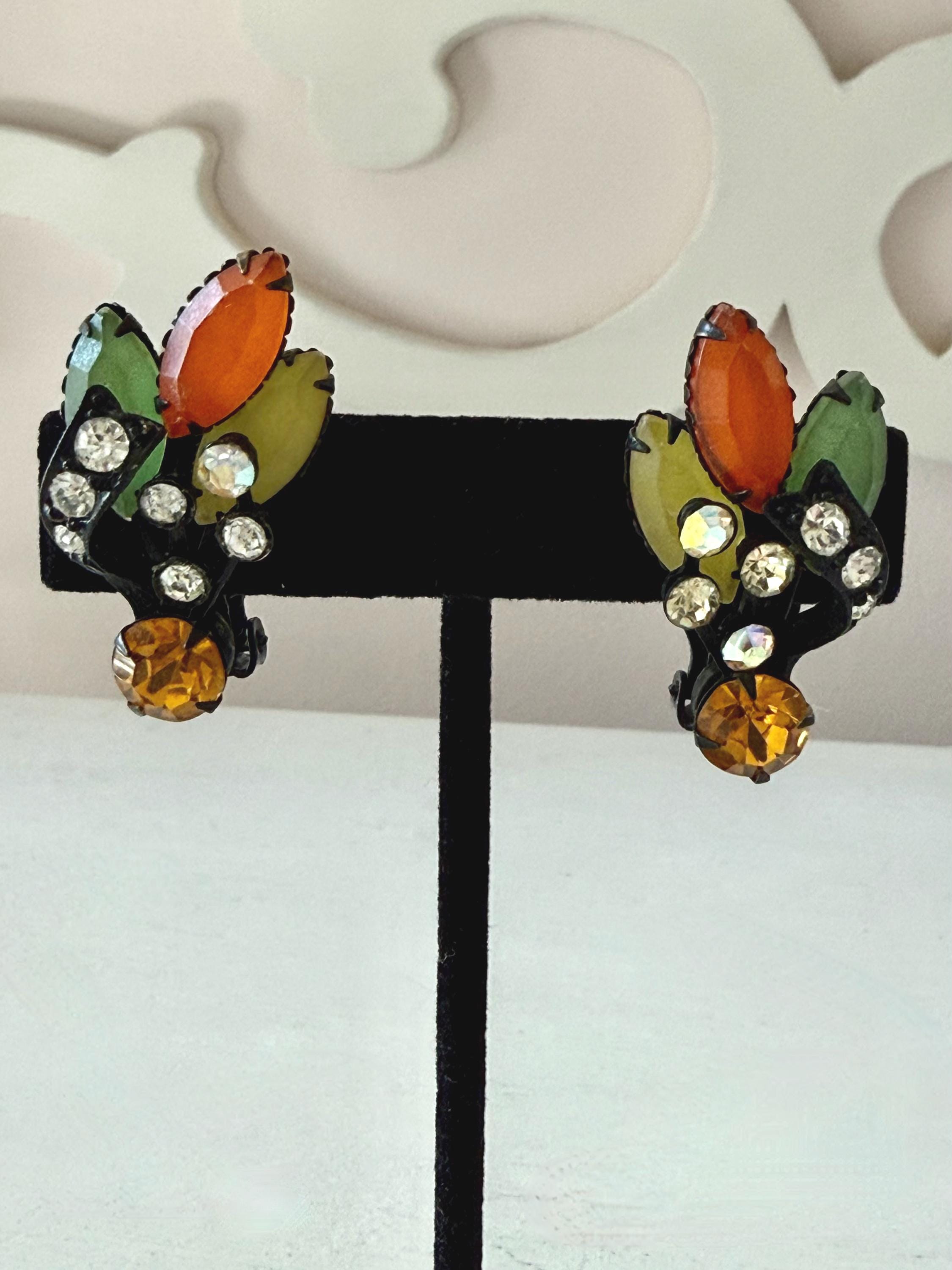 This listing is for a fantastic vintage set of brooch and earrings, unsigned. Measuring 2 1/4" wide and 2 1/4" long, the japanned metal brooch features frosted glass marquises in summery lemon, apricot, orange, and lime with additional sparkle from AB stones. All stones are intact and the clasp is secure. The earrings are 1 3/8" long with secure clip backs. All stones are intact but it appears that some have been replaced with stones that are not the original size. This set is so unique and so very sunny!