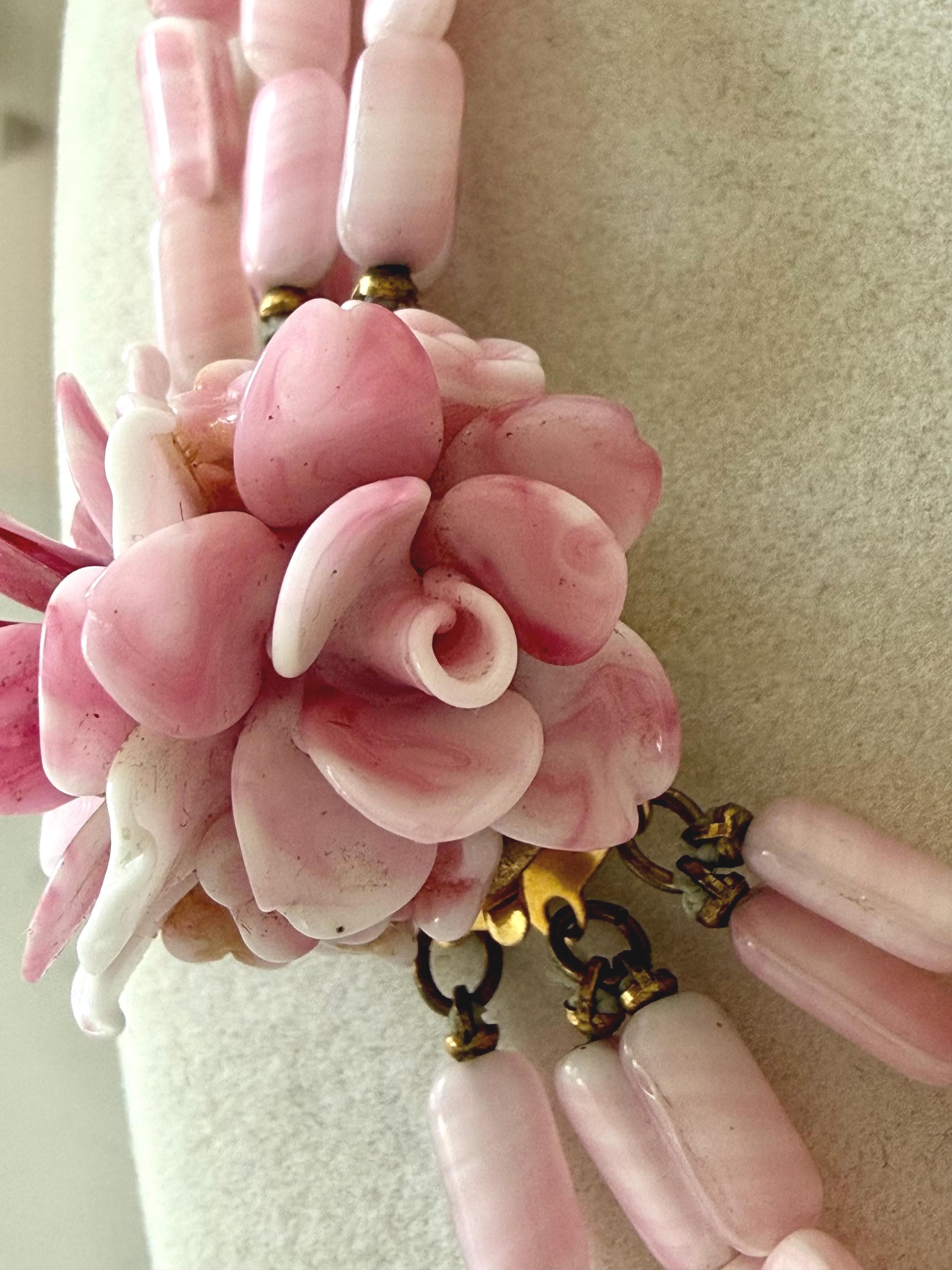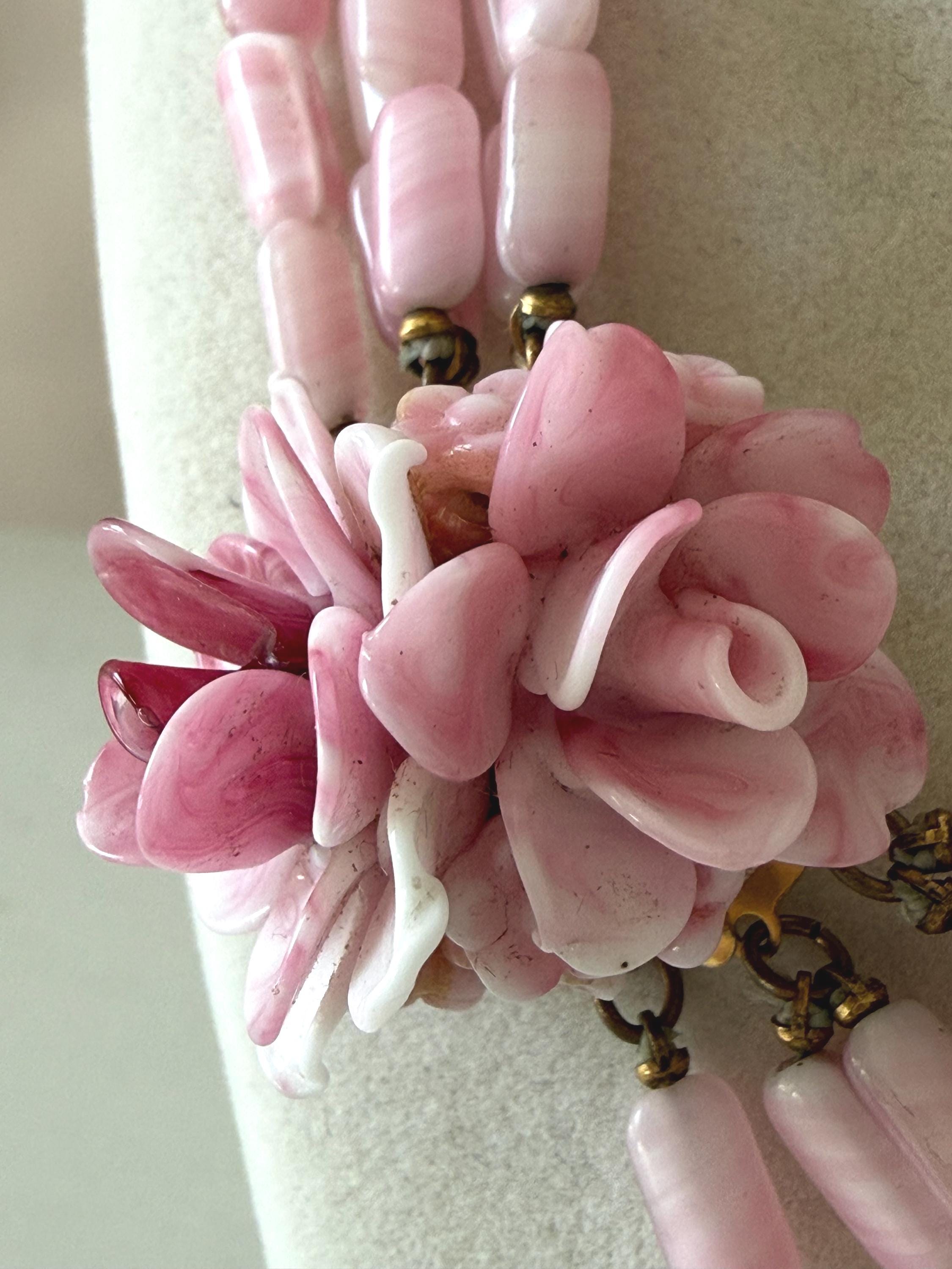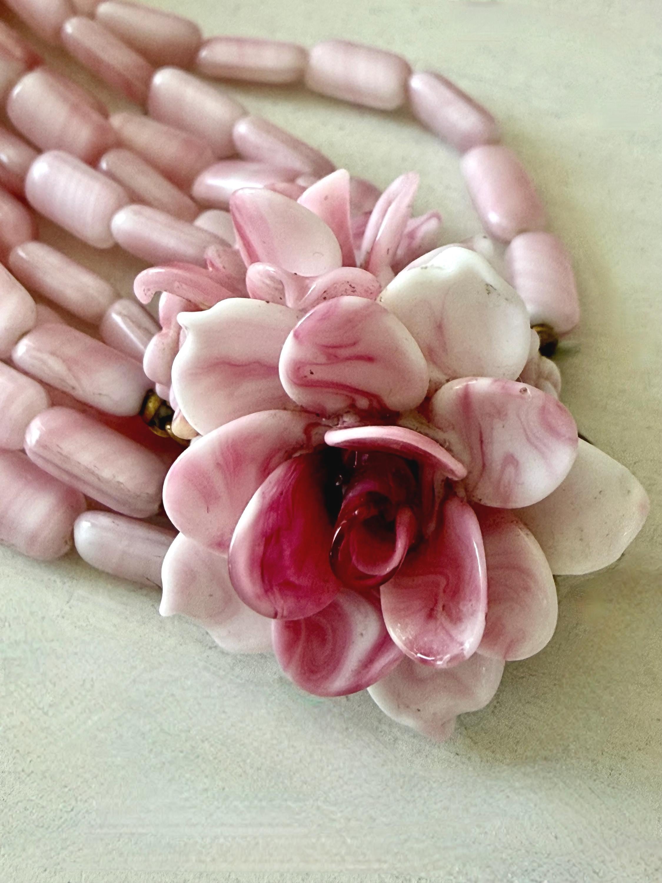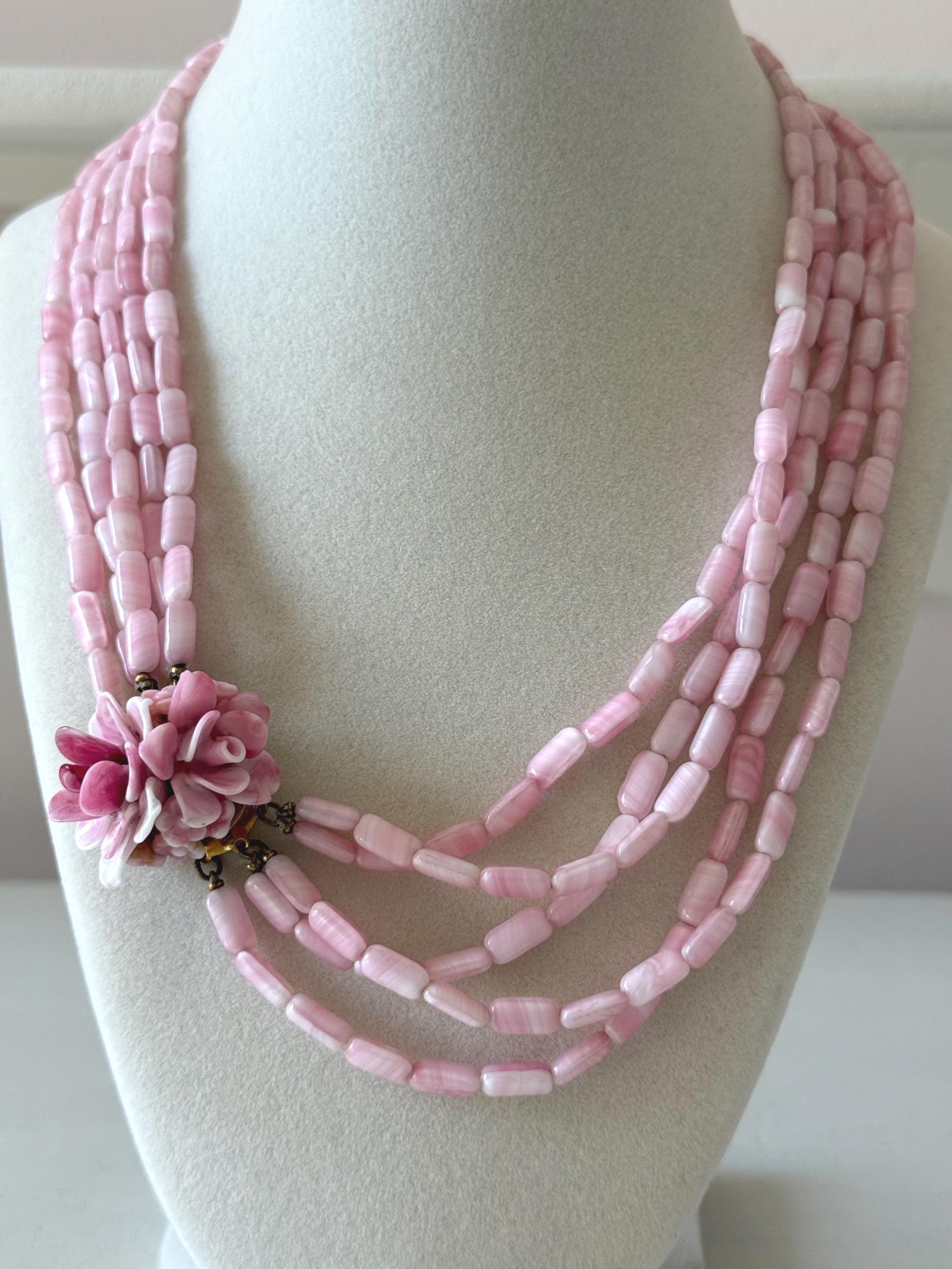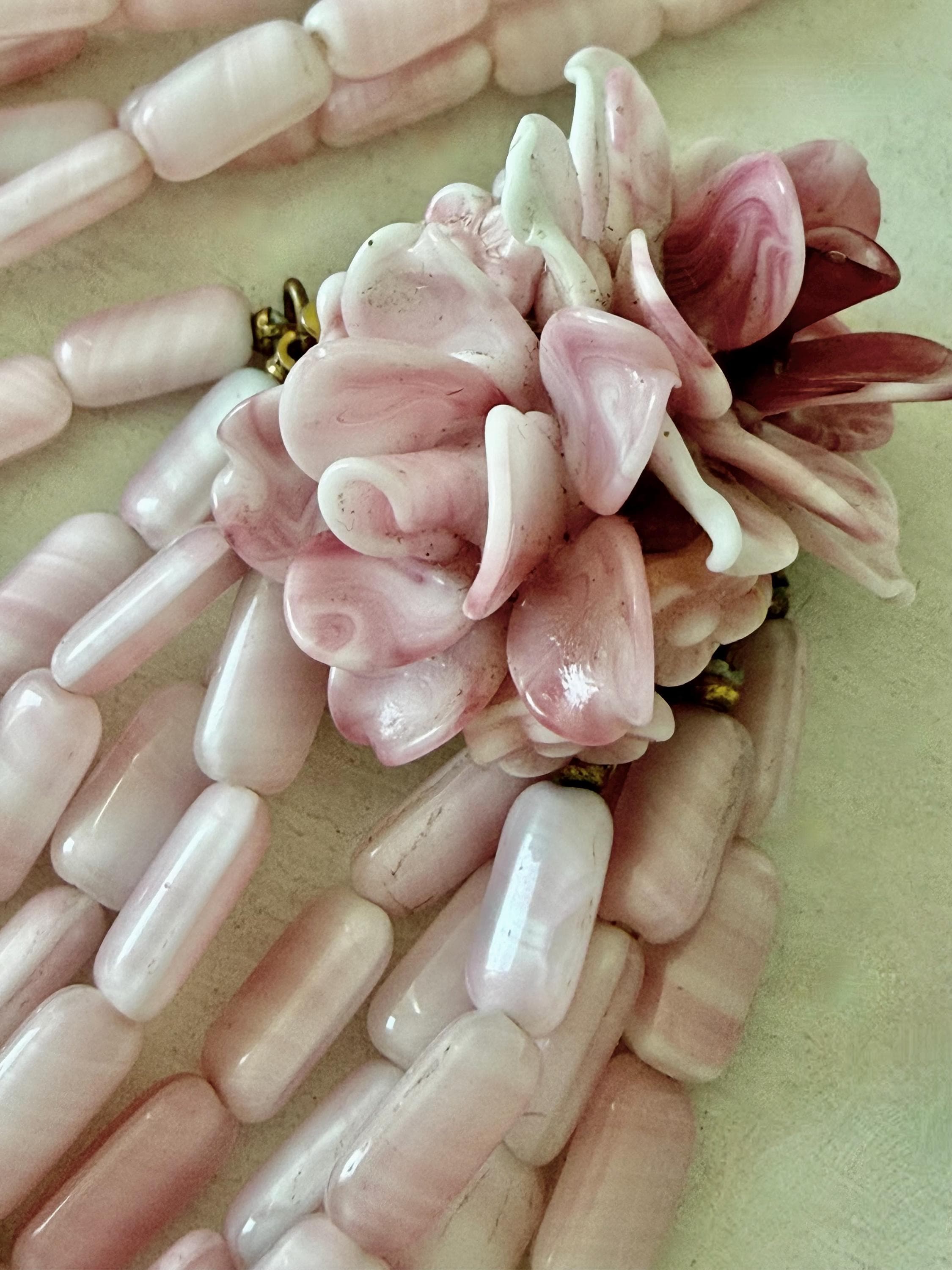 This listing is for a gorgeous vintage necklace by Hattie Carnegie. Measuring 18" in length, the necklace features five strands of beautiful pale pink and white glass beads. But the star of this necklace is the clasp of two large glass rosettes. The clasp is secure and overall, it is in excellent vintage condition. So perfect for spring and summer!