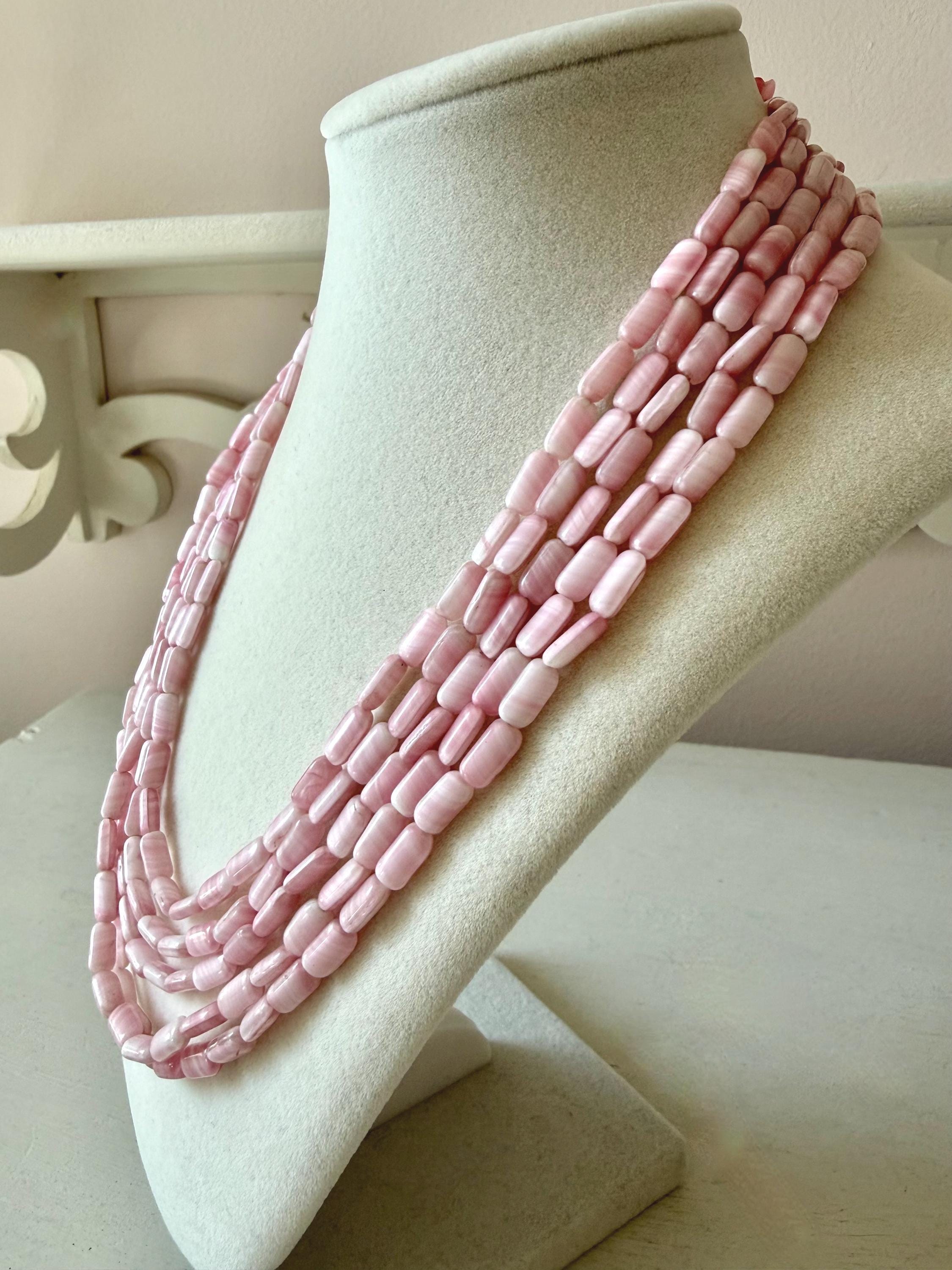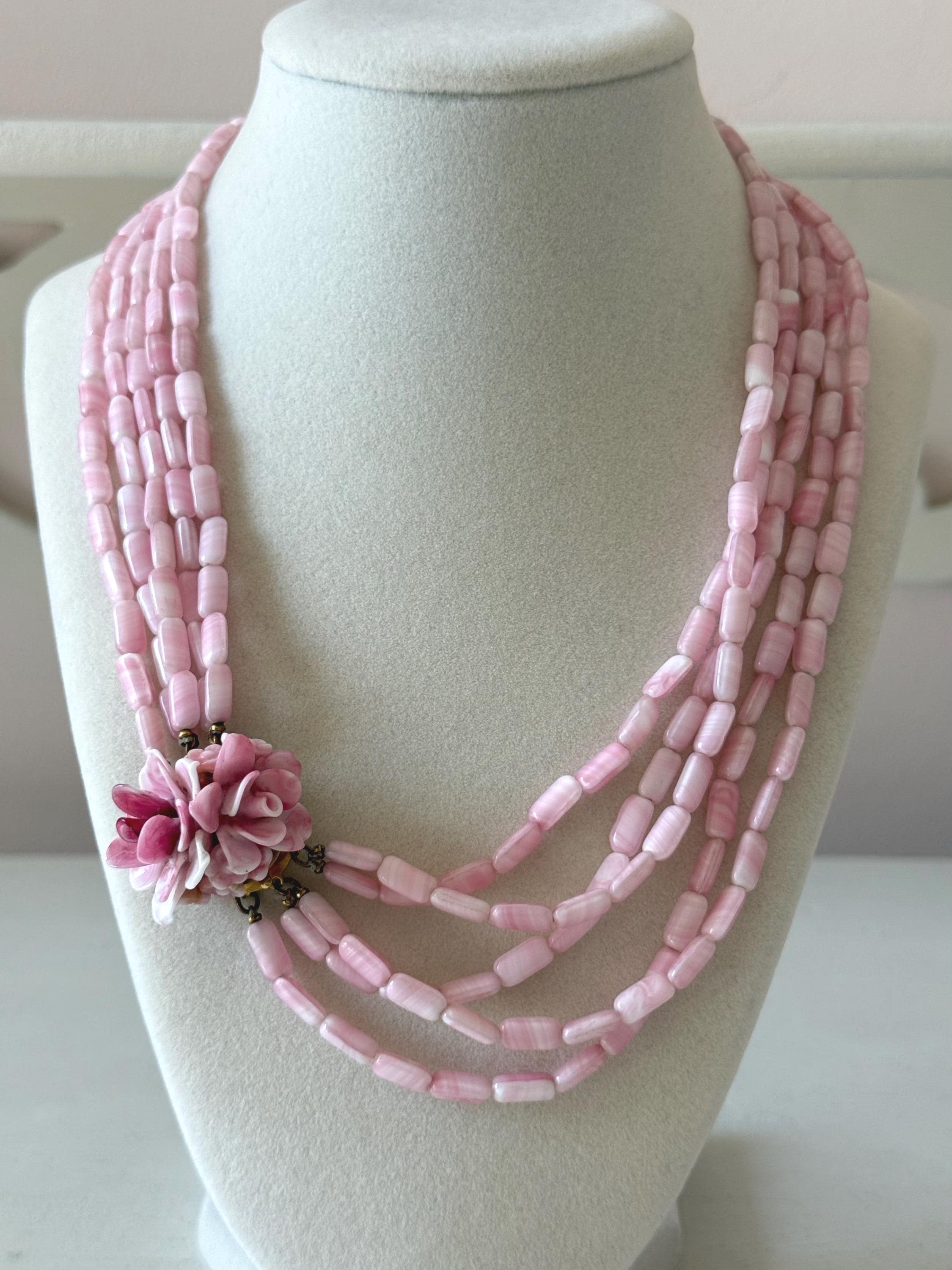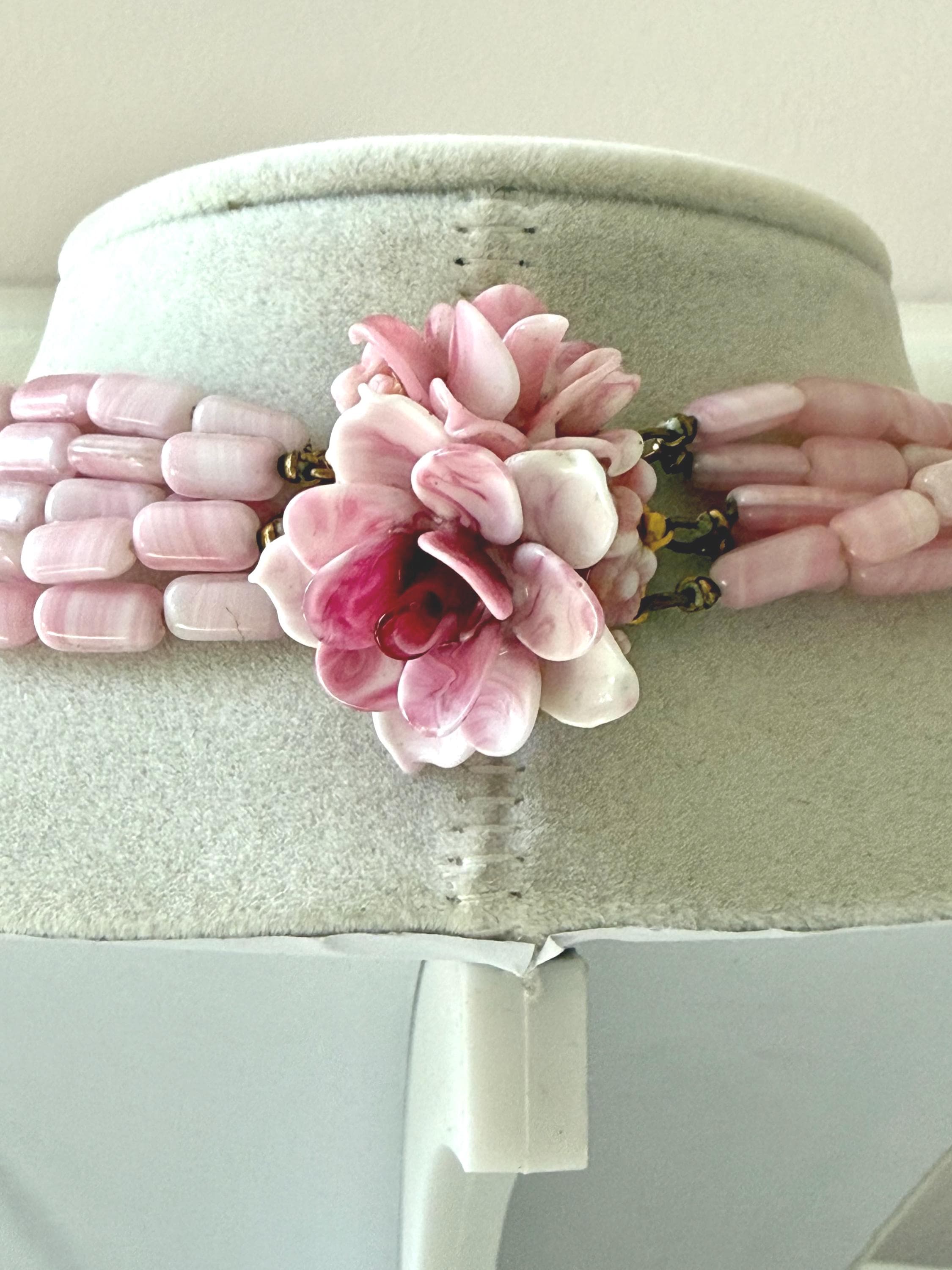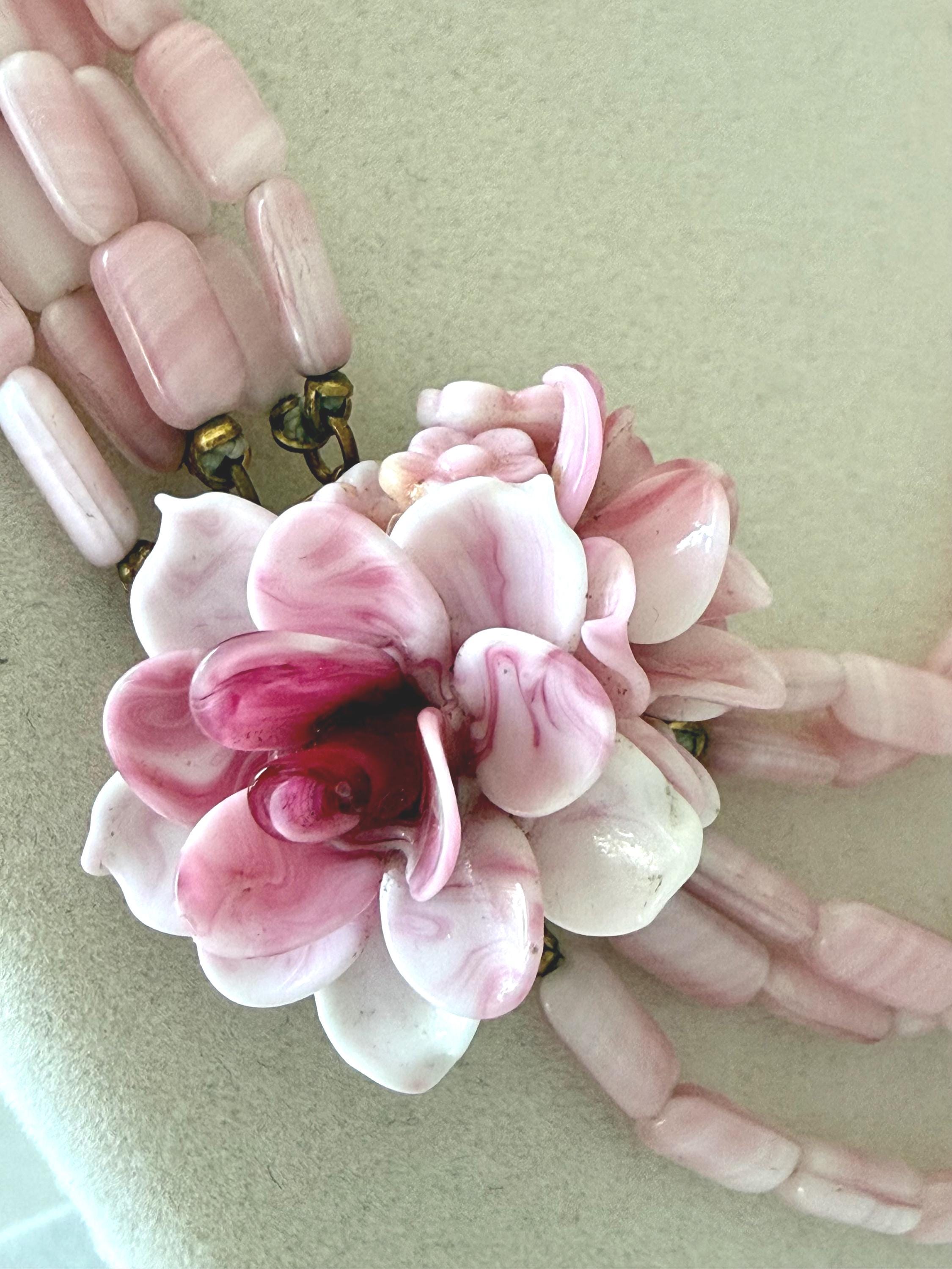 This listing is for a gorgeous vintage necklace by Hattie Carnegie. Measuring 18" in length, the necklace features five strands of beautiful pale pink and white glass beads. But the star of this necklace is the clasp of two large glass rosettes. The clasp is secure and overall, it is in excellent vintage condition. So perfect for spring and summer!