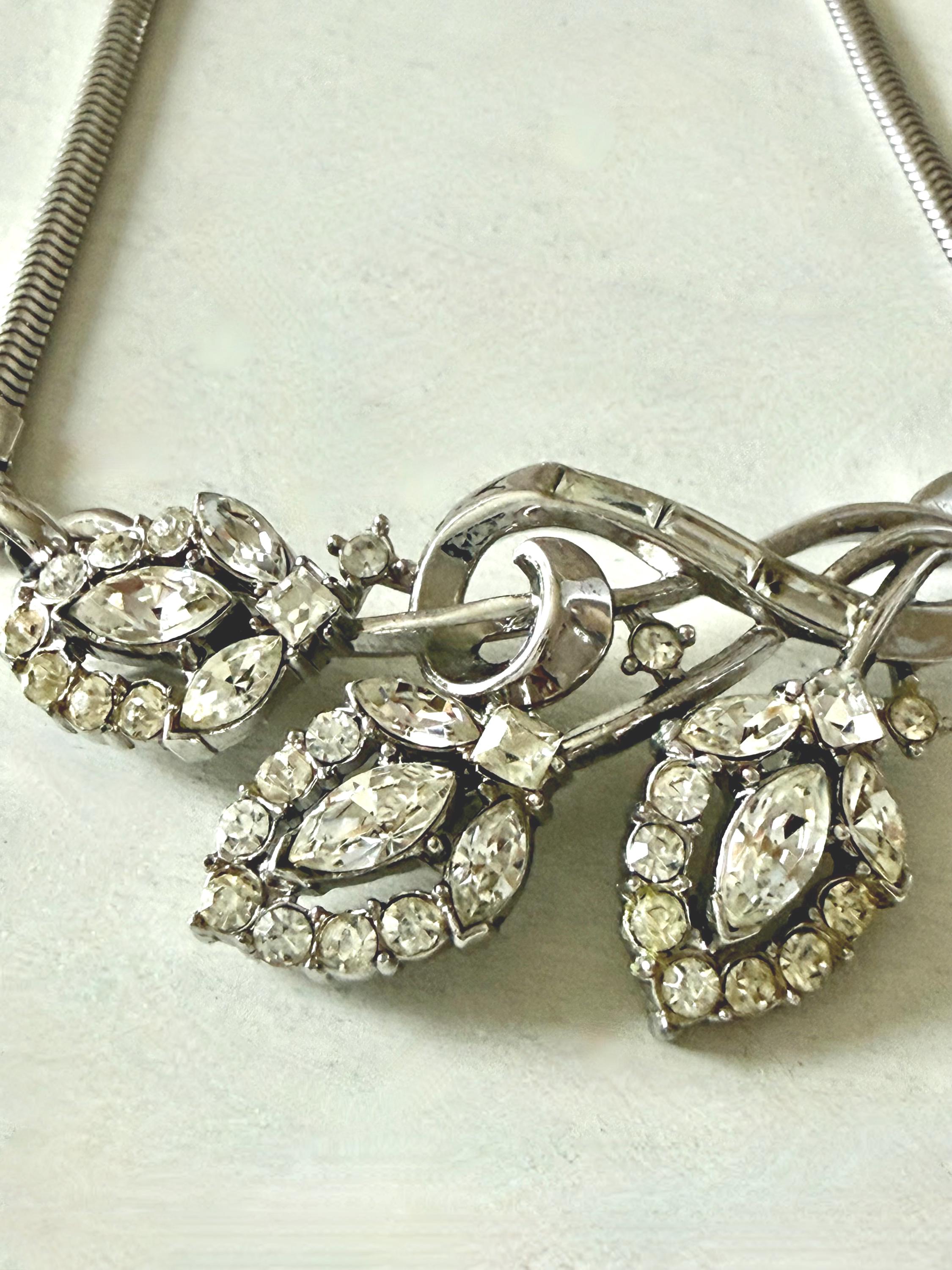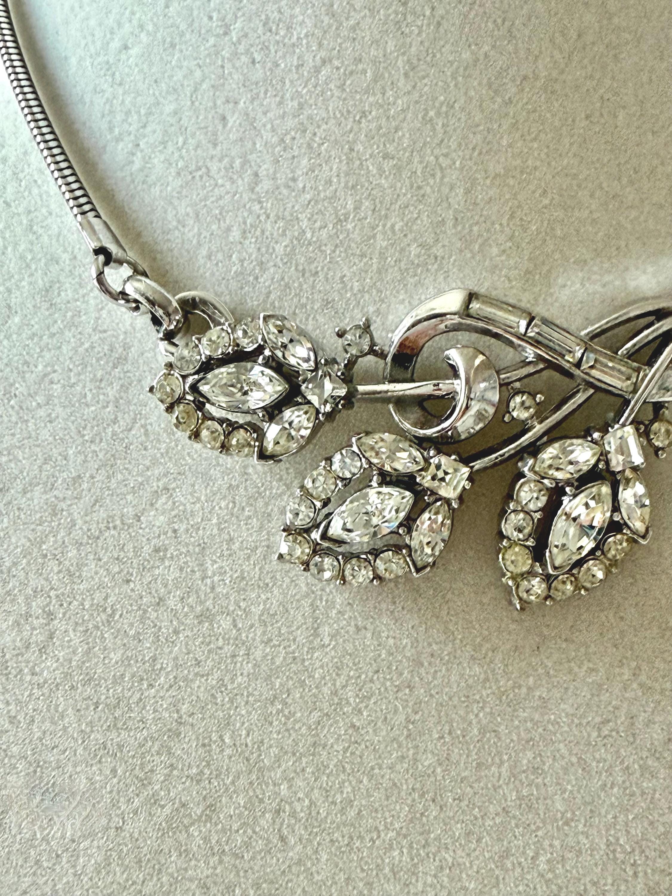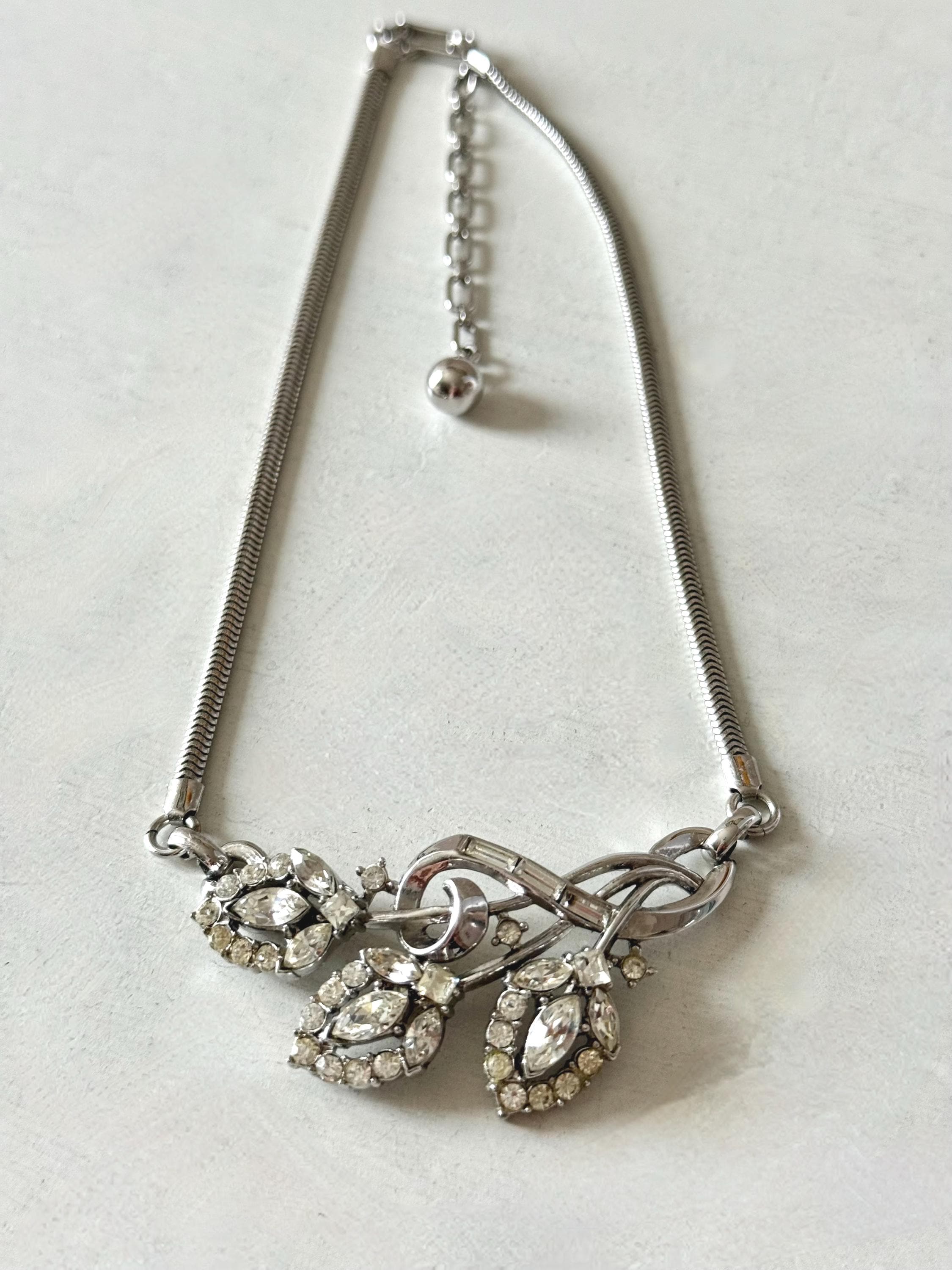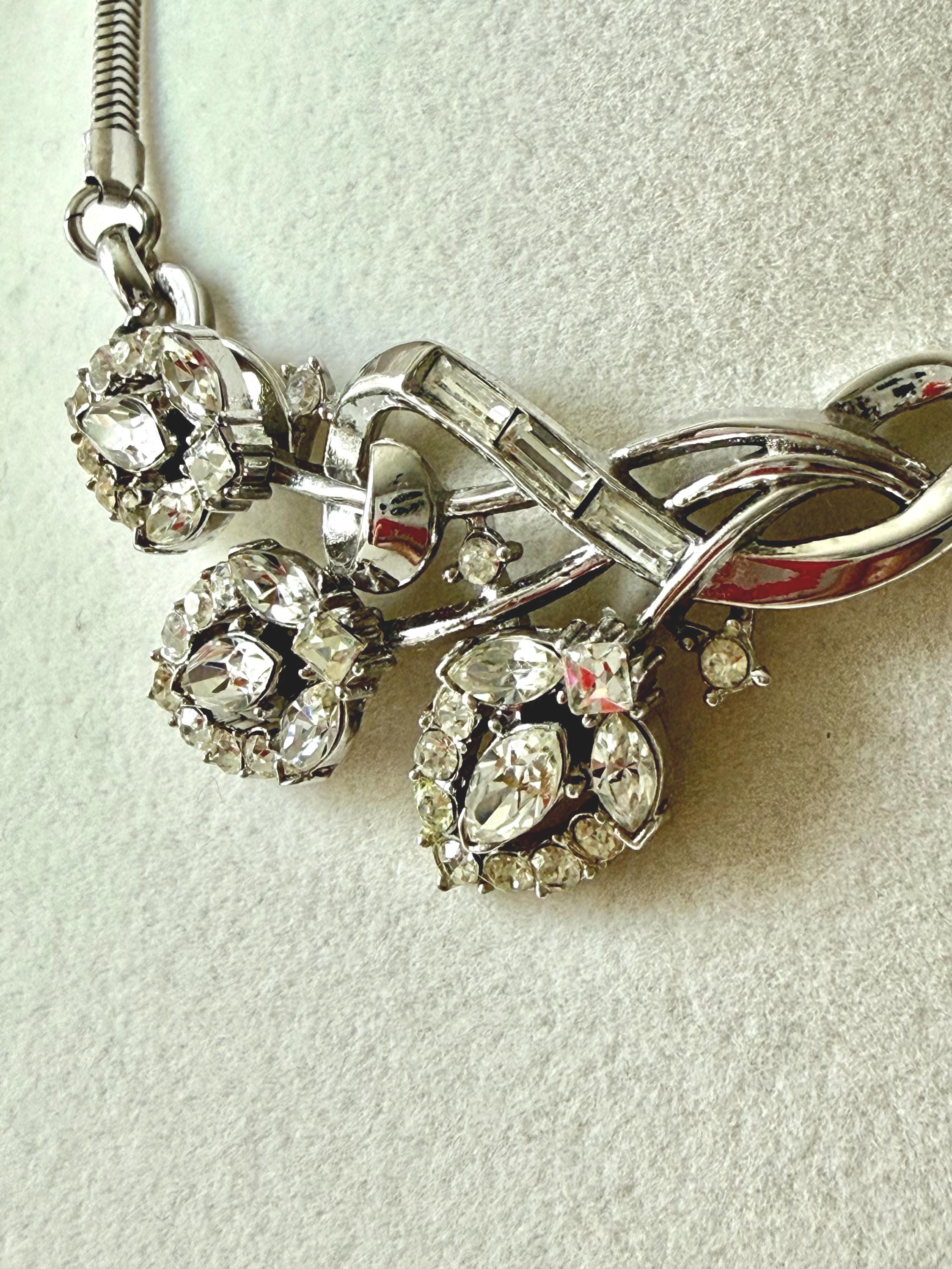 This listing is for a beautiful vintage necklace from Trifari's 1953 "Flirtation" series. Adjustable to 15 3/4", the necklace features a silver tone snake chain and a center pendant that is 2 1/2" wide and 1" high. The three flowers and winding stems are filled with sparkling clear stones, all intact. The hook clasp is secure and it is in very good condition overall. A simple but stunning necklace!