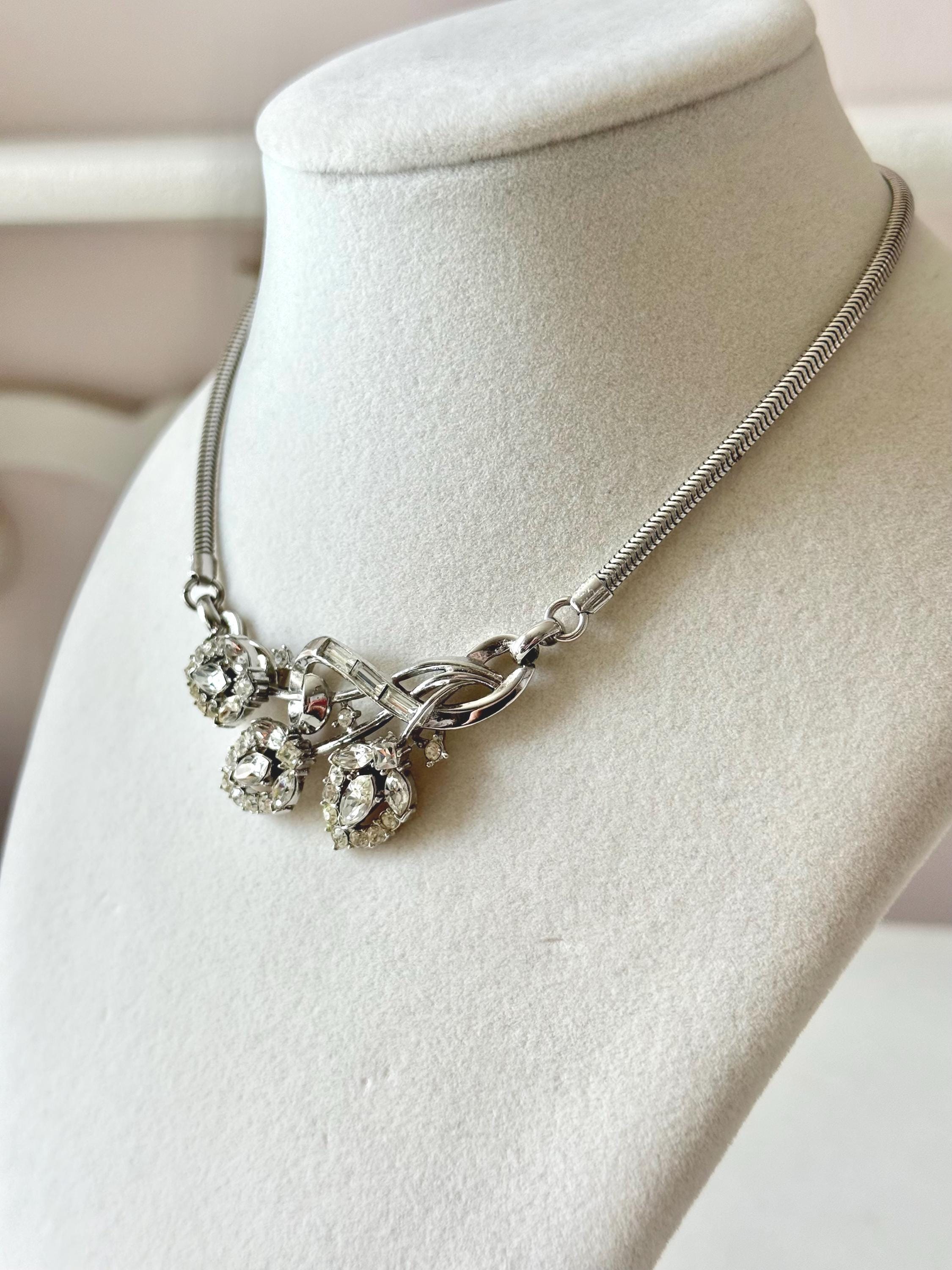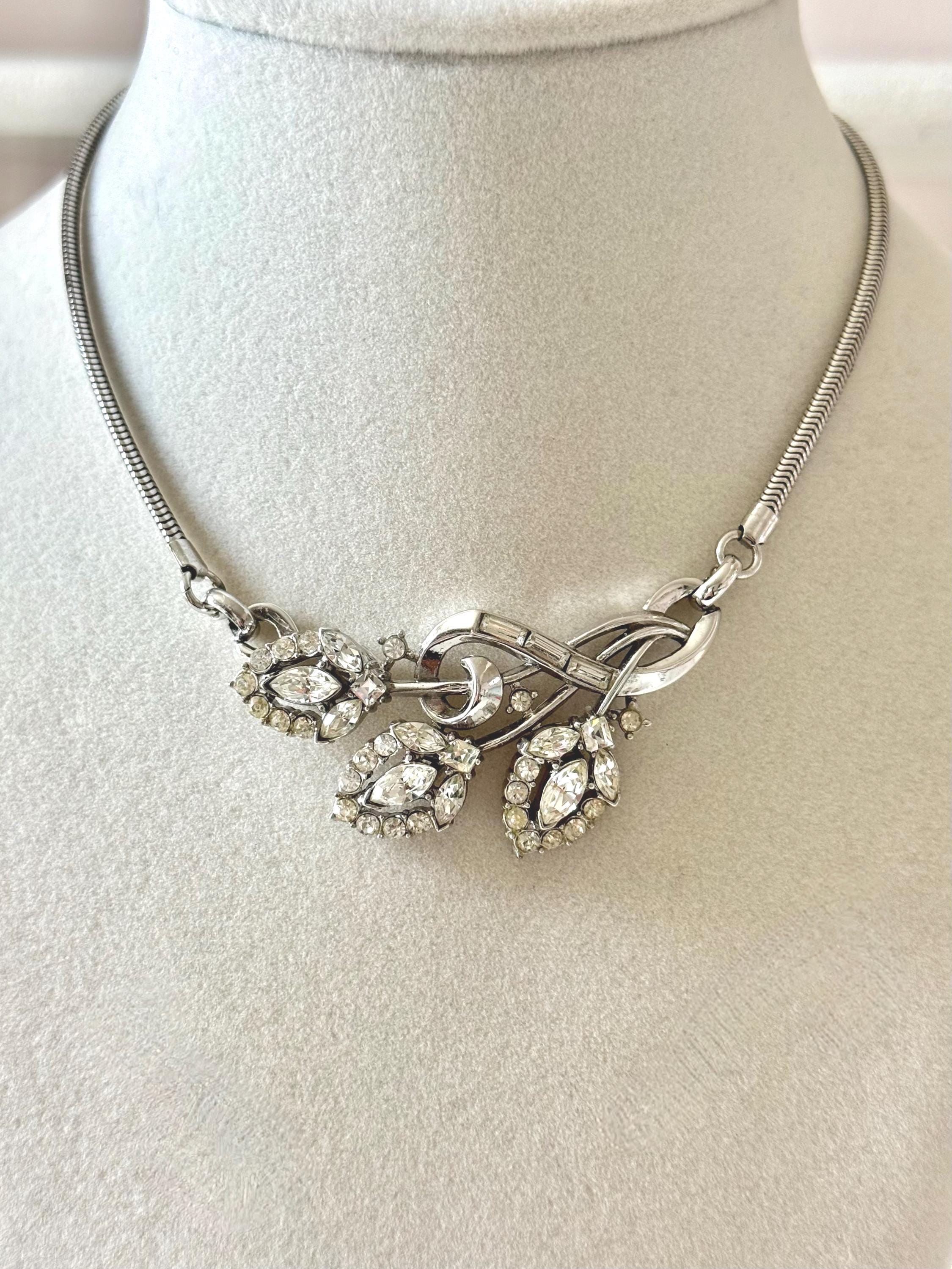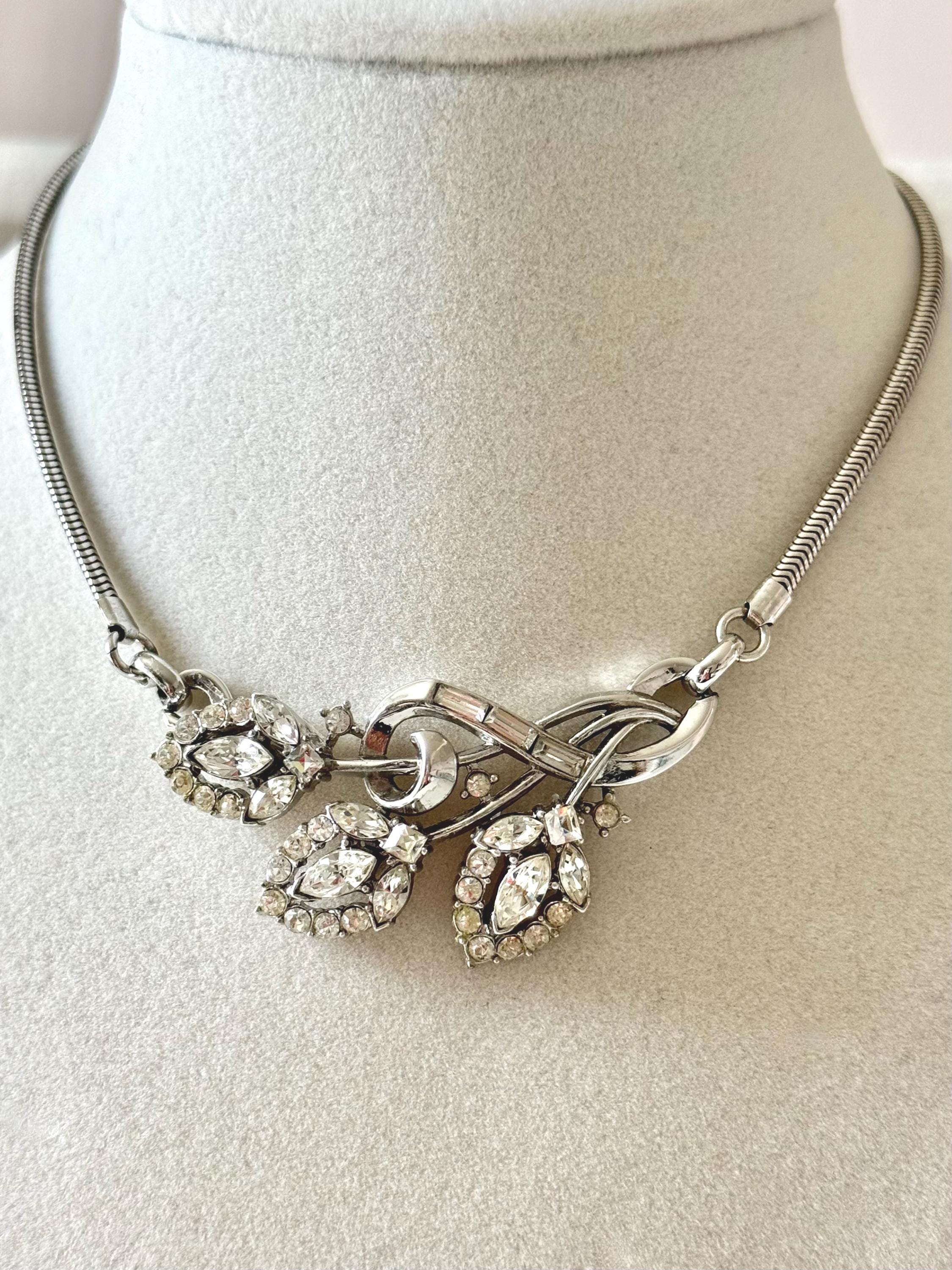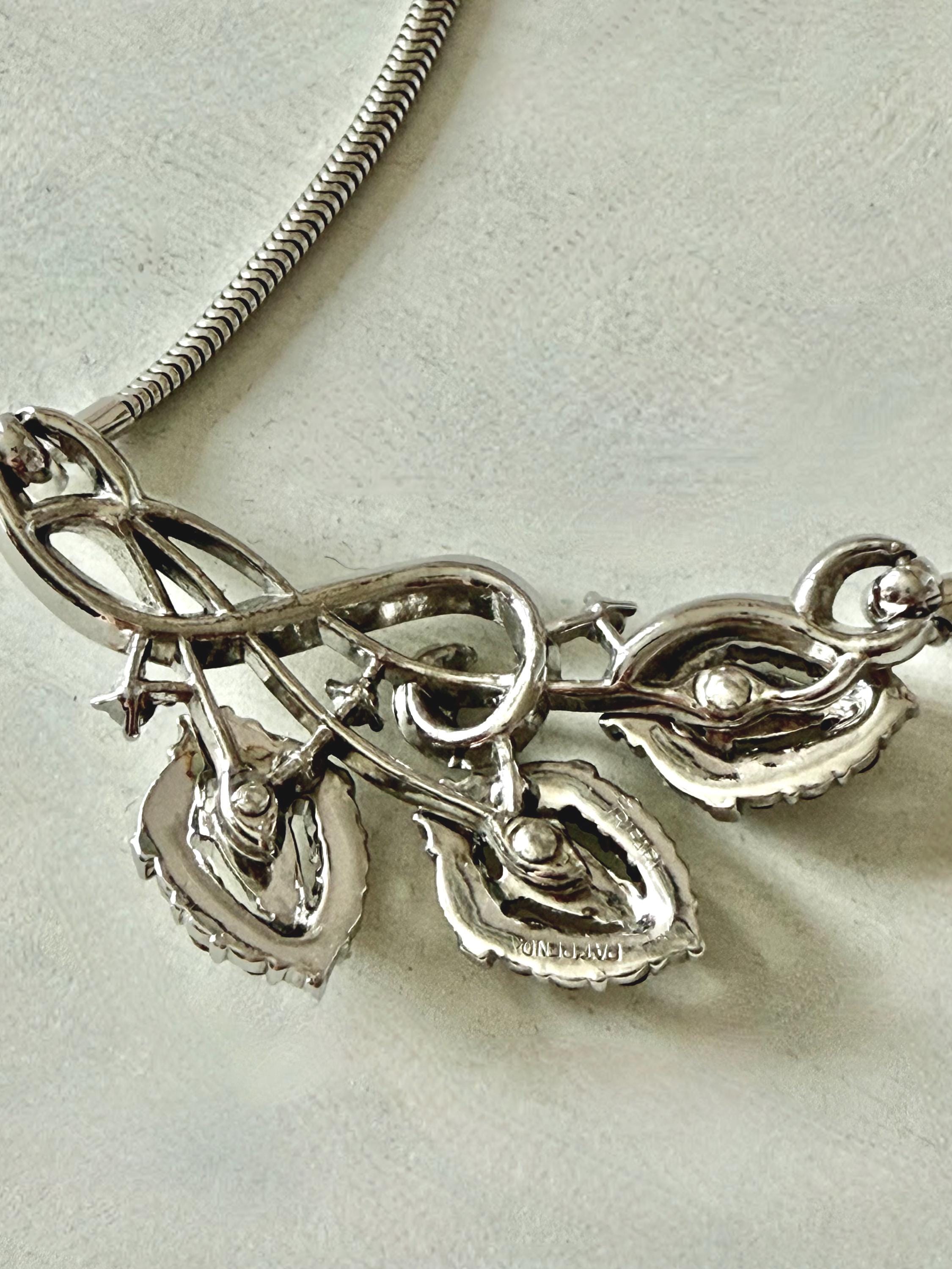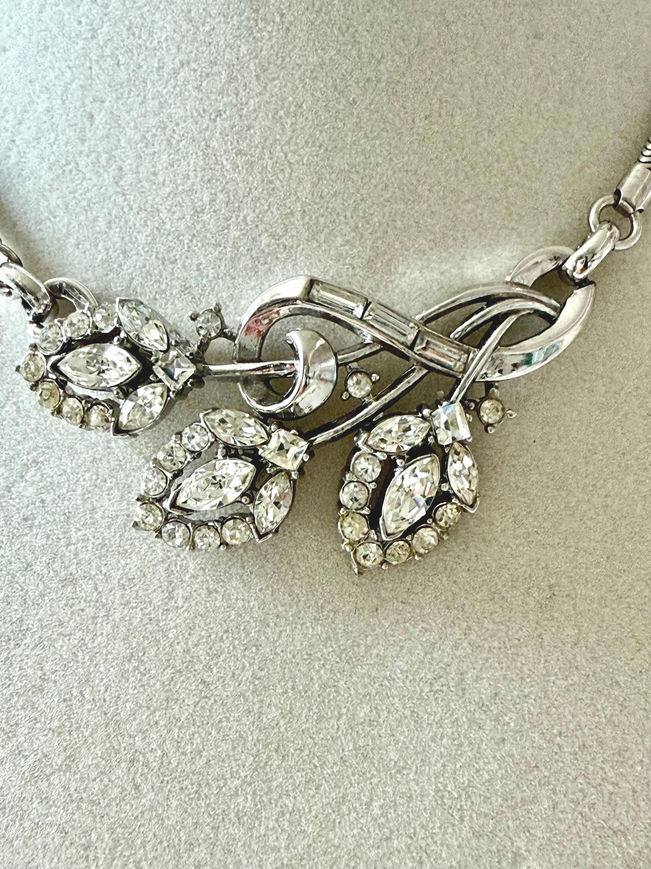 This listing is for a beautiful vintage necklace from Trifari's 1953 "Flirtation" series. Adjustable to 15 3/4", the necklace features a silver tone snake chain and a center pendant that is 2 1/2" wide and 1" high. The three flowers and winding stems are filled with sparkling clear stones, all intact. The hook clasp is secure and it is in very good condition overall. A simple but stunning necklace!
