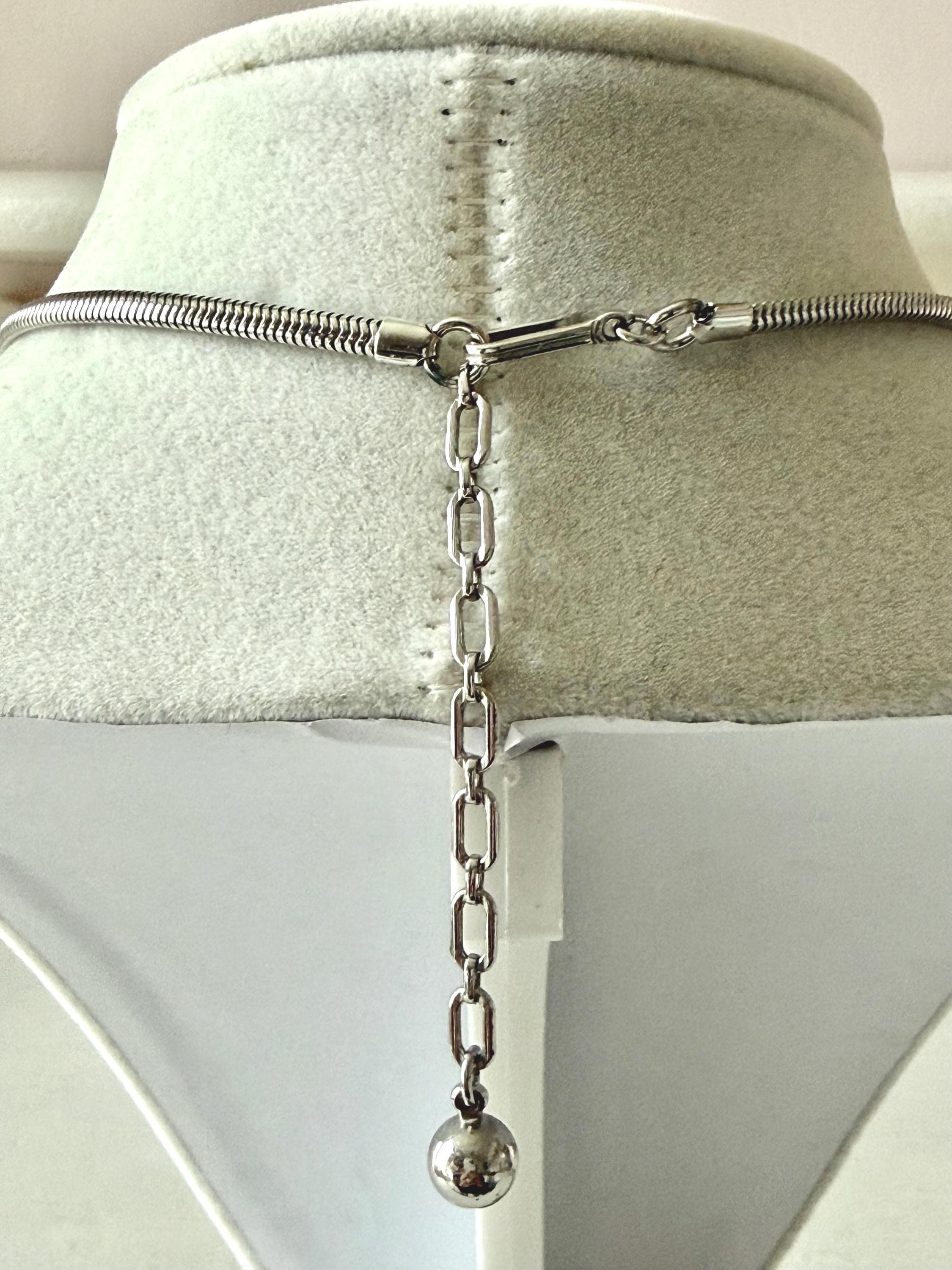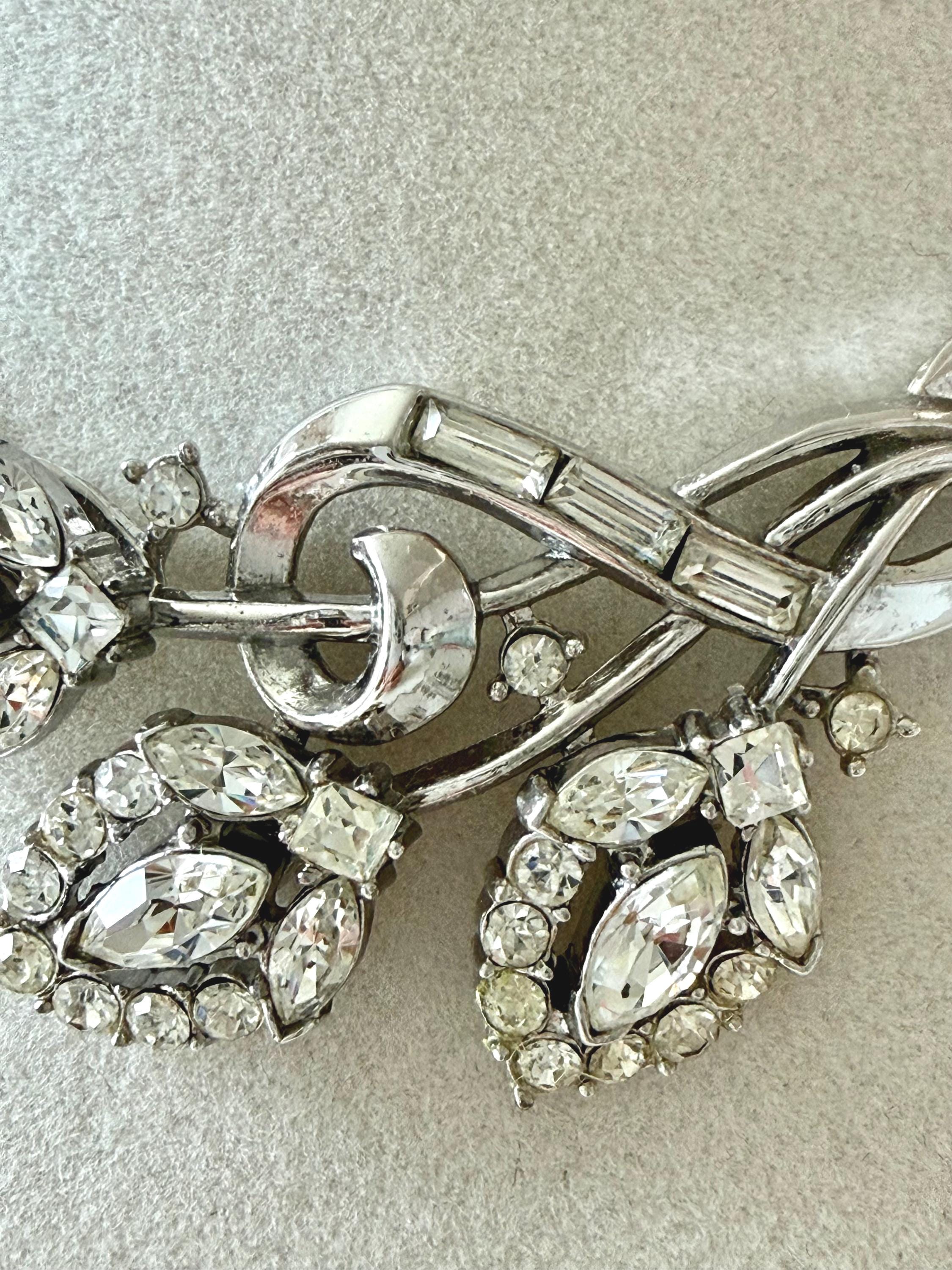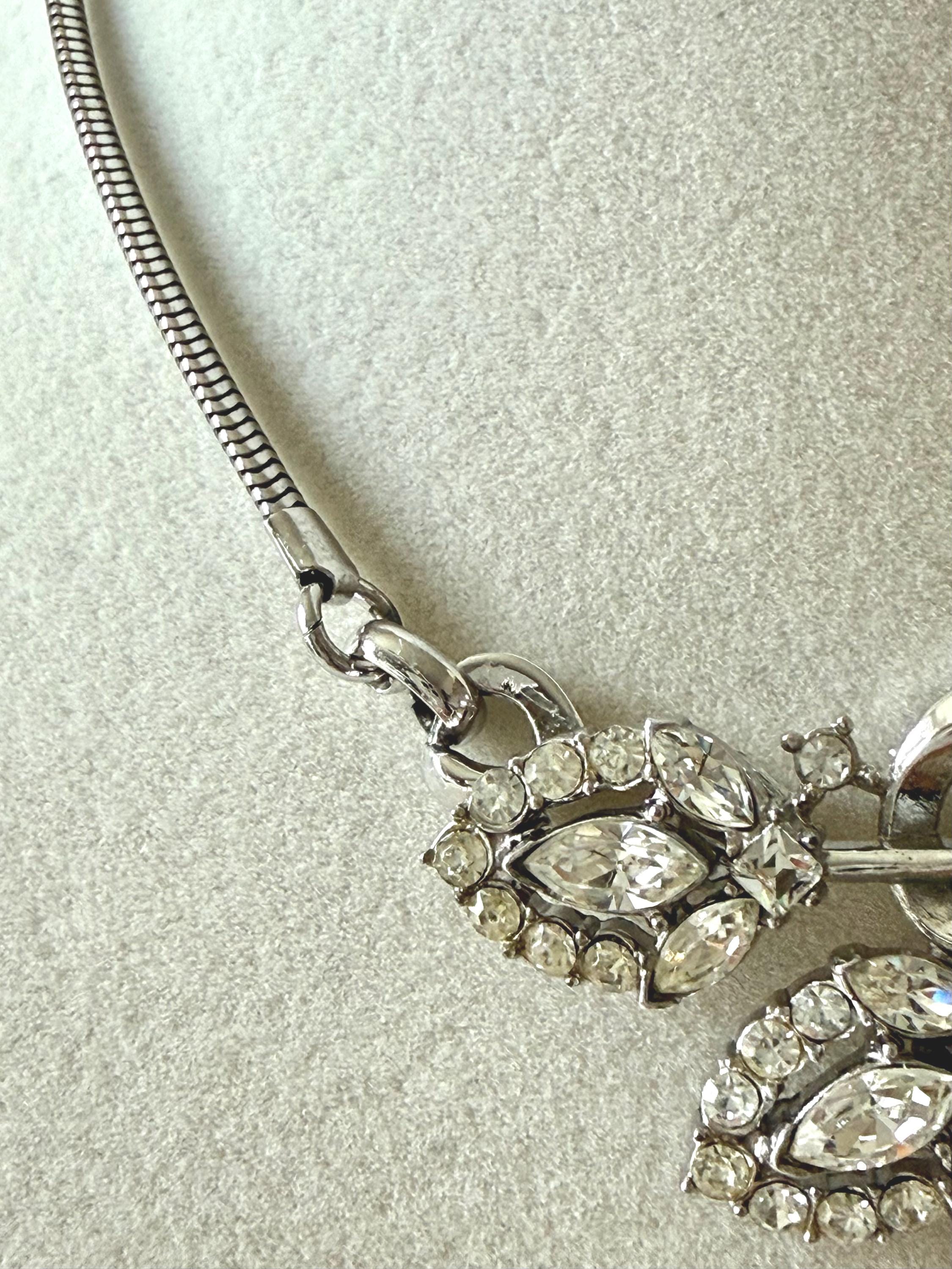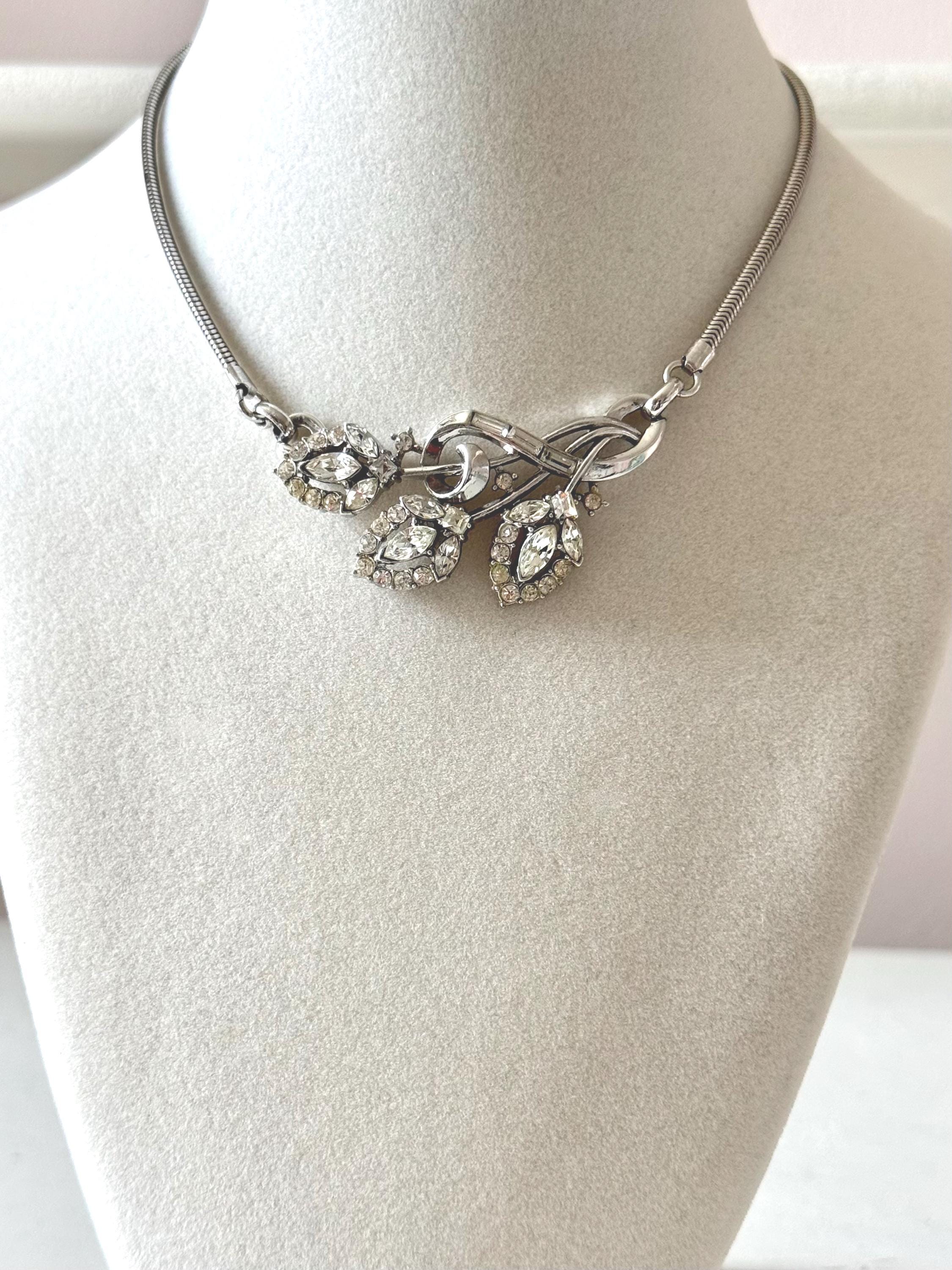 This listing is for a beautiful vintage necklace from Trifari's 1953 "Flirtation" series. Adjustable to 15 3/4", the necklace features a silver tone snake chain and a center pendant that is 2 1/2" wide and 1" high. The three flowers and winding stems are filled with sparkling clear stones, all intact. The hook clasp is secure and it is in very good condition overall. A simple but stunning necklace!