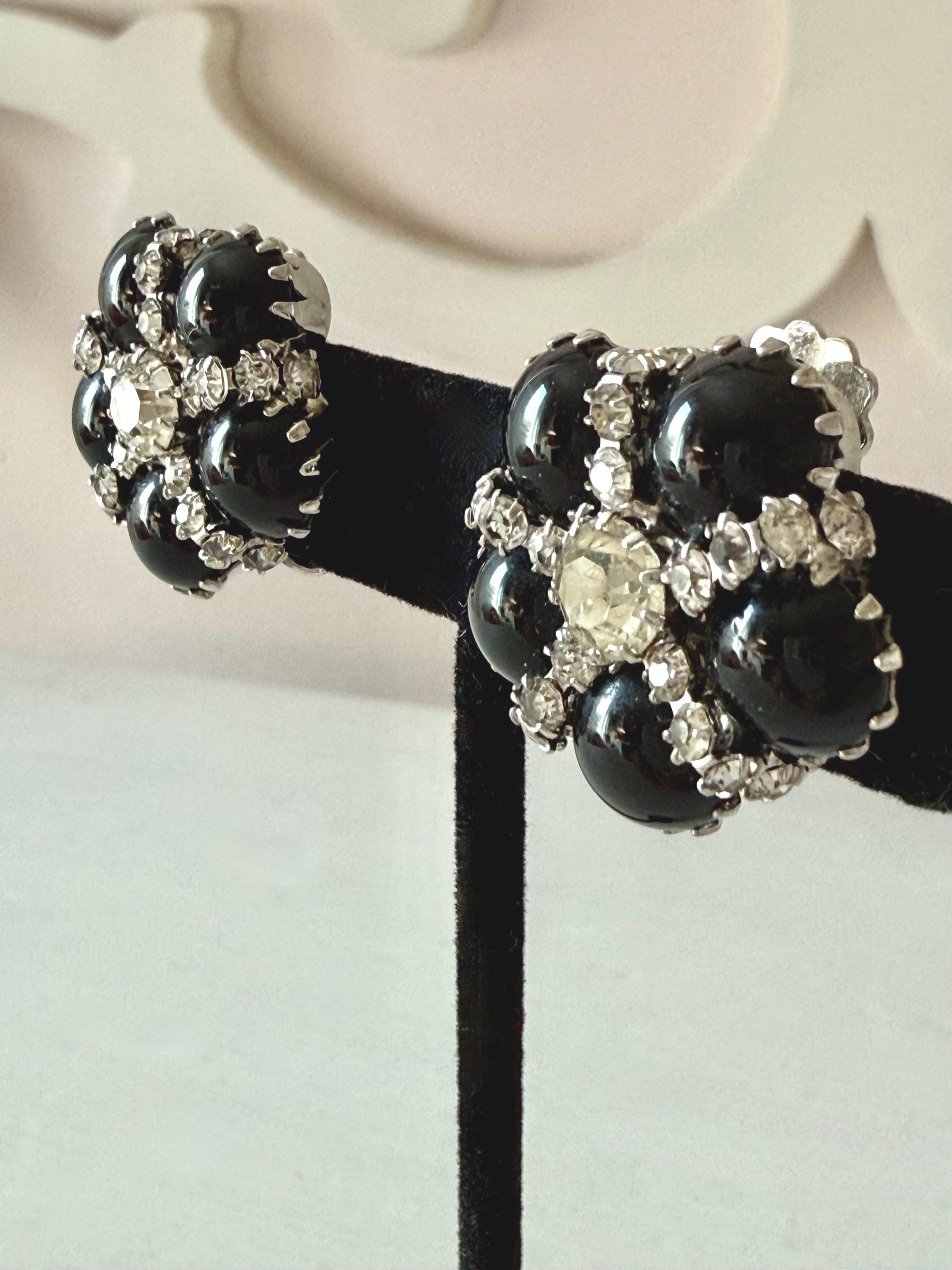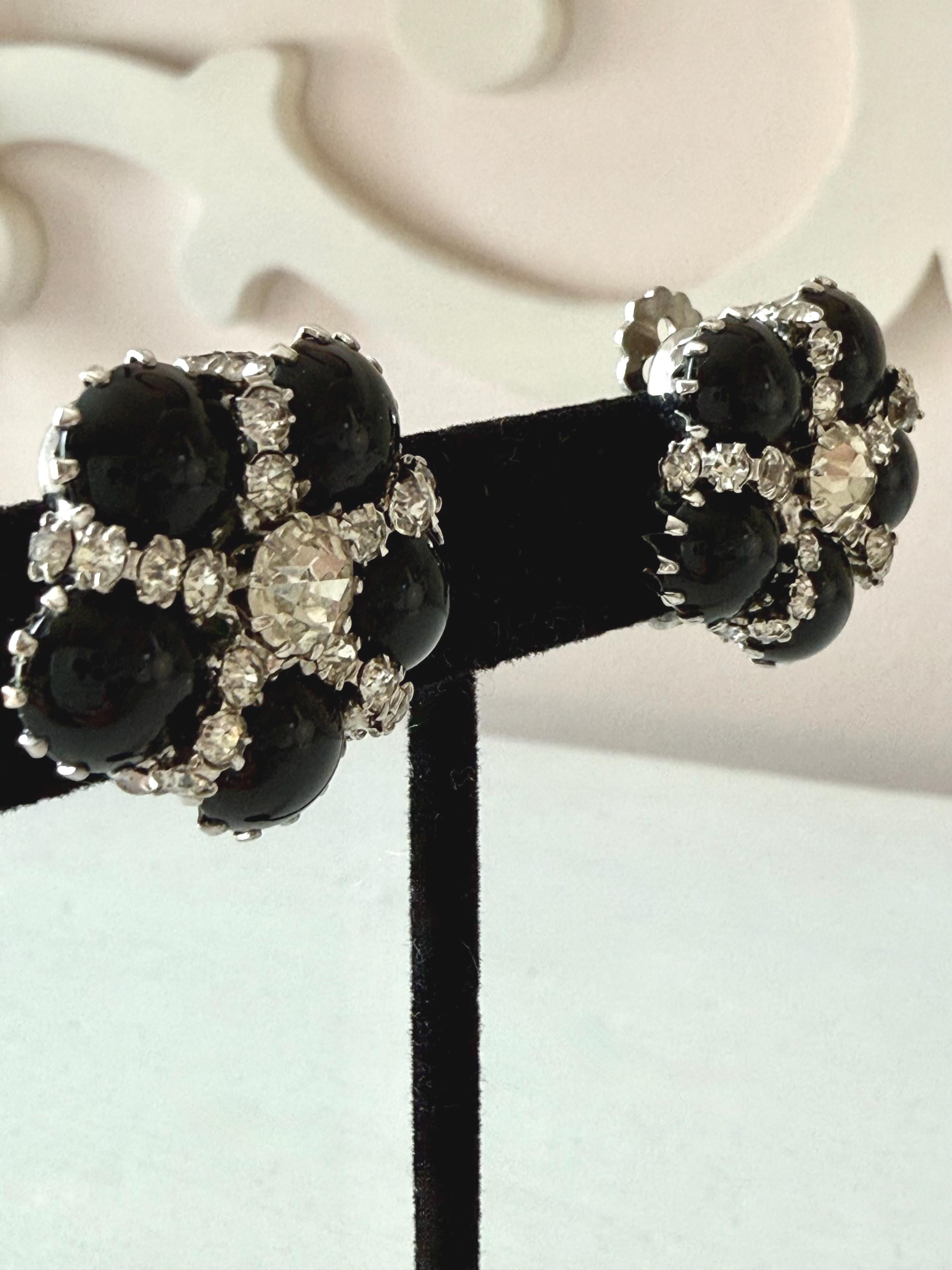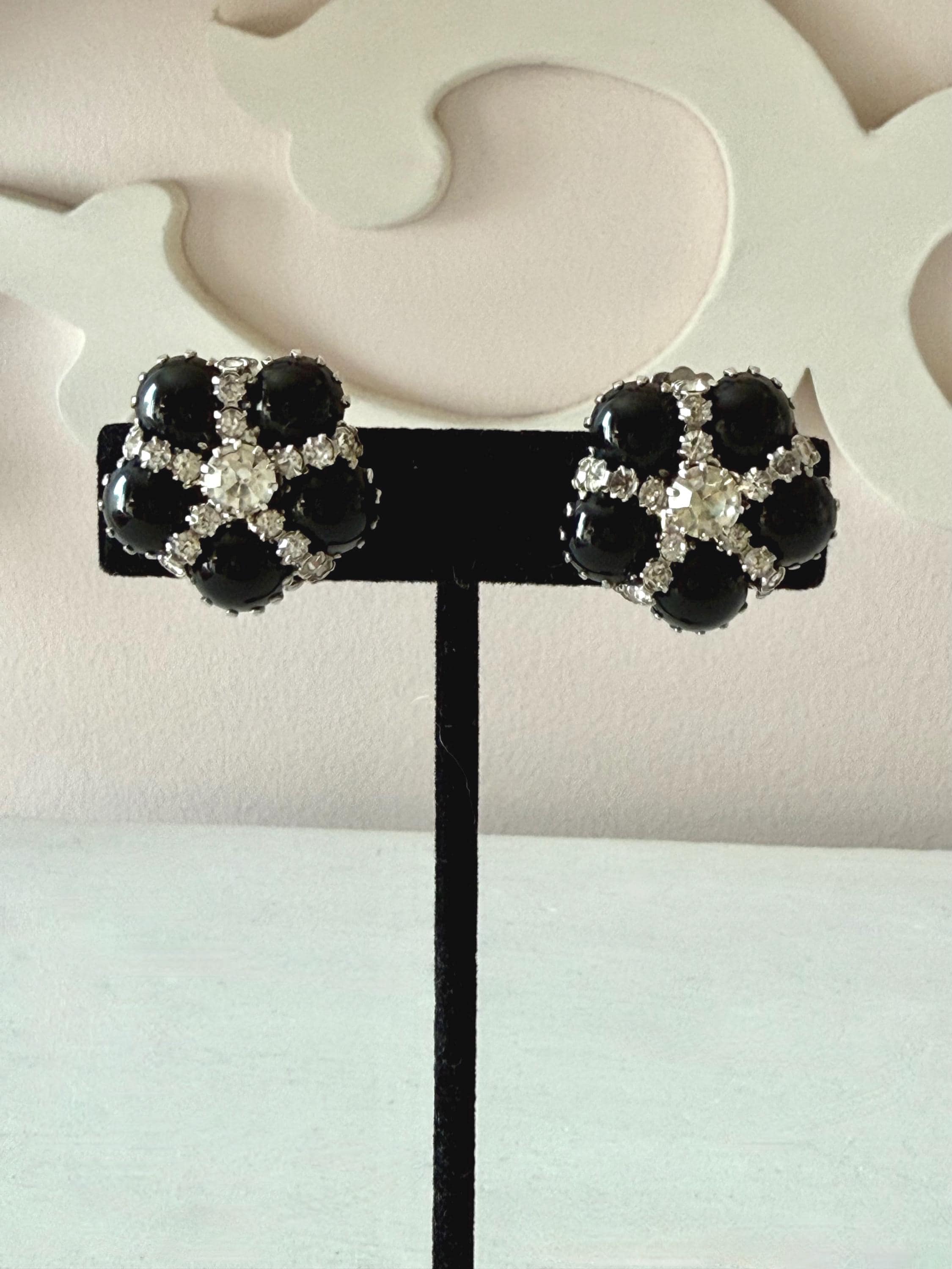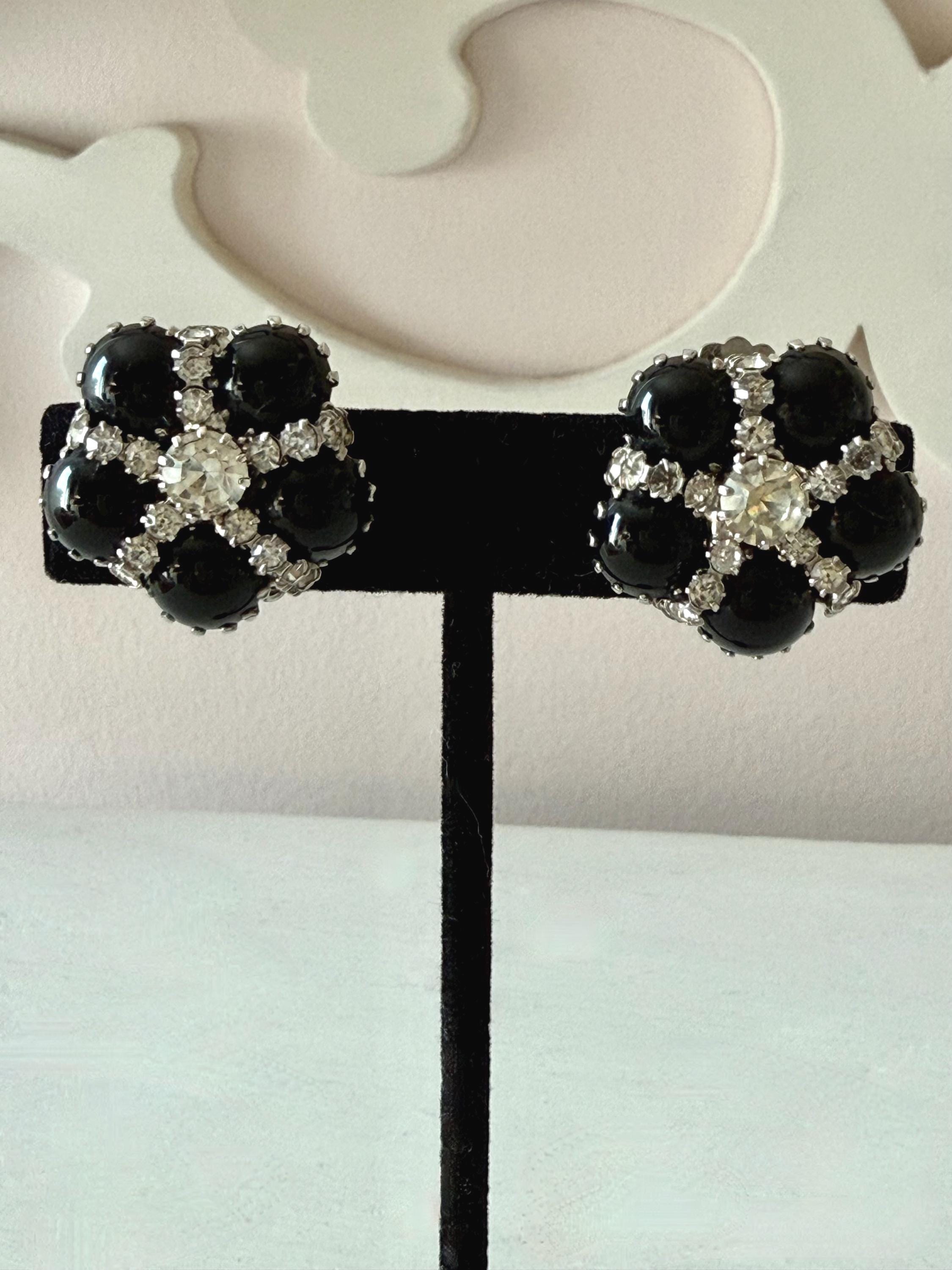 This listing is for a beautiful pair of earrings by Albert Weiss. Measuring 7/8" in diameter, the silver tone earring features five shiny black glass cabochons set between rows of sparkling clear rhinestones leading to a large center stone. The clip backs are secure and comfortable and they are, overall, in very good condition. This is a classic pair of earrings that you will love wearing!