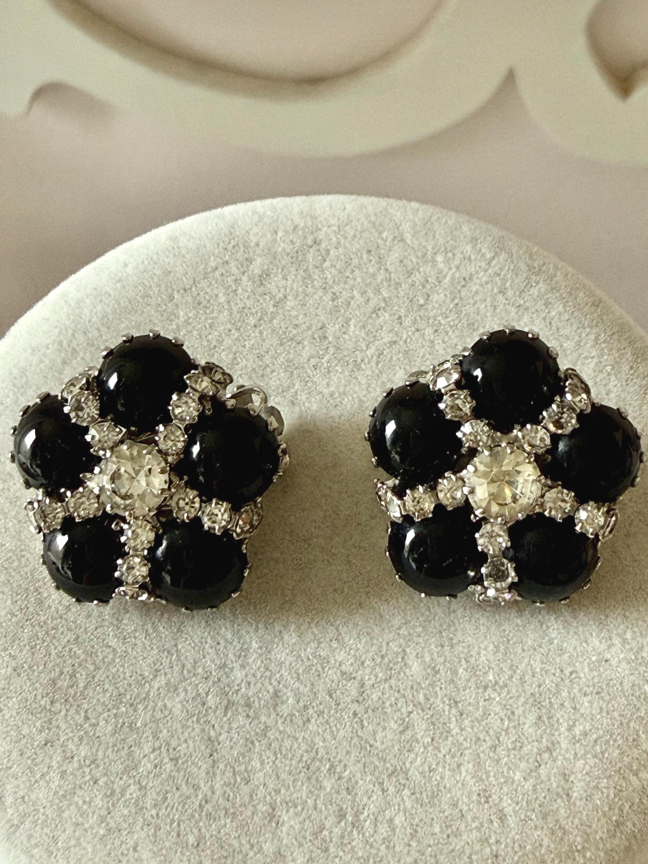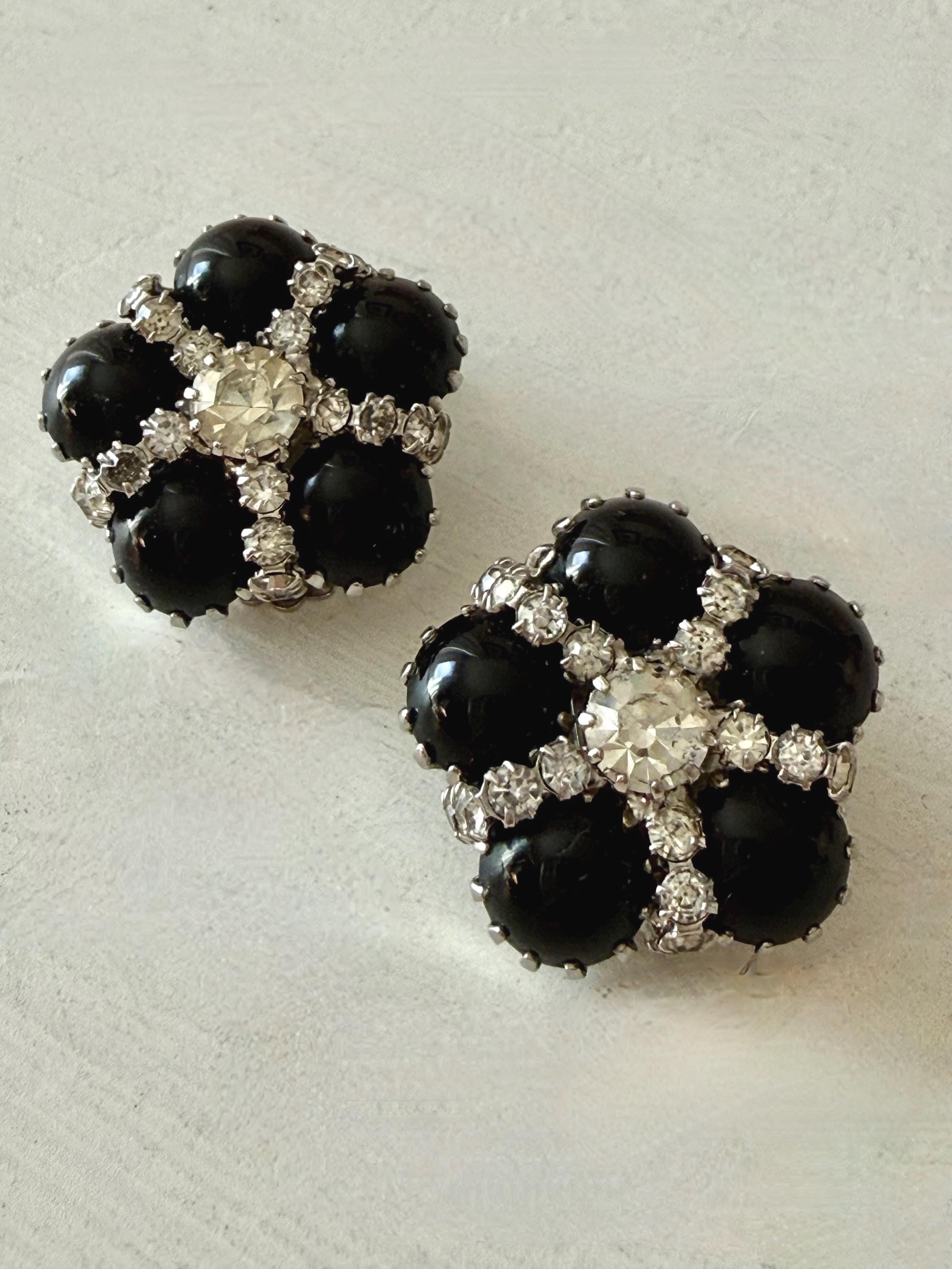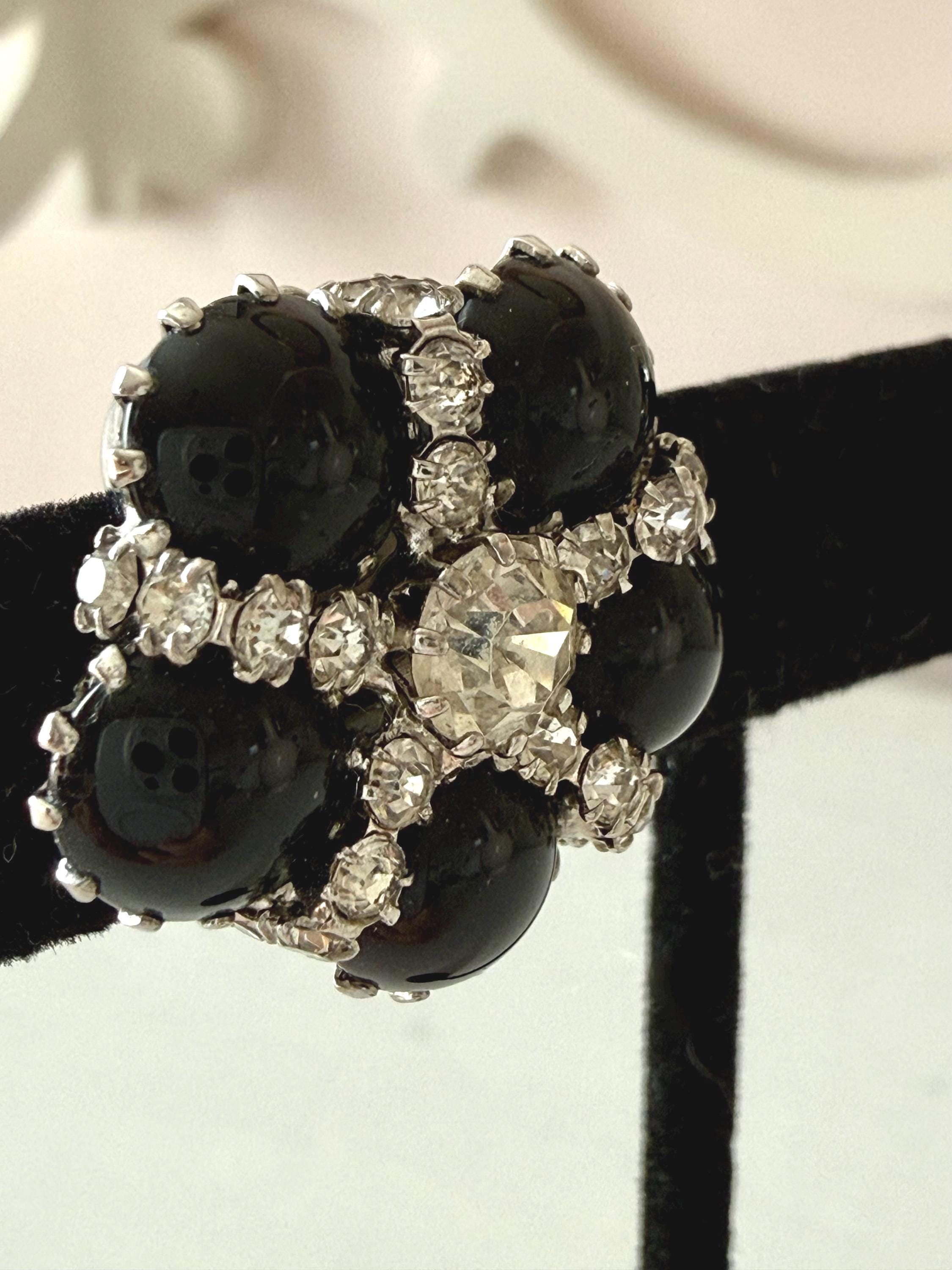 This listing is for a beautiful pair of earrings by Albert Weiss. Measuring 7/8" in diameter, the silver tone earring features five shiny black glass cabochons set between rows of sparkling clear rhinestones leading to a large center stone. The clip backs are secure and comfortable and they are, overall, in very good condition. This is a classic pair of earrings that you will love wearing!