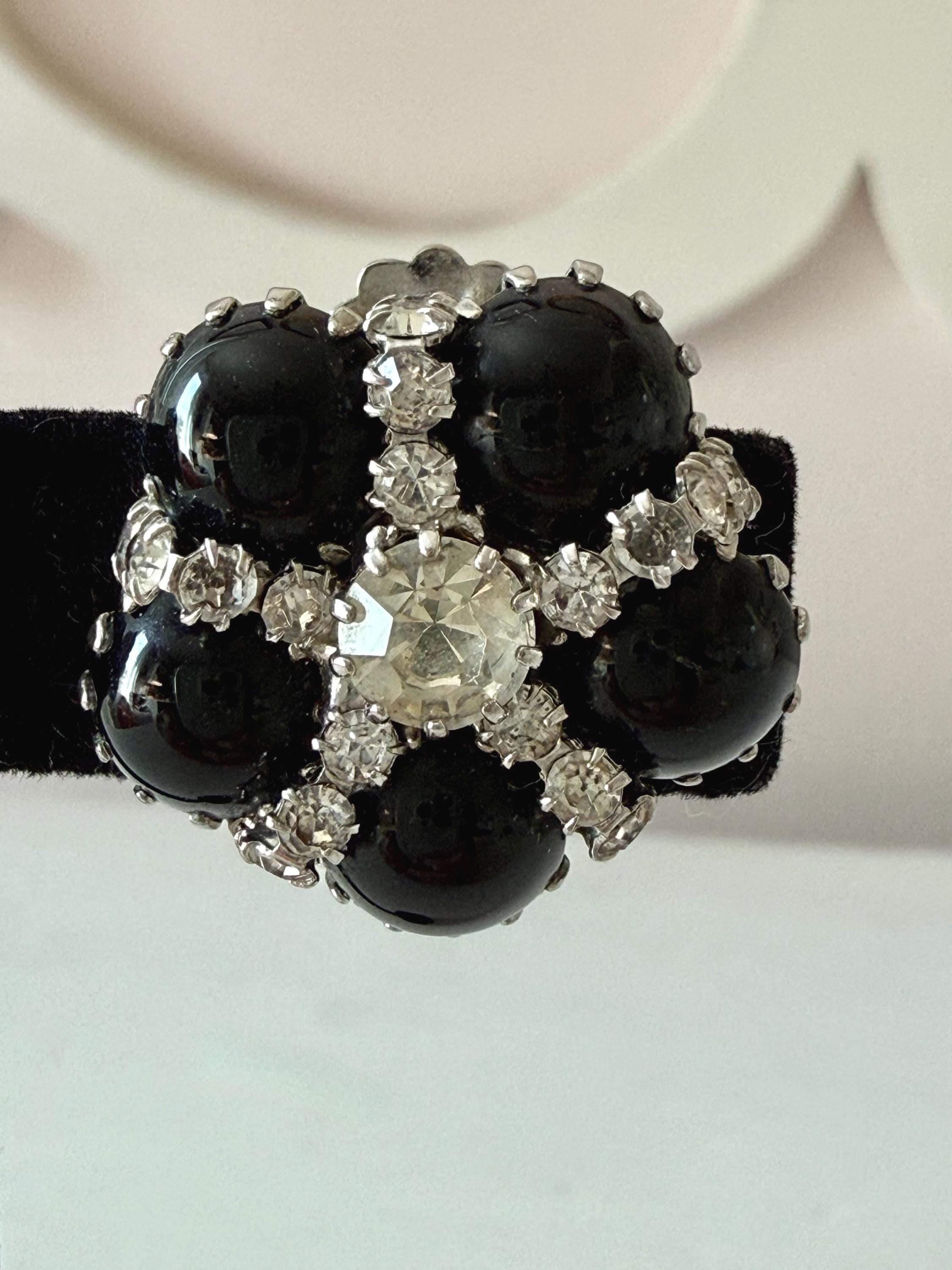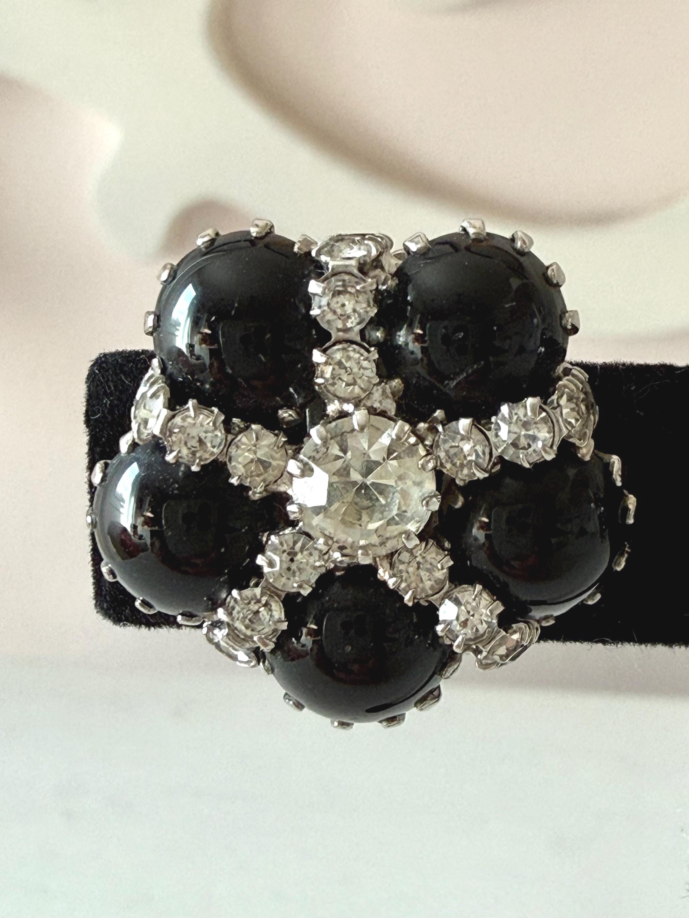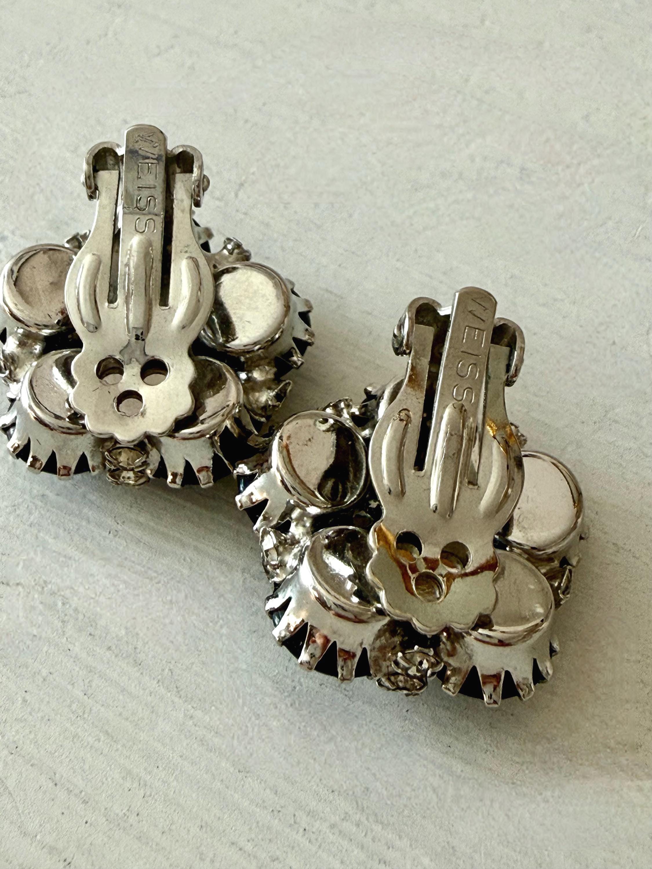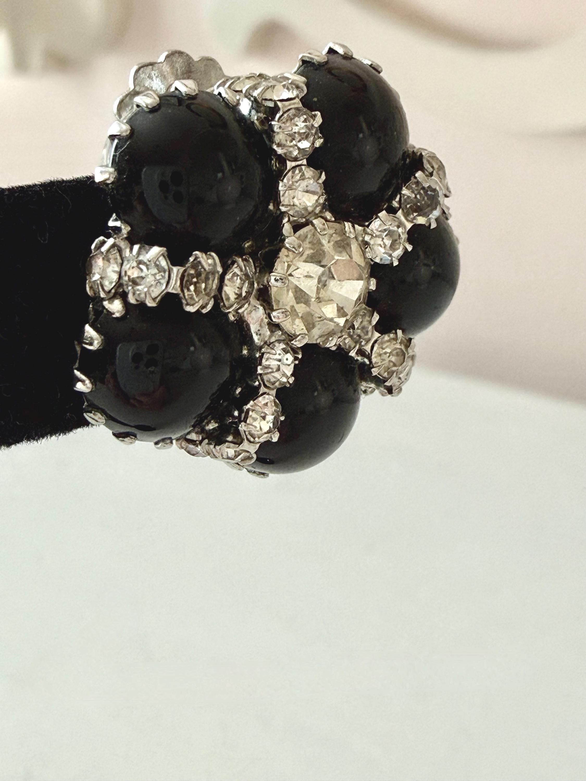 This listing is for a beautiful pair of earrings by Albert Weiss. Measuring 7/8" in diameter, the silver tone earring features five shiny black glass cabochons set between rows of sparkling clear rhinestones leading to a large center stone. The clip backs are secure and comfortable and they are, overall, in very good condition. This is a classic pair of earrings that you will love wearing!