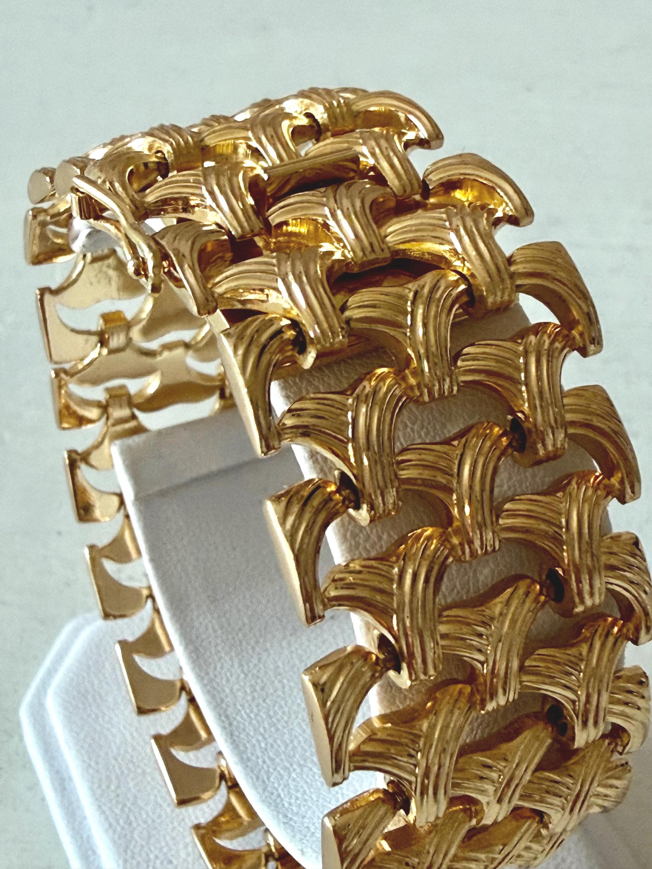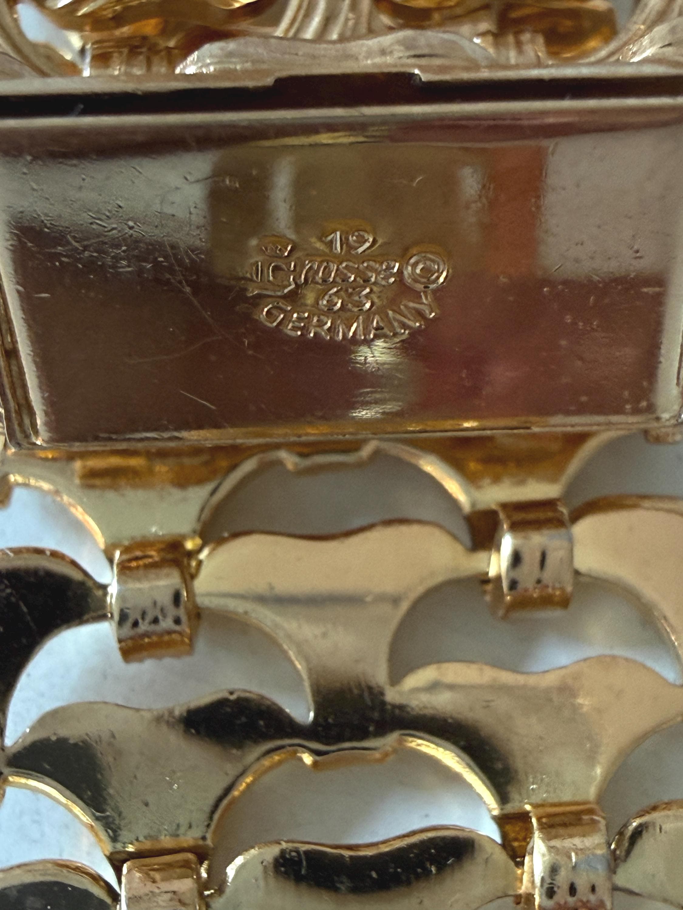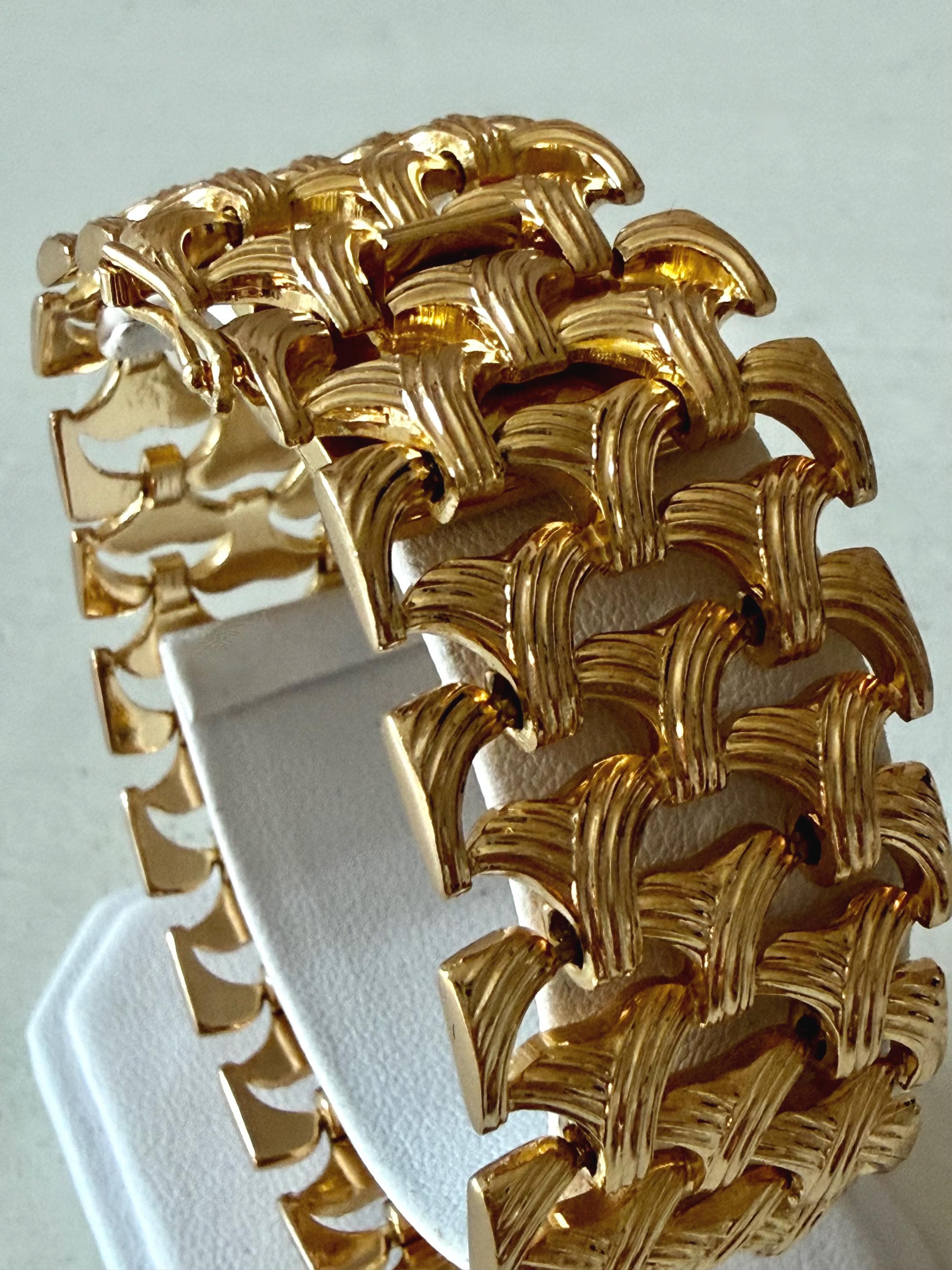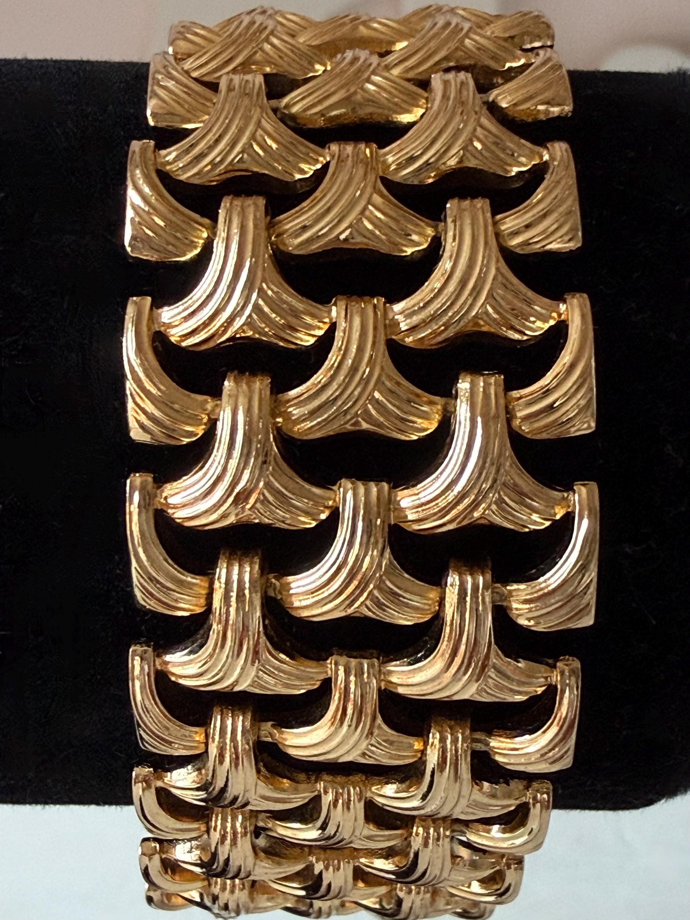 This listing is for a gorgeous vintage from 1963 from Grosse Germany. Measuring 7 1/2" long and 1" wide, the gold tone bracelet features a textured basketweave design. The clasp is secure and the metal is very brightly polished. Overall, it is in excellent, like new, condition. A beautiful example of why Grosse jewelry is so valued after 63 years!
