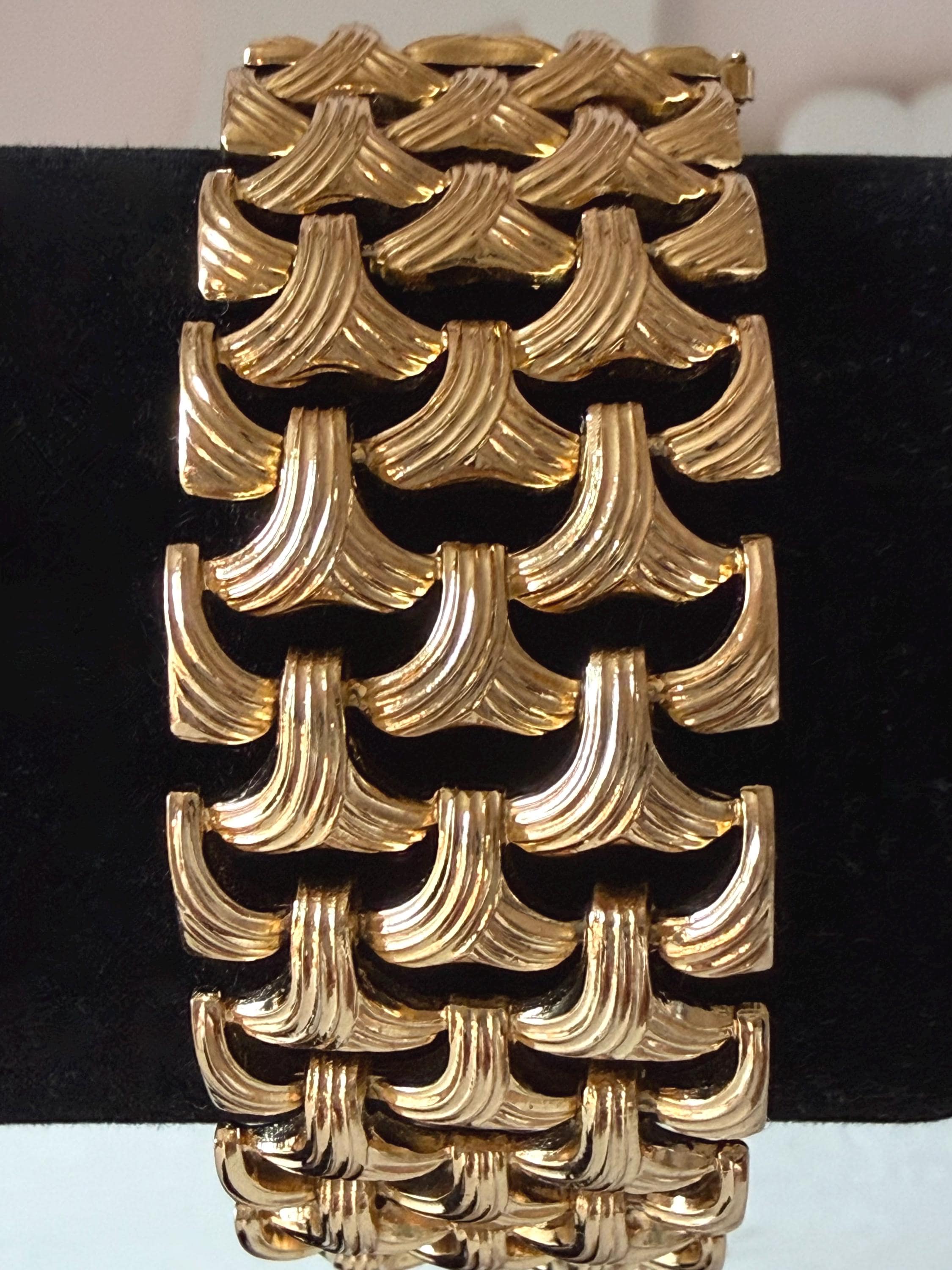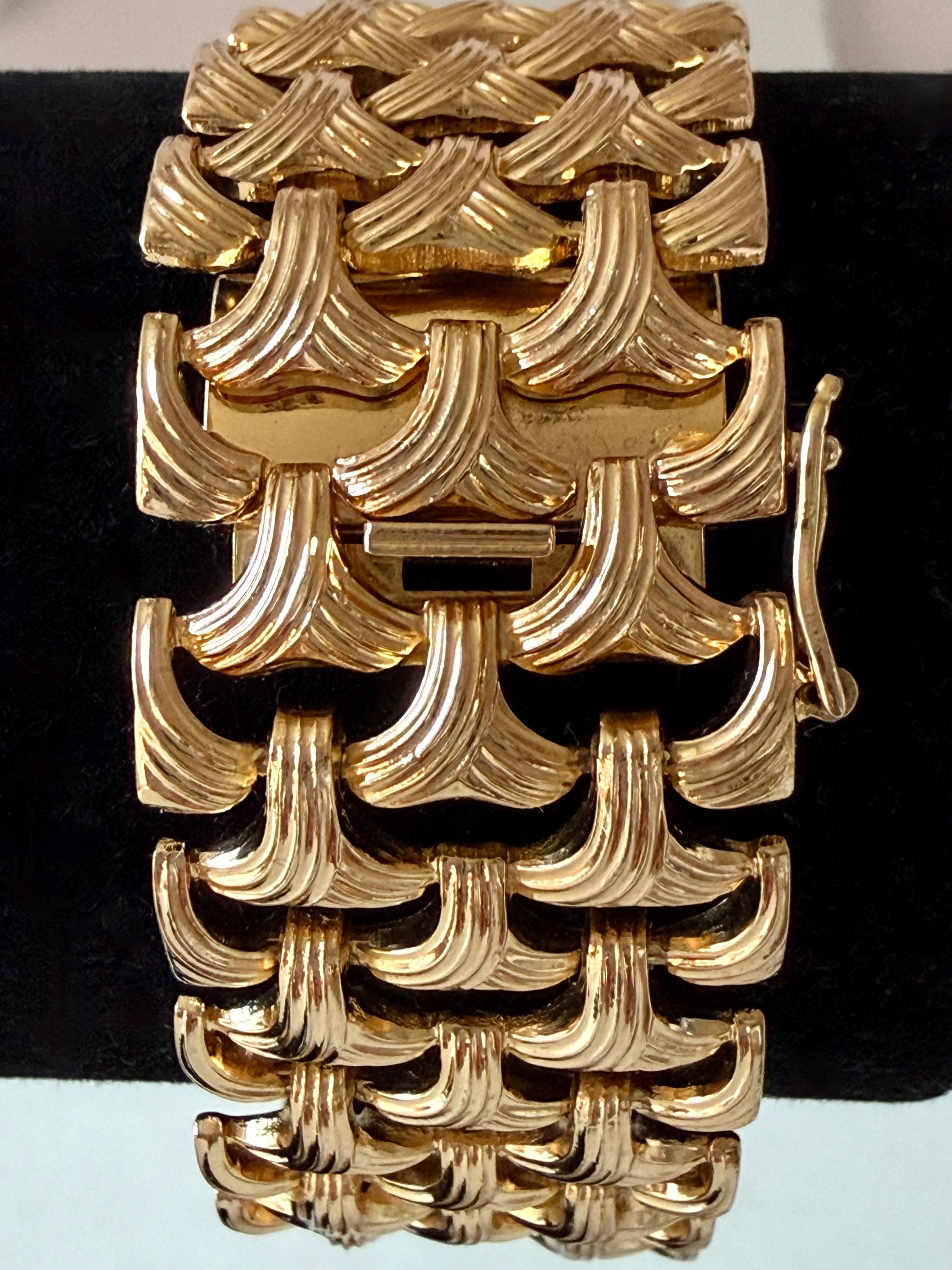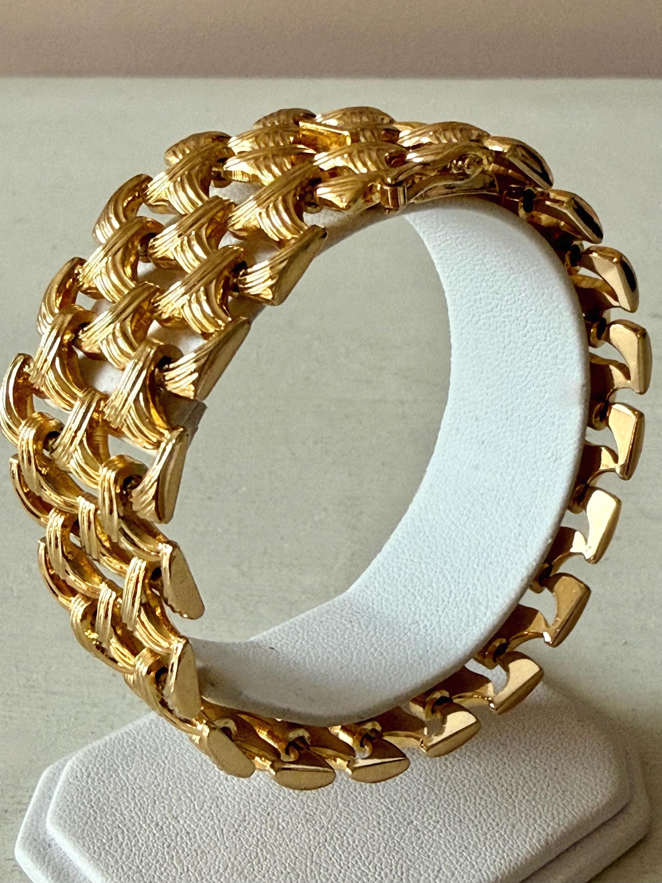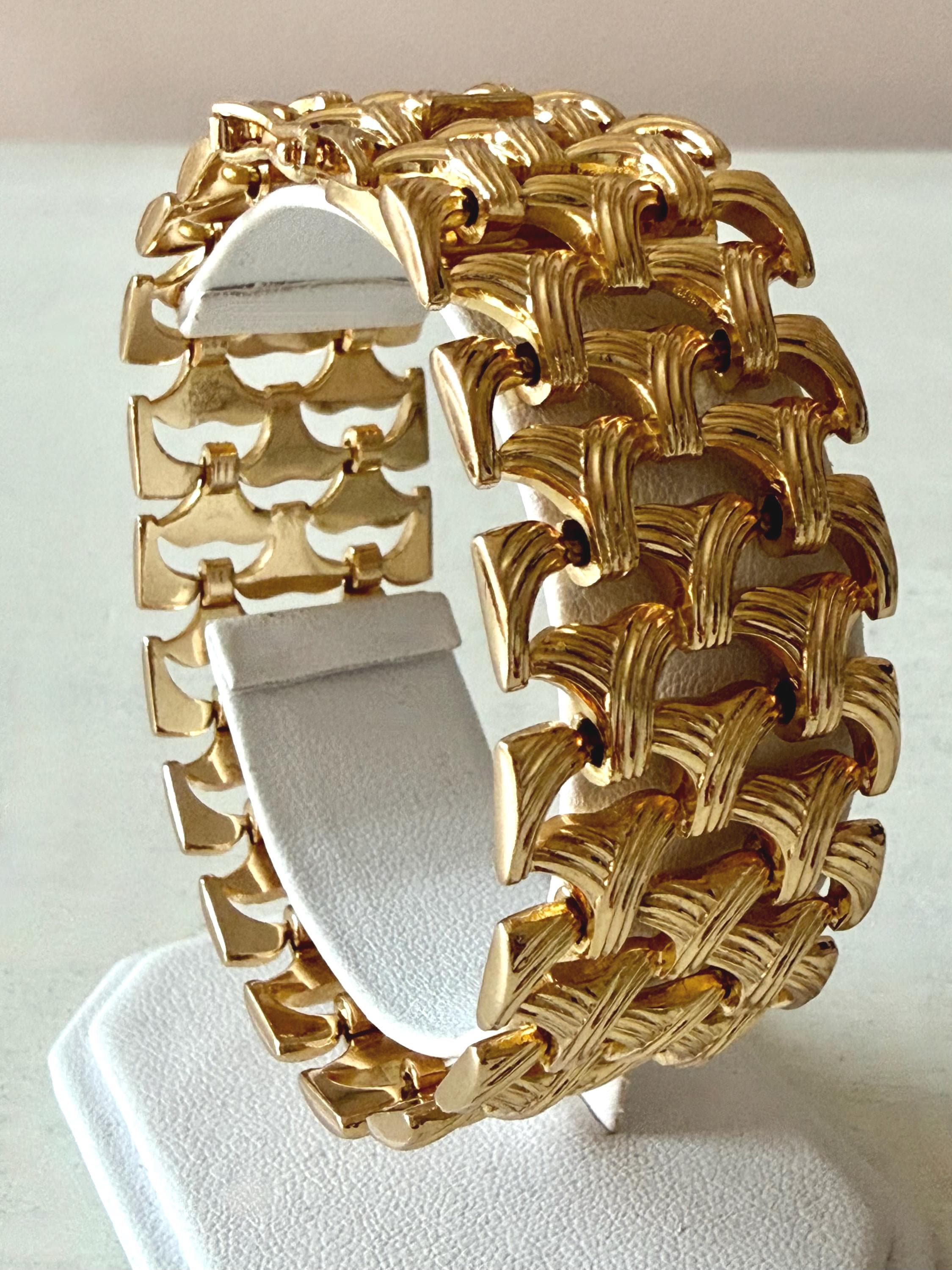 This listing is for a gorgeous vintage from 1963 from Grosse Germany. Measuring 7 1/2" long and 1" wide, the gold tone bracelet features a textured basketweave design. The clasp is secure and the metal is very brightly polished. Overall, it is in excellent, like new, condition. A beautiful example of why Grosse jewelry is so valued after 63 years!