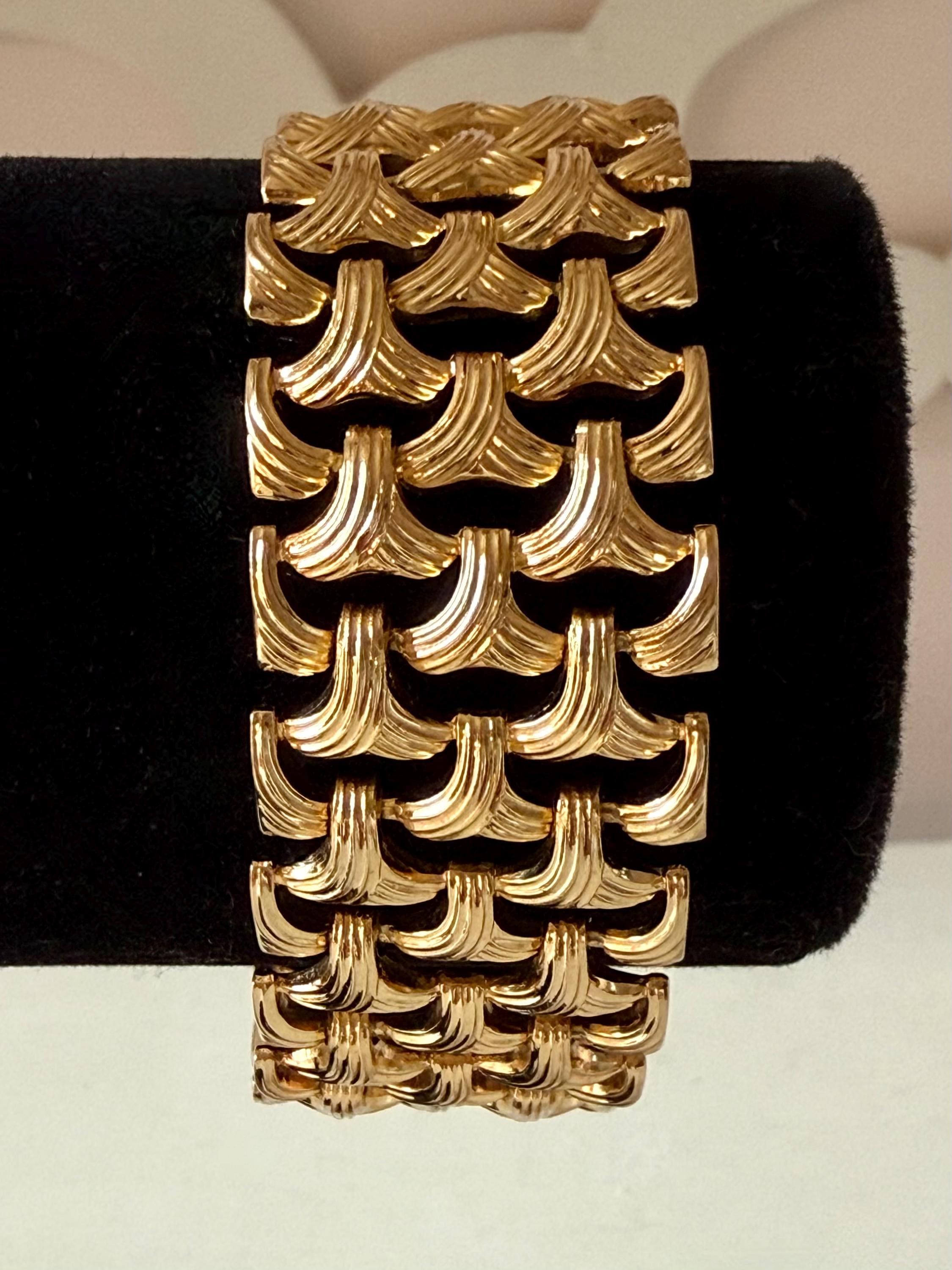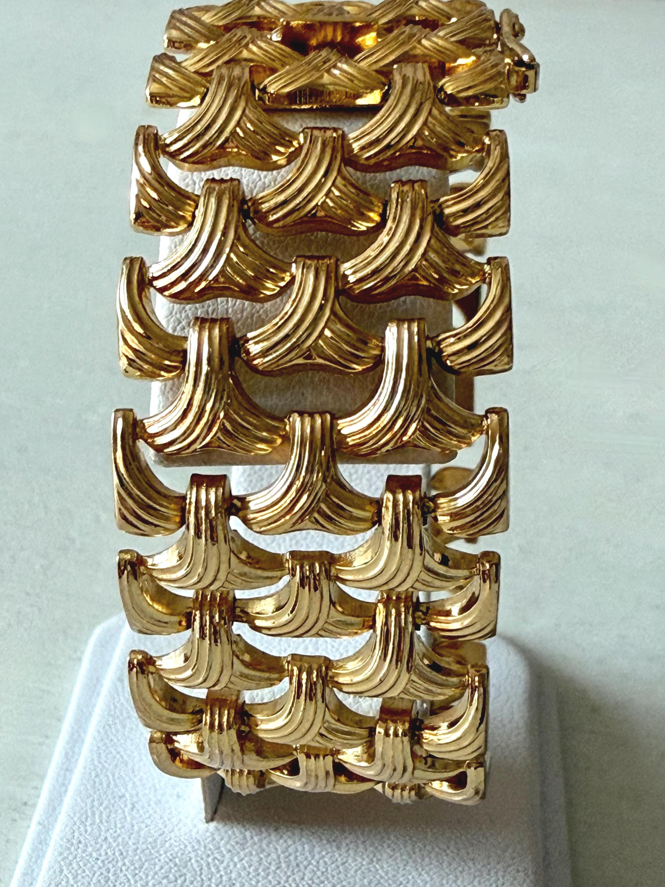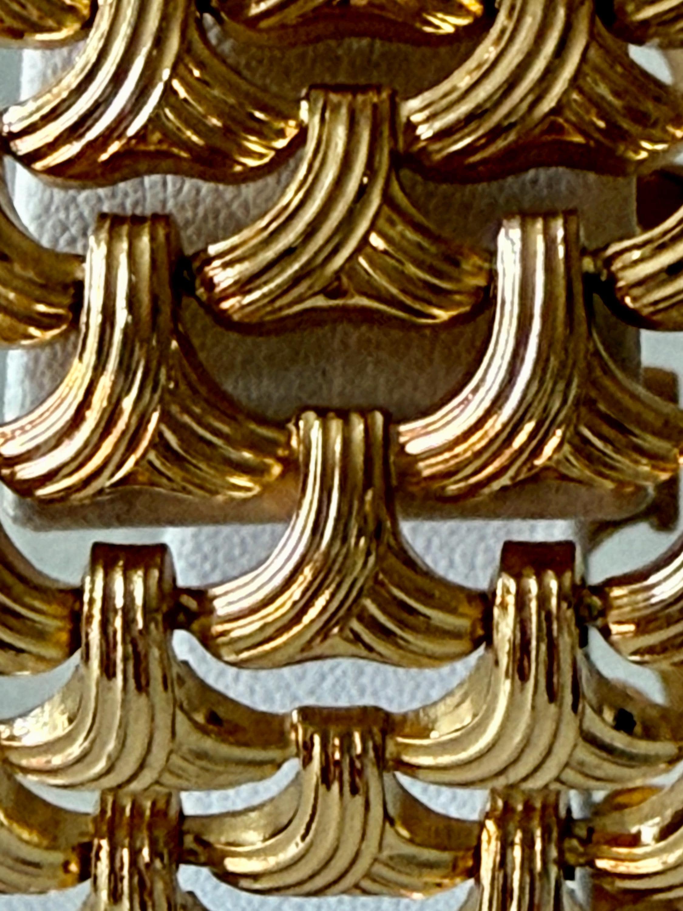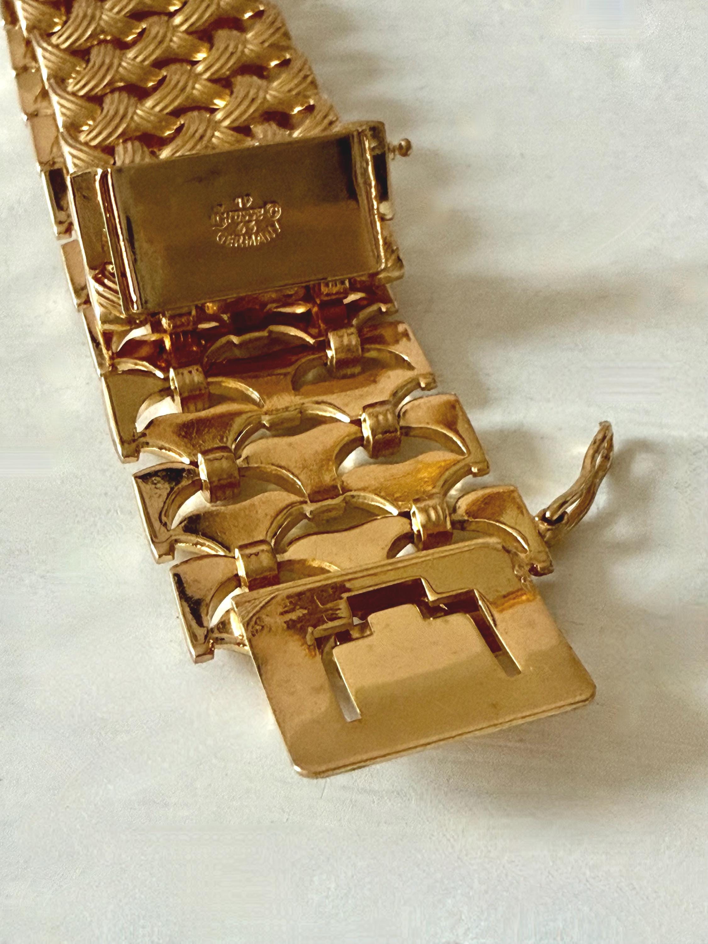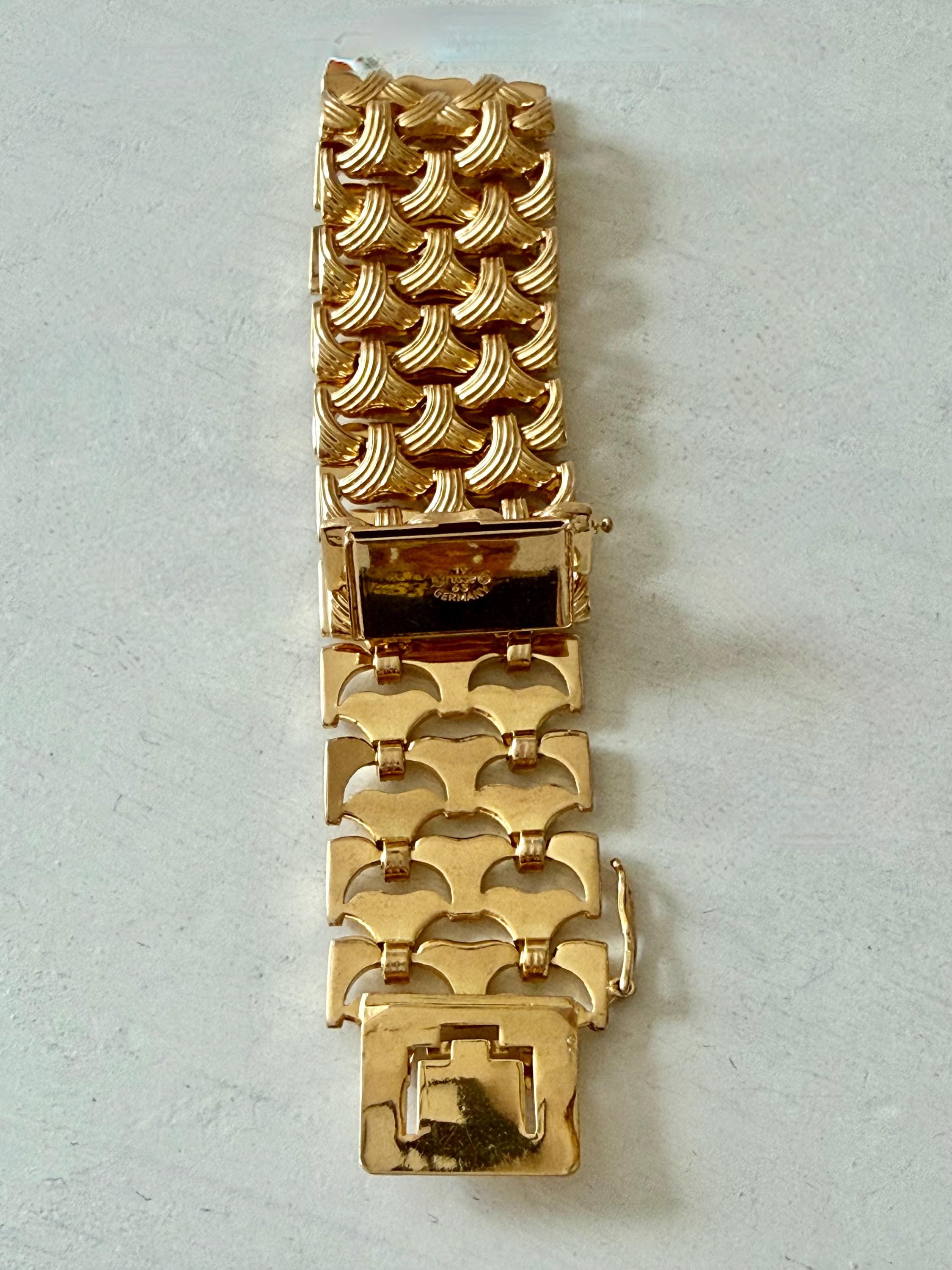 This listing is for a gorgeous vintage from 1963 from Grosse Germany. Measuring 7 1/2" long and 1" wide, the gold tone bracelet features a textured basketweave design. The clasp is secure and the metal is very brightly polished. Overall, it is in excellent, like new, condition. A beautiful example of why Grosse jewelry is so valued after 63 years!