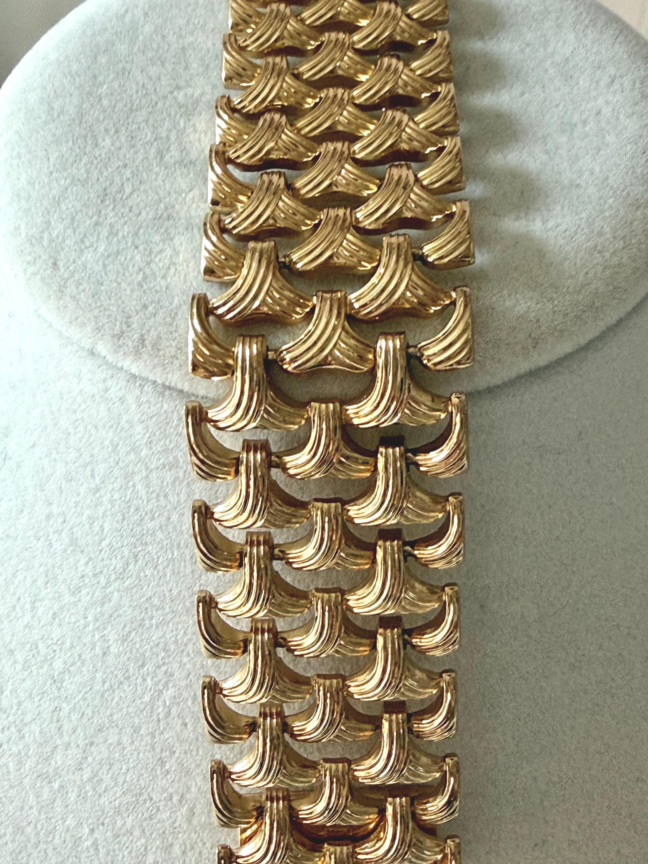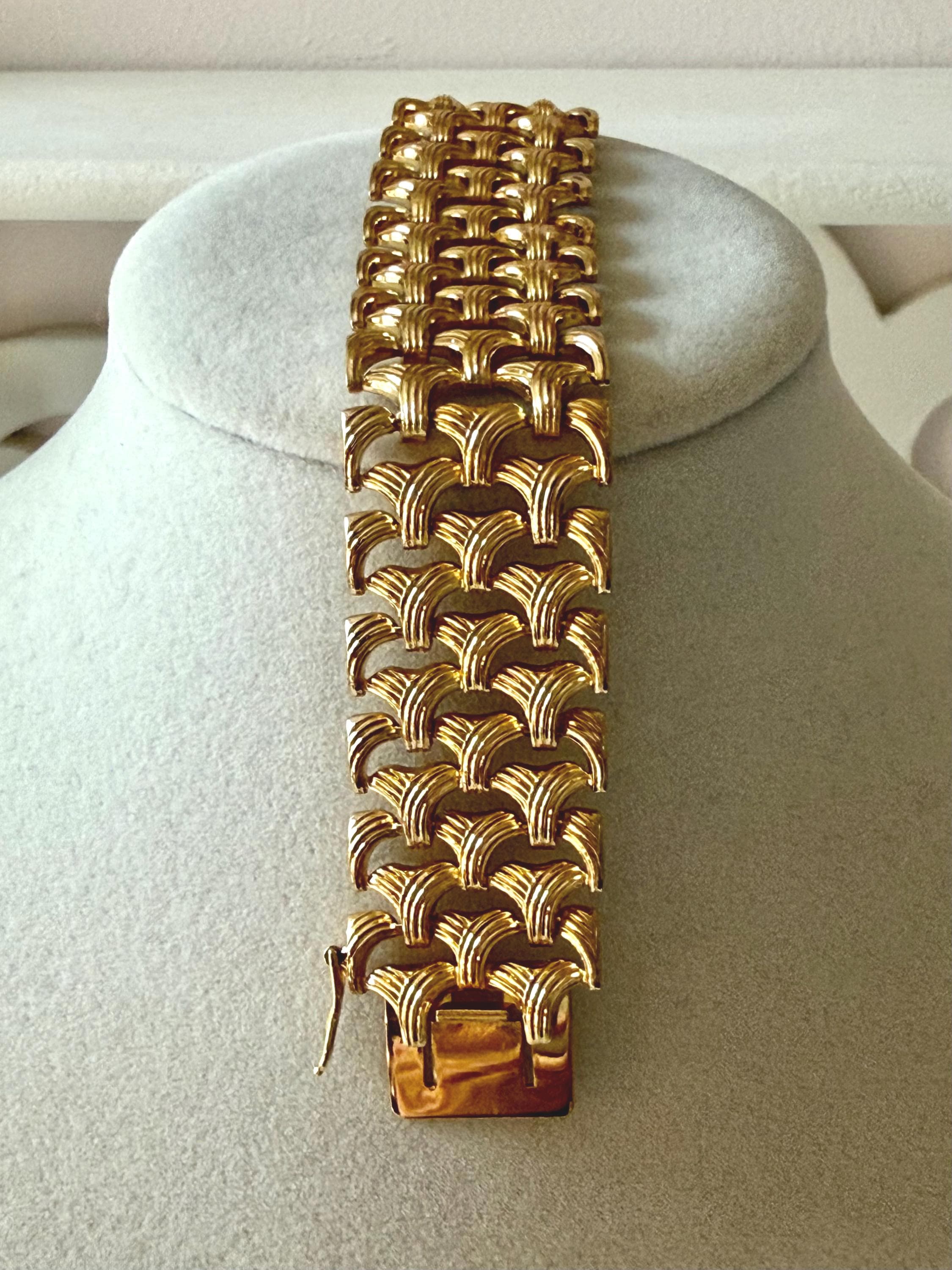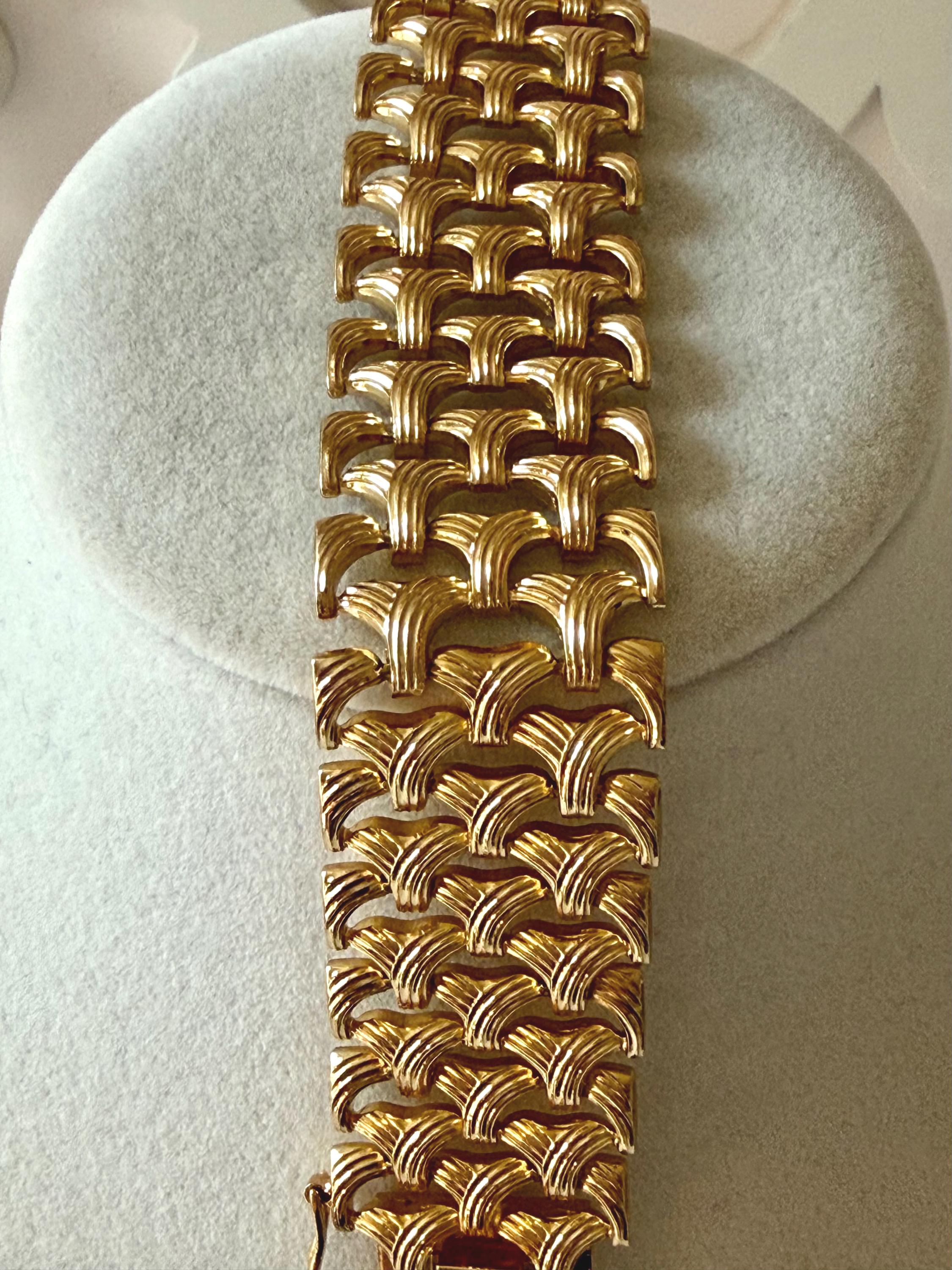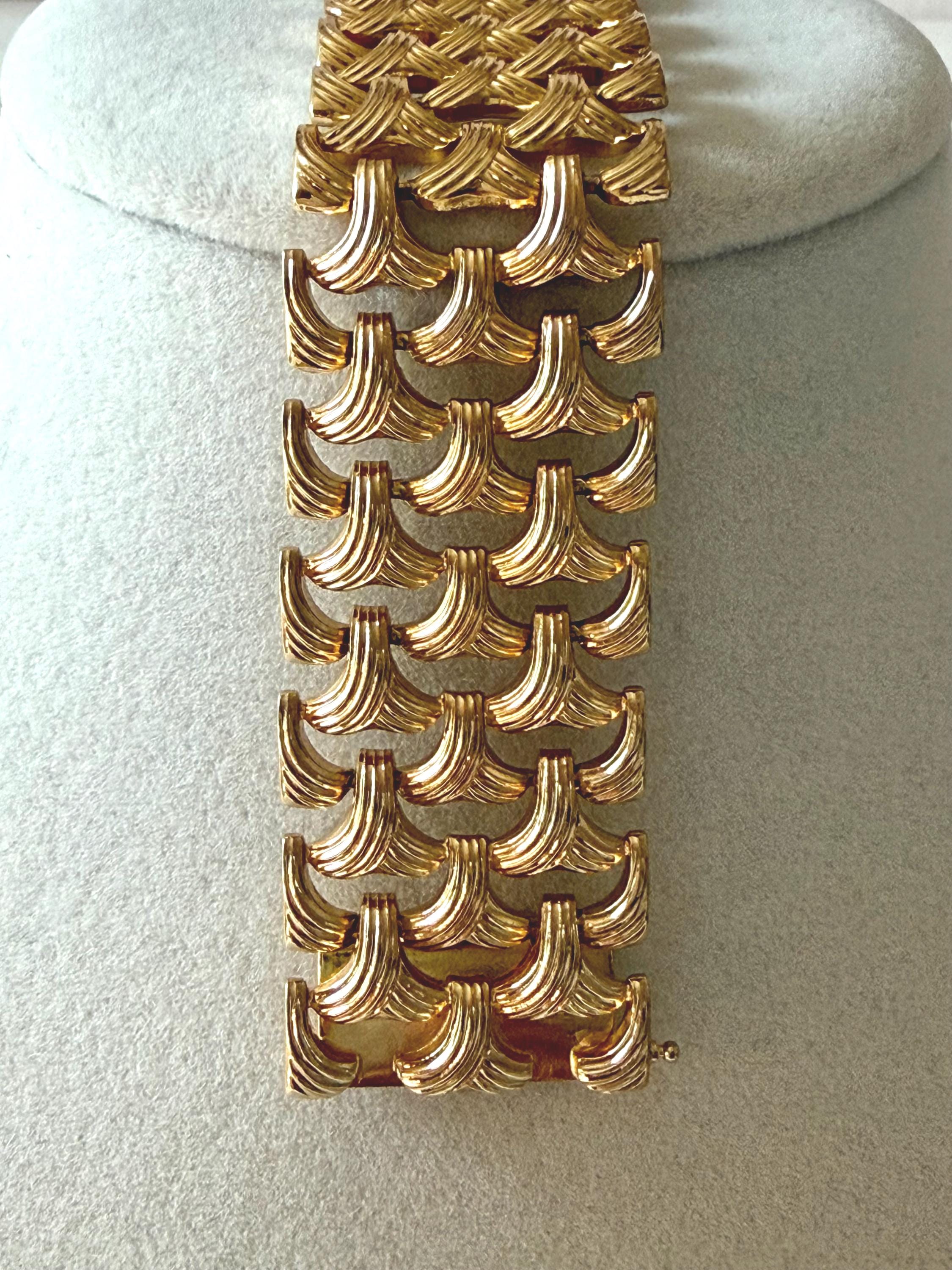 This listing is for a gorgeous vintage from 1963 from Grosse Germany. Measuring 7 1/2" long and 1" wide, the gold tone bracelet features a textured basketweave design. The clasp is secure and the metal is very brightly polished. Overall, it is in excellent, like new, condition. A beautiful example of why Grosse jewelry is so valued after 63 years!